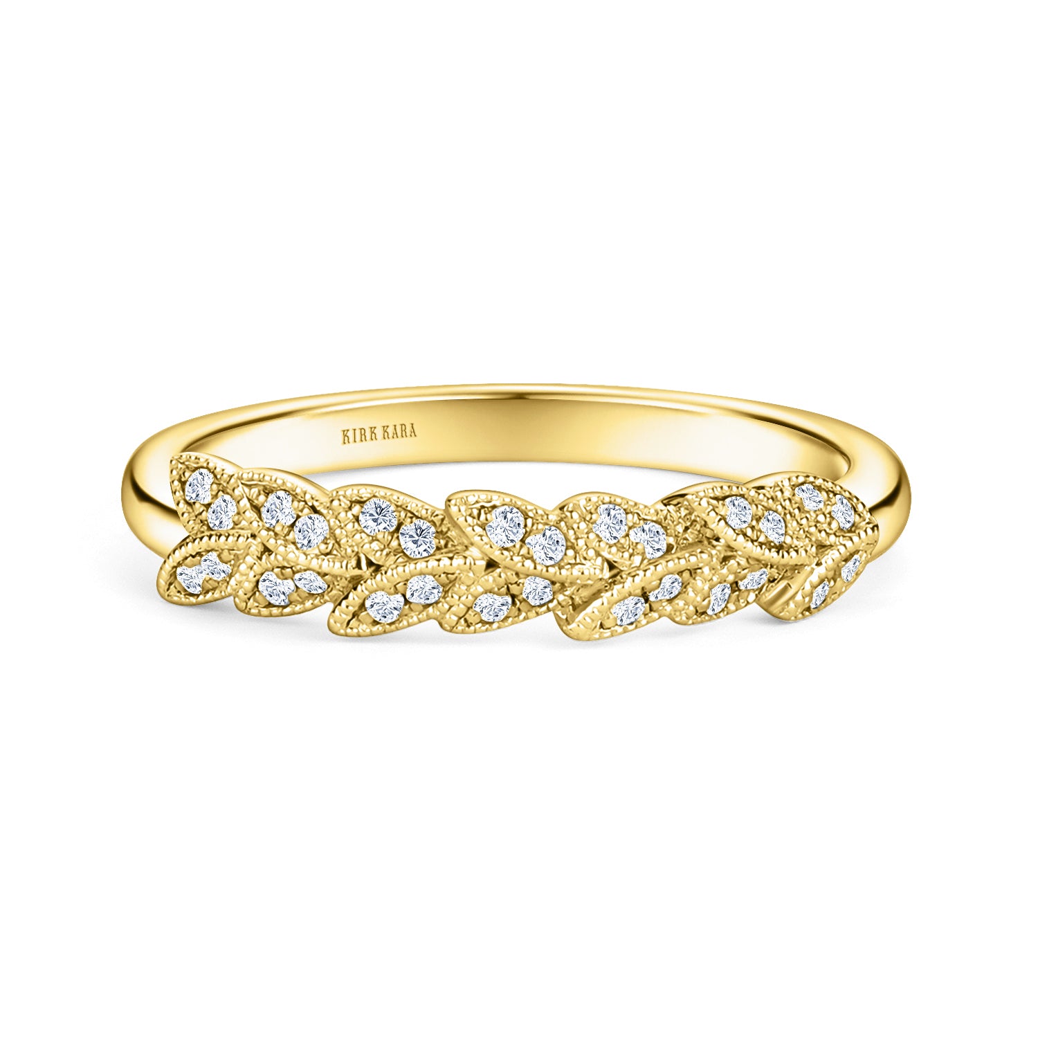 This nature-inspired design with floral details is from the Dahlia collection. It features 1/15 ctw of diamonds and signature handcrafted milgrain edging. Both lab grown and natural diamonds are available for this band.