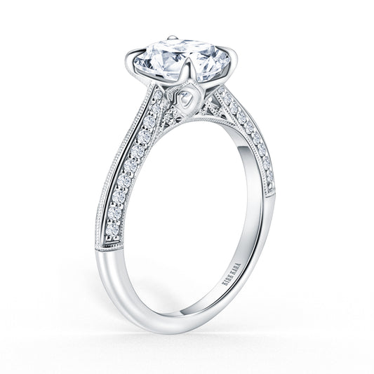 This timeless classic is a knife edge engagement ring from the Stella. It features 1/4 ctw of diamonds. The signature handcrafted details include signature filigree and milgrain edging. Both lab grown and natural diamonds are available for this setting. Ring as shown fits a 1.50 carat oval cut stone. All center stone sizes and shapes are possible.