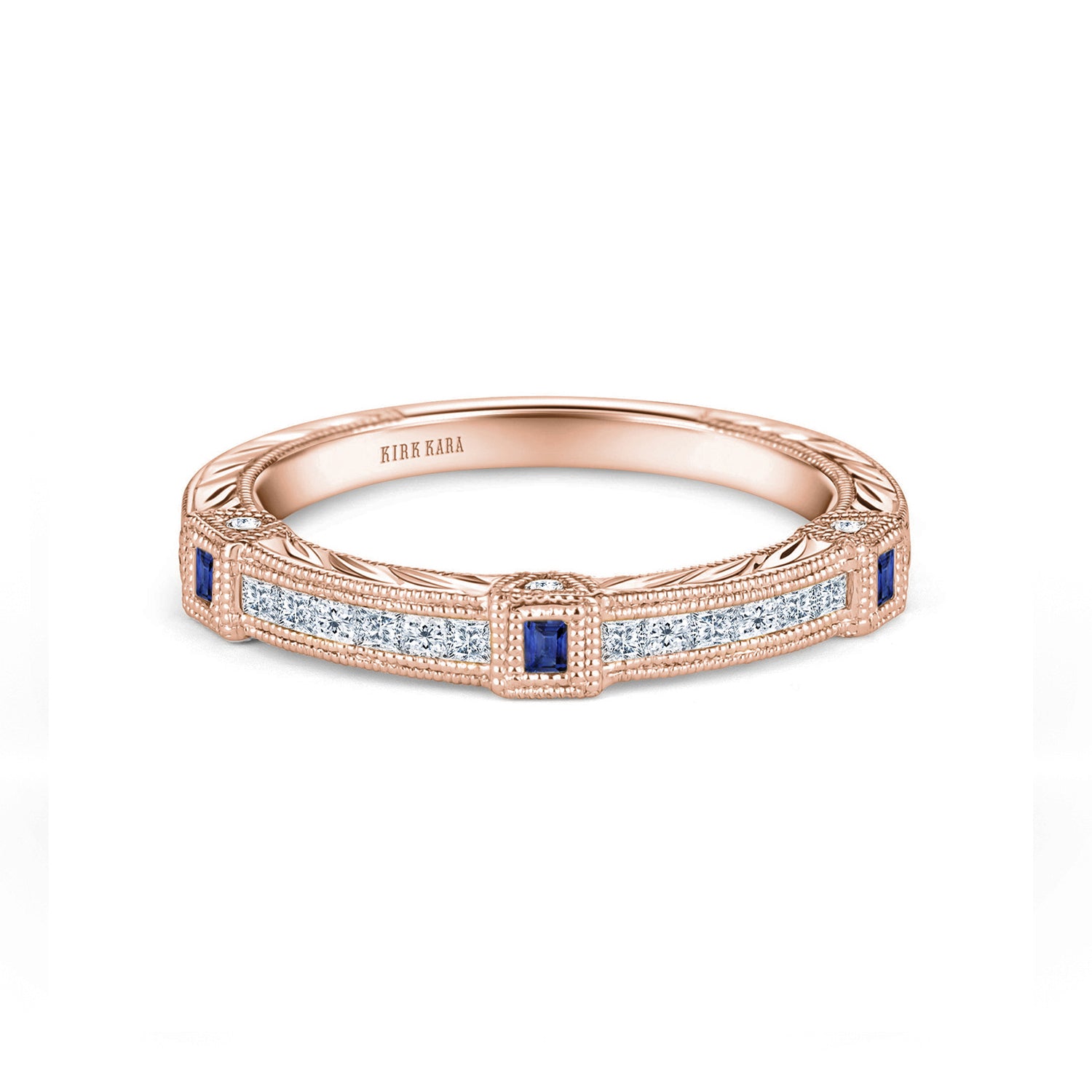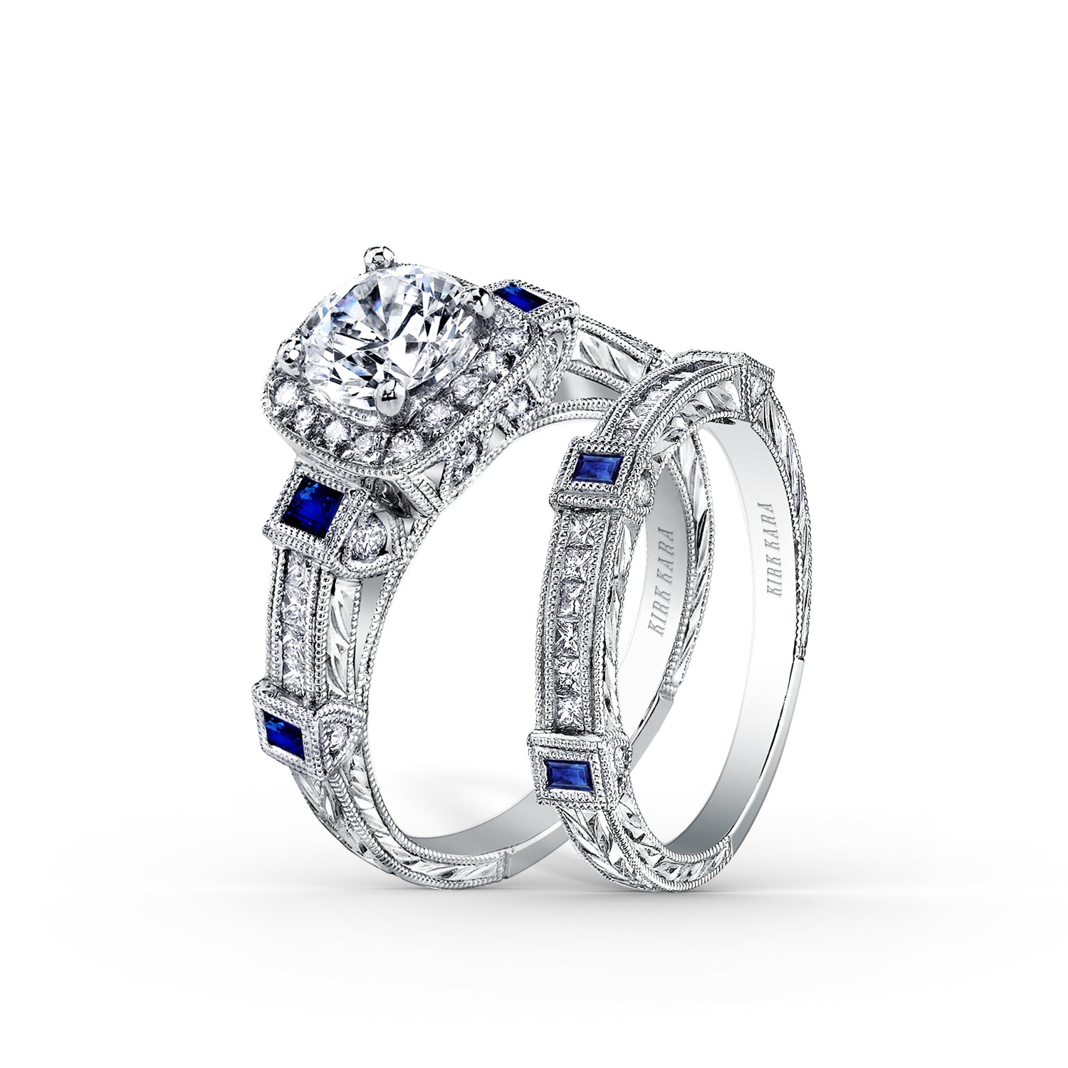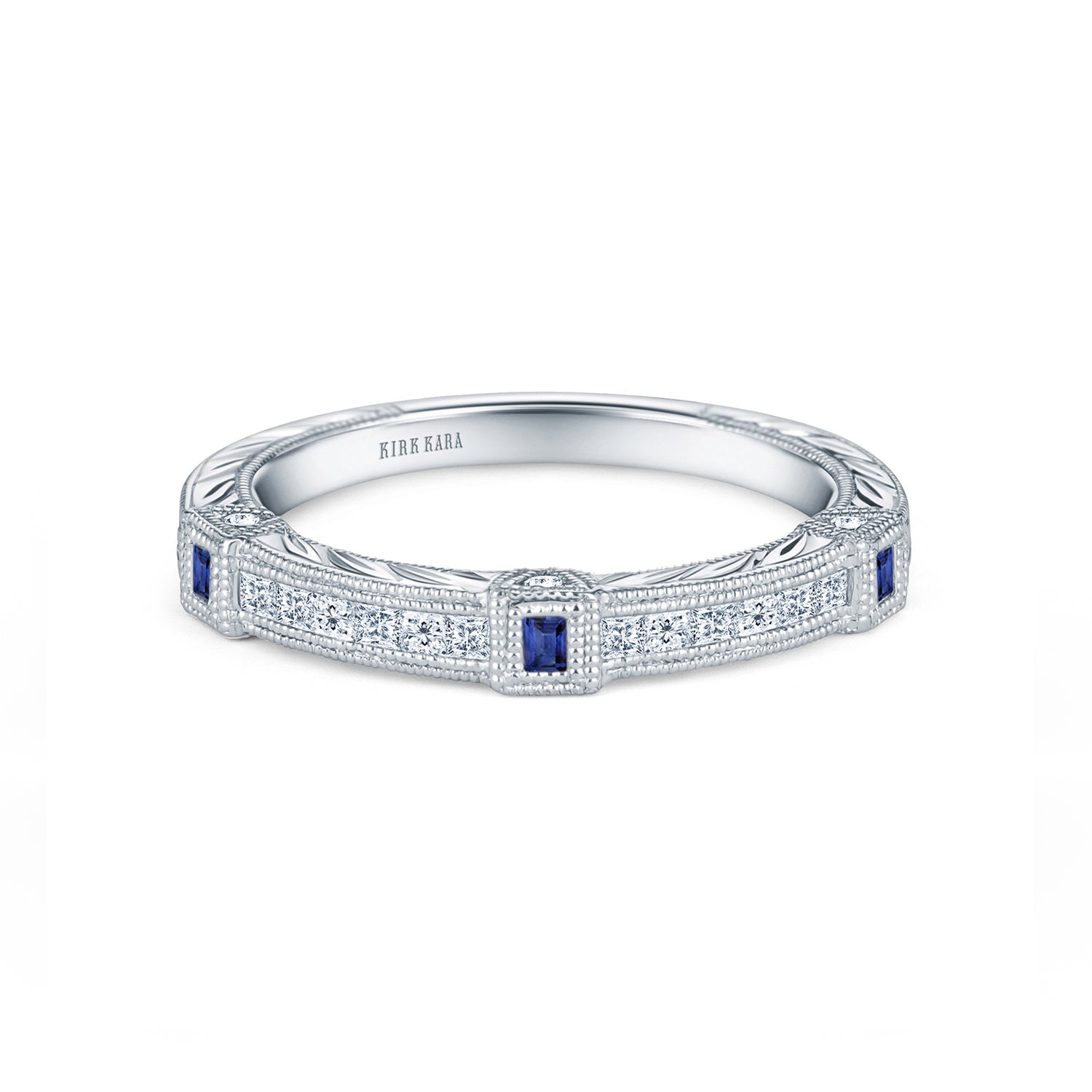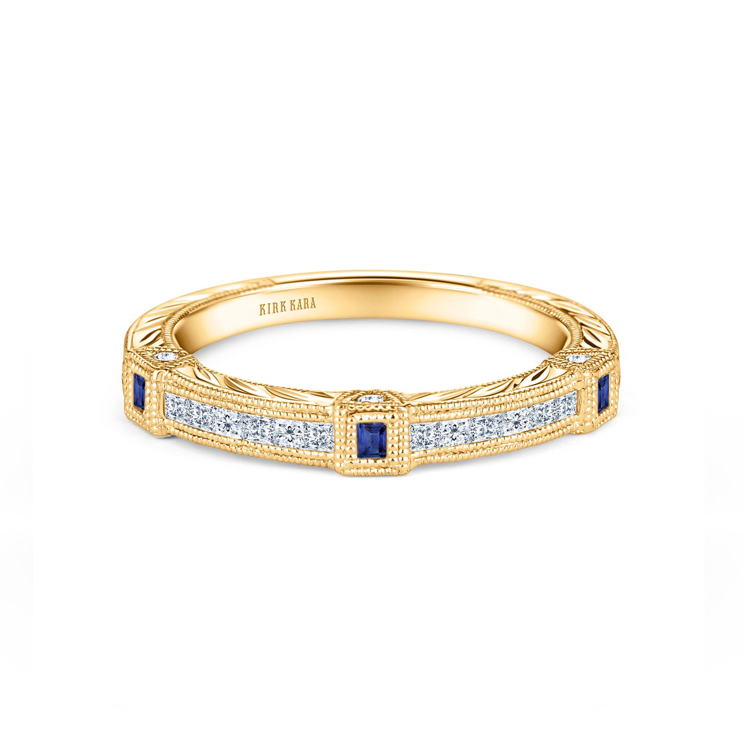 This deco inspired classic is an artistic design from the Carmella collection. It features 1/3 ctw of diamonds and natural blue sapphire baguettes. The signature handcrafted details include wheat hand engravings and milgrain edging.