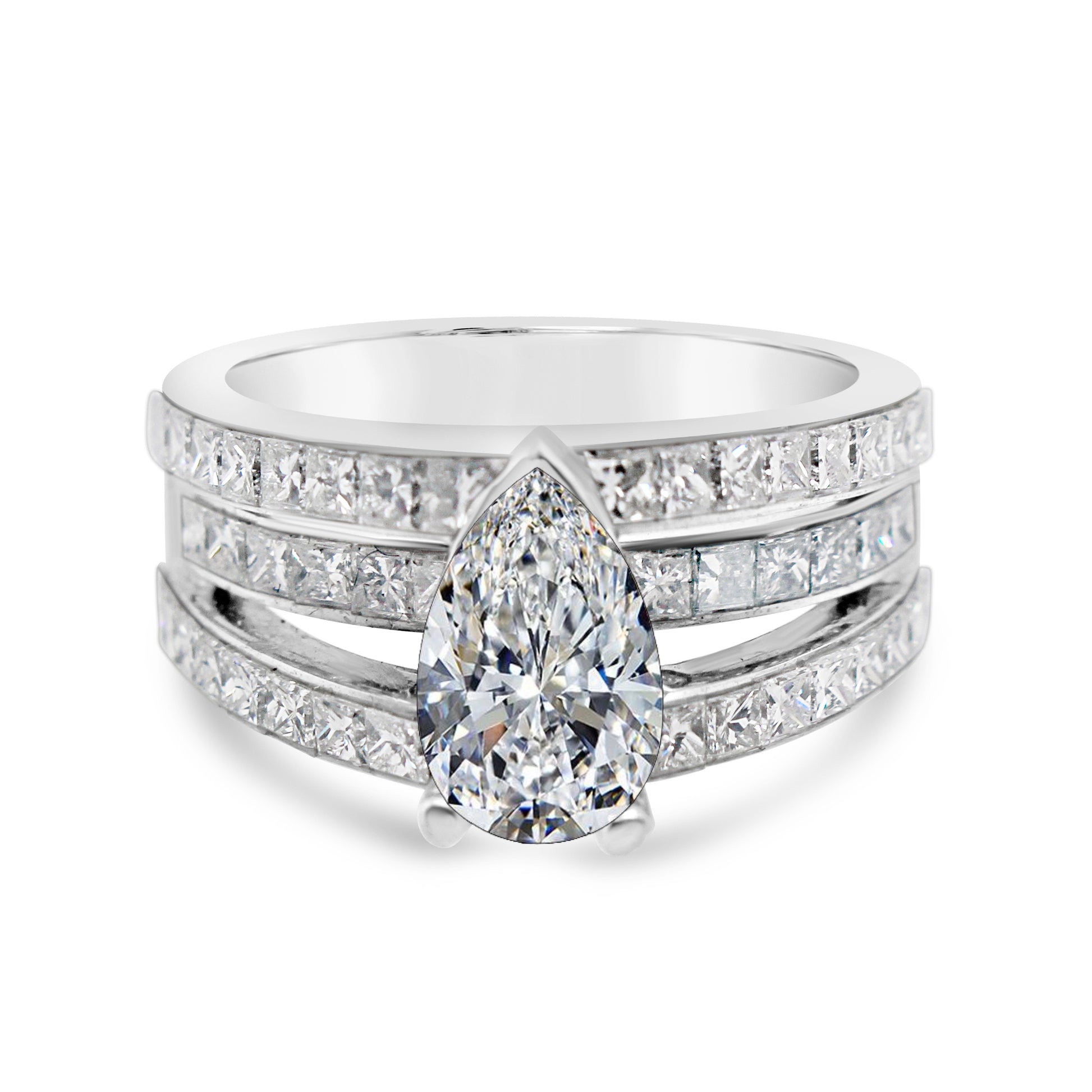 A delicately detailed ring from the 1990's era. Reminiscent of our current collections, this 'modern vintage' piece is made of Platinum and features 2ctw of princess diamonds. This bright, white and luminous, three row ring is a show stopper. Center stone is made to fit a 8.50x6.50mm pear cubic zirconia. Finger Size 6 1/2.