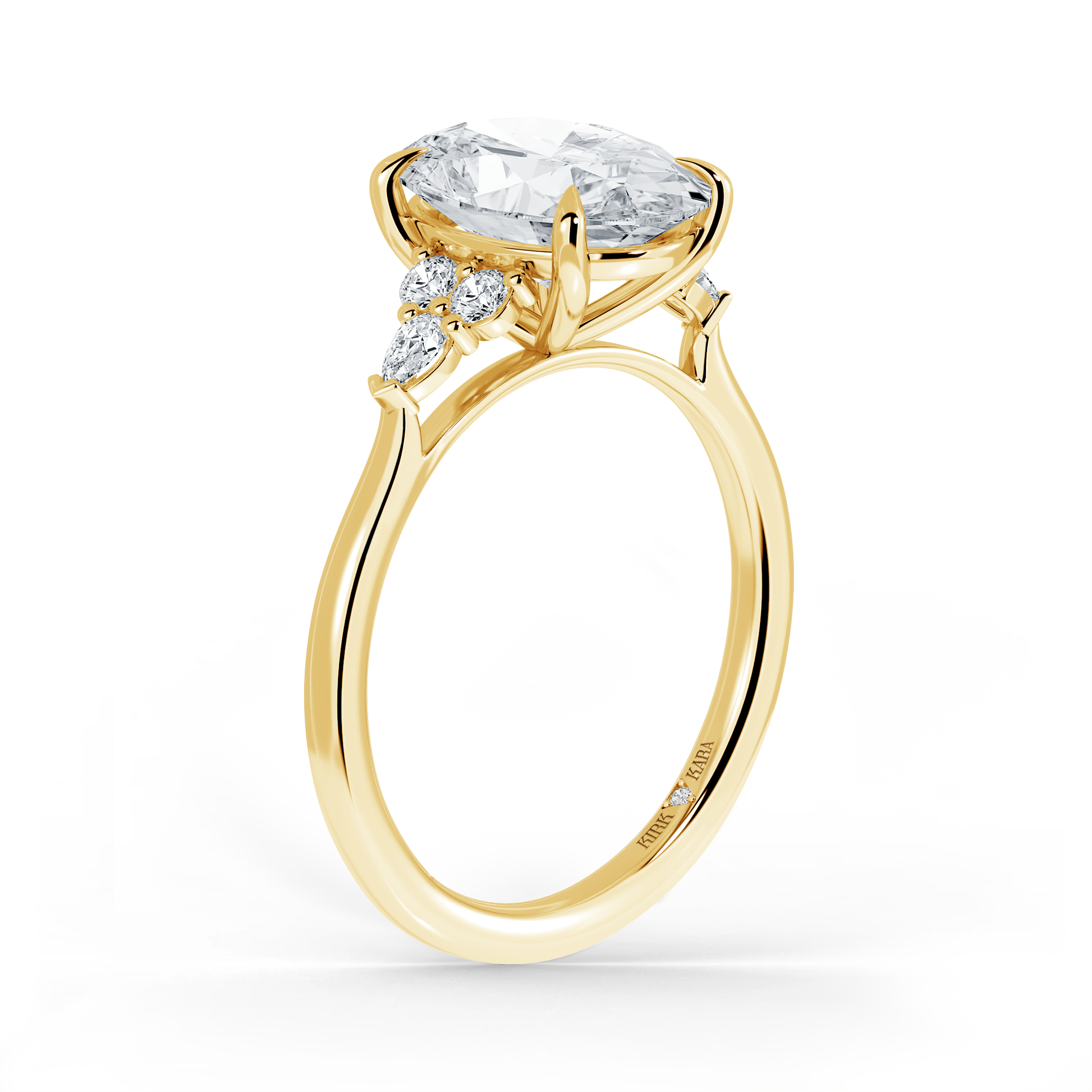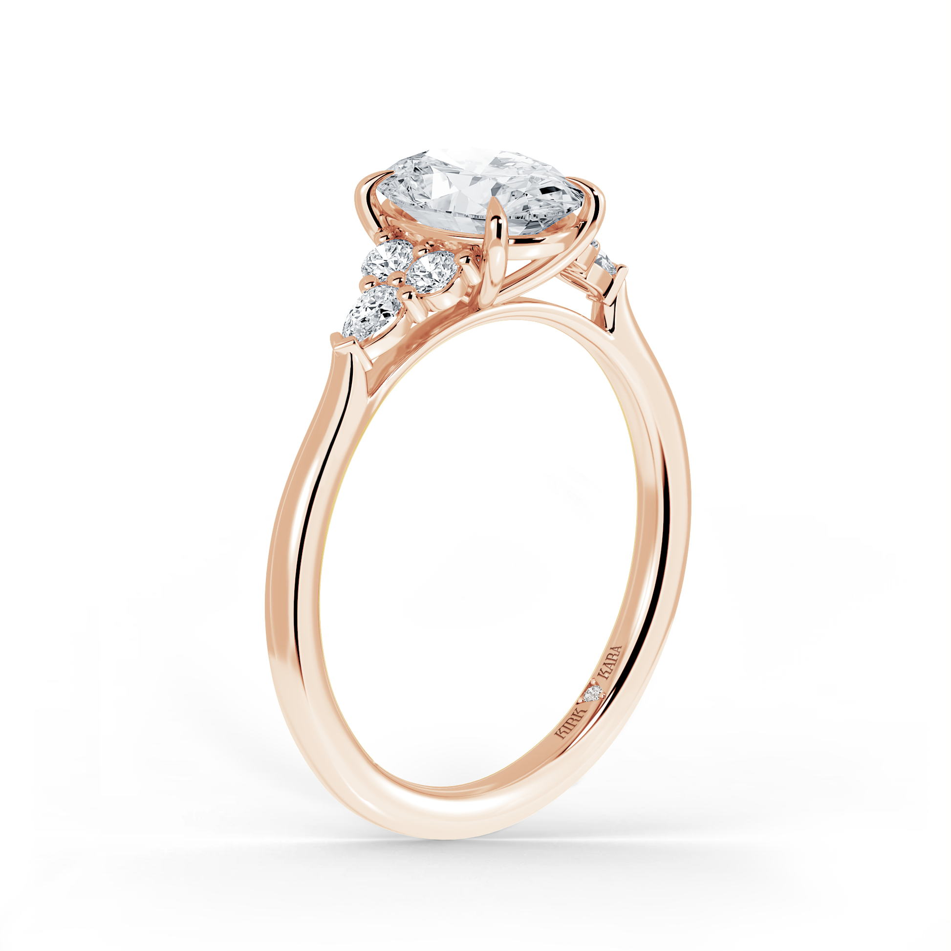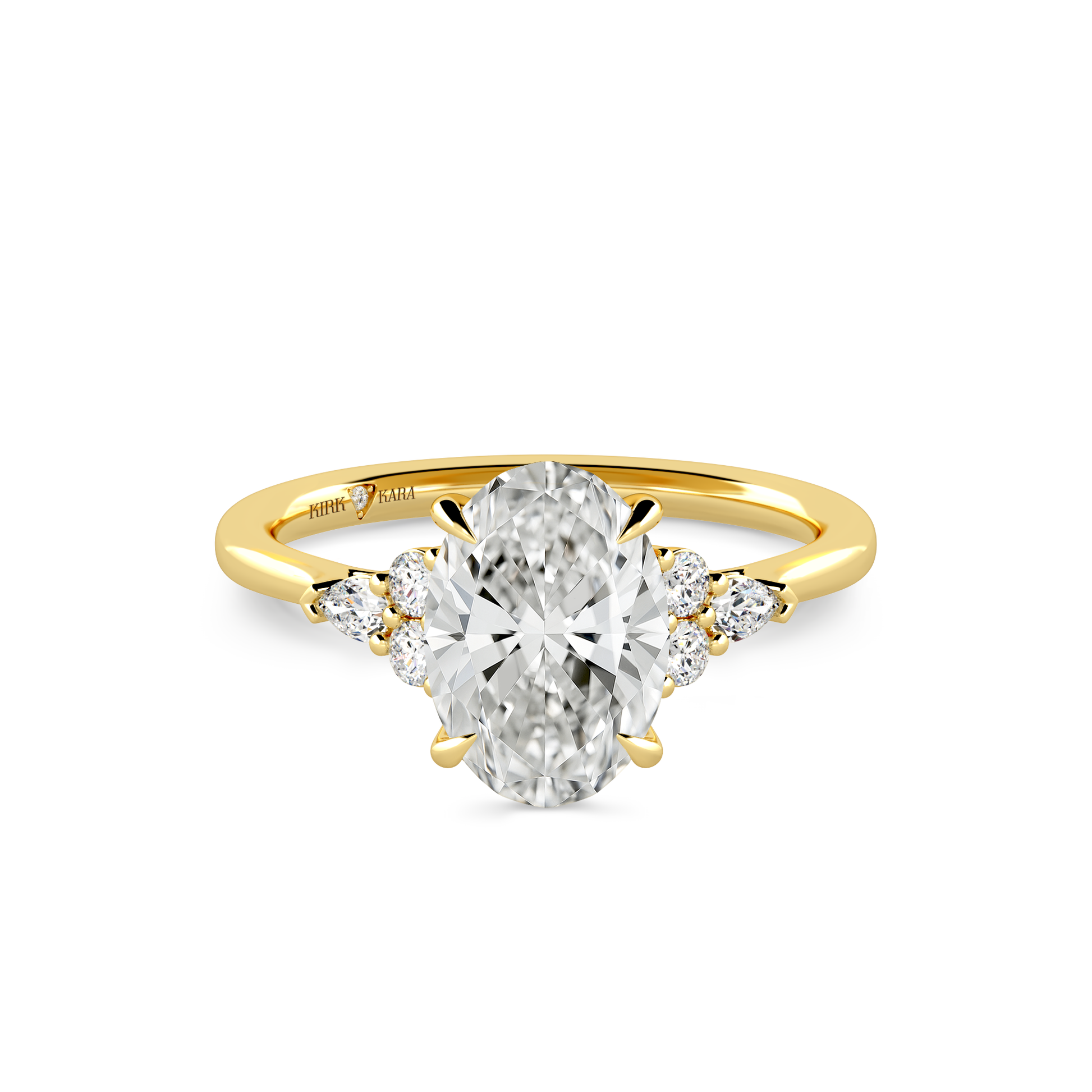 This classic diamond cluster accent ring is an exclusive design from Kirk Kara. It features 1/4 ctw of lab grown diamond accents. This engagement ring arrives complete, set with an Oval lab grown center diamond. Available with your choice of of center stone sizes 1.00ct - 4.00ct.
