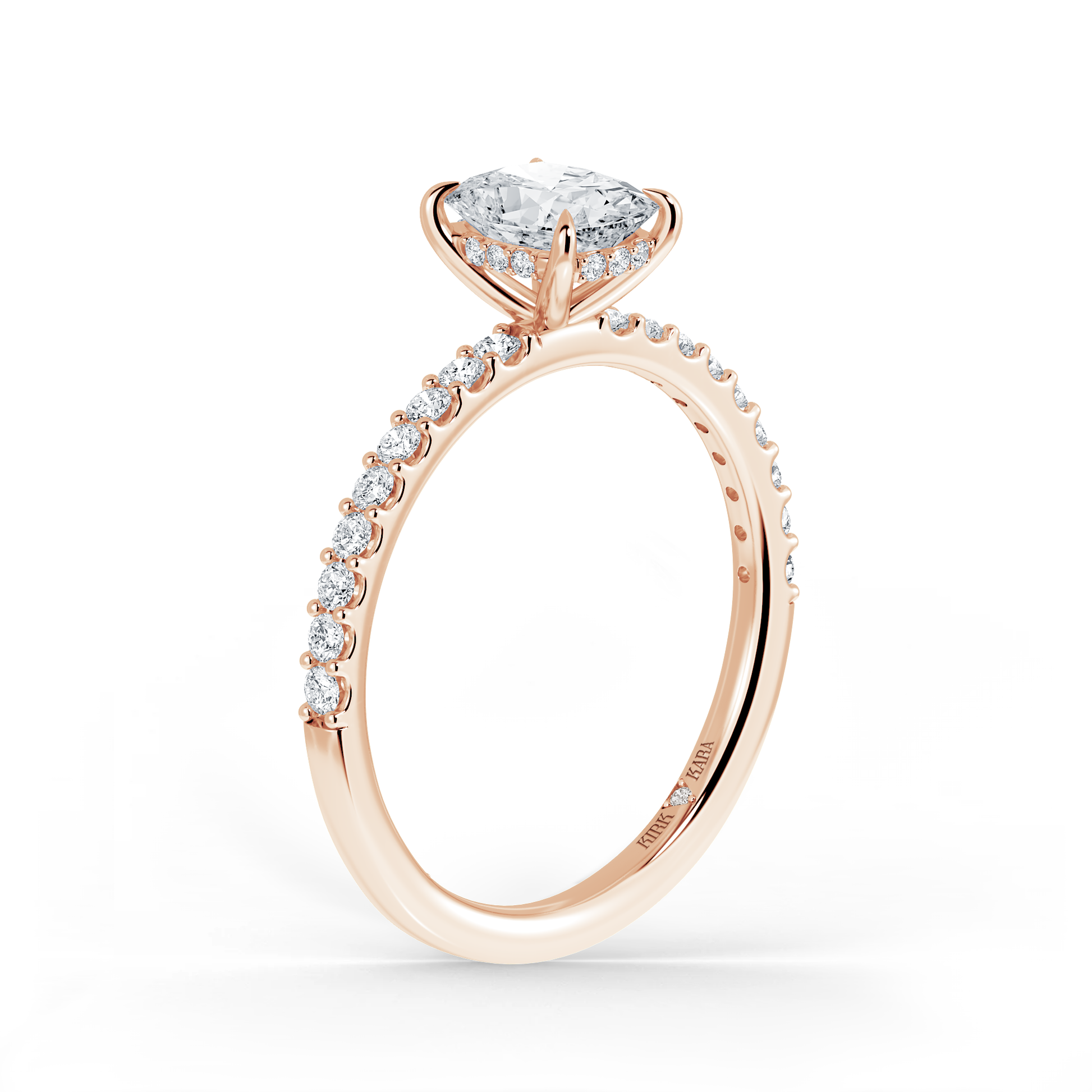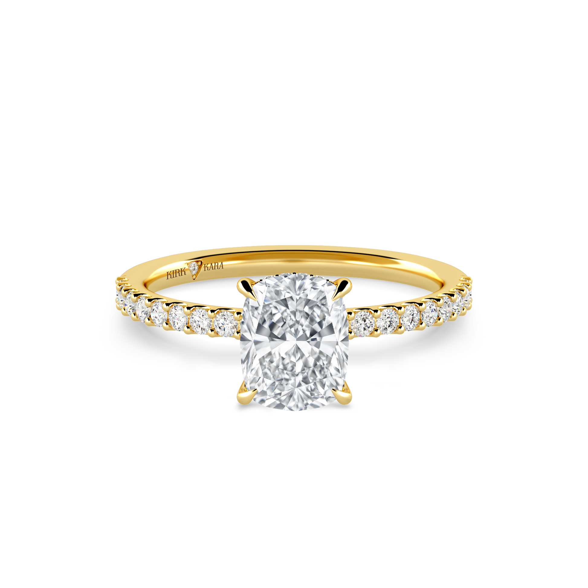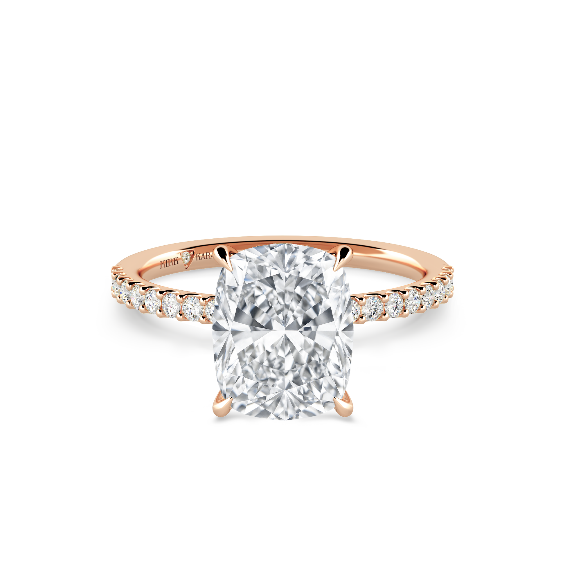 This classic diamond with a hidden halo solitaire ring is an exclusive design from Kirk Kara. It features 1/4 ctw of lab grown diamond accents. This engagement ring arrives complete, set with a Cushion lab grown center diamond. Available with your choice of of center stone sizes 1.00ct - 4.00ct.