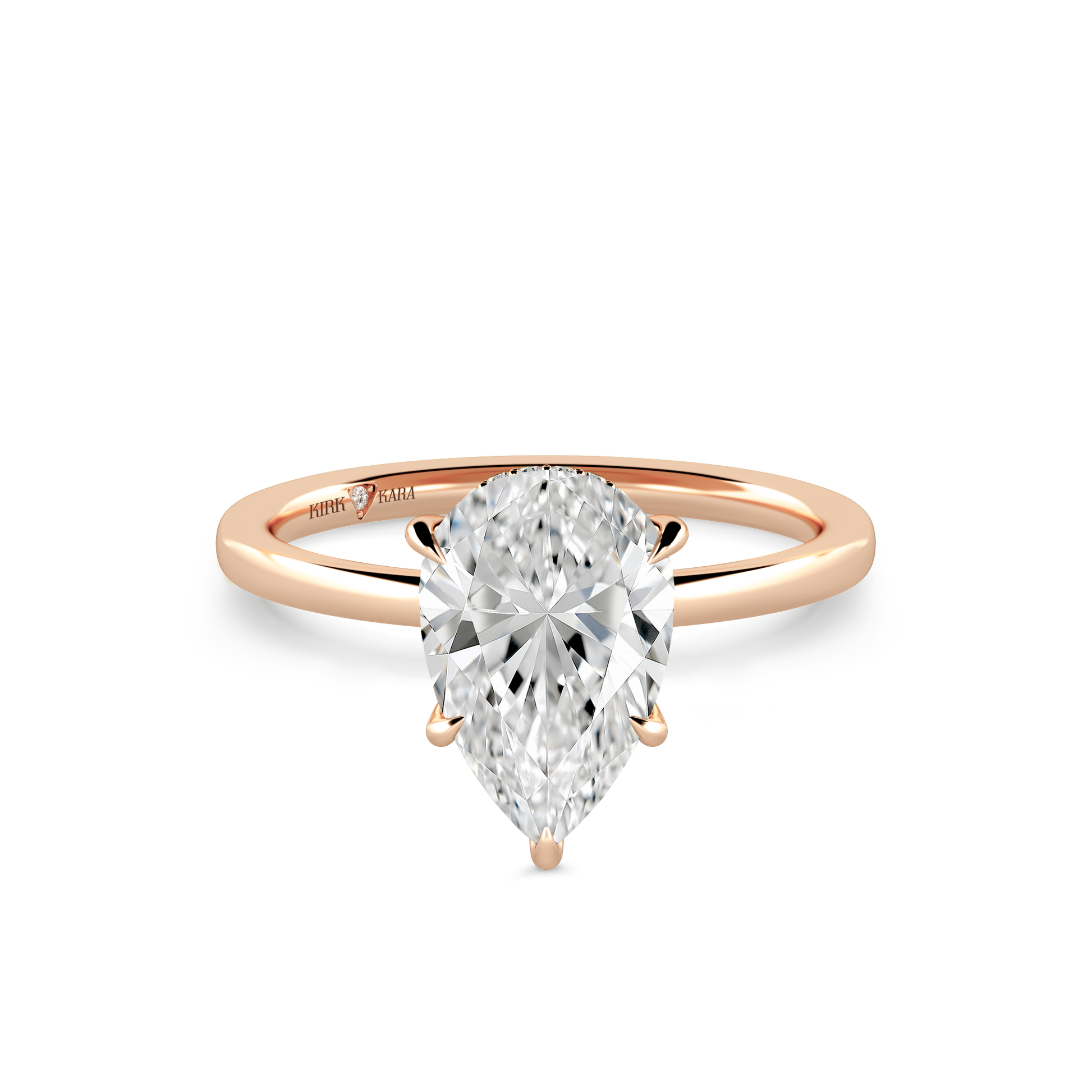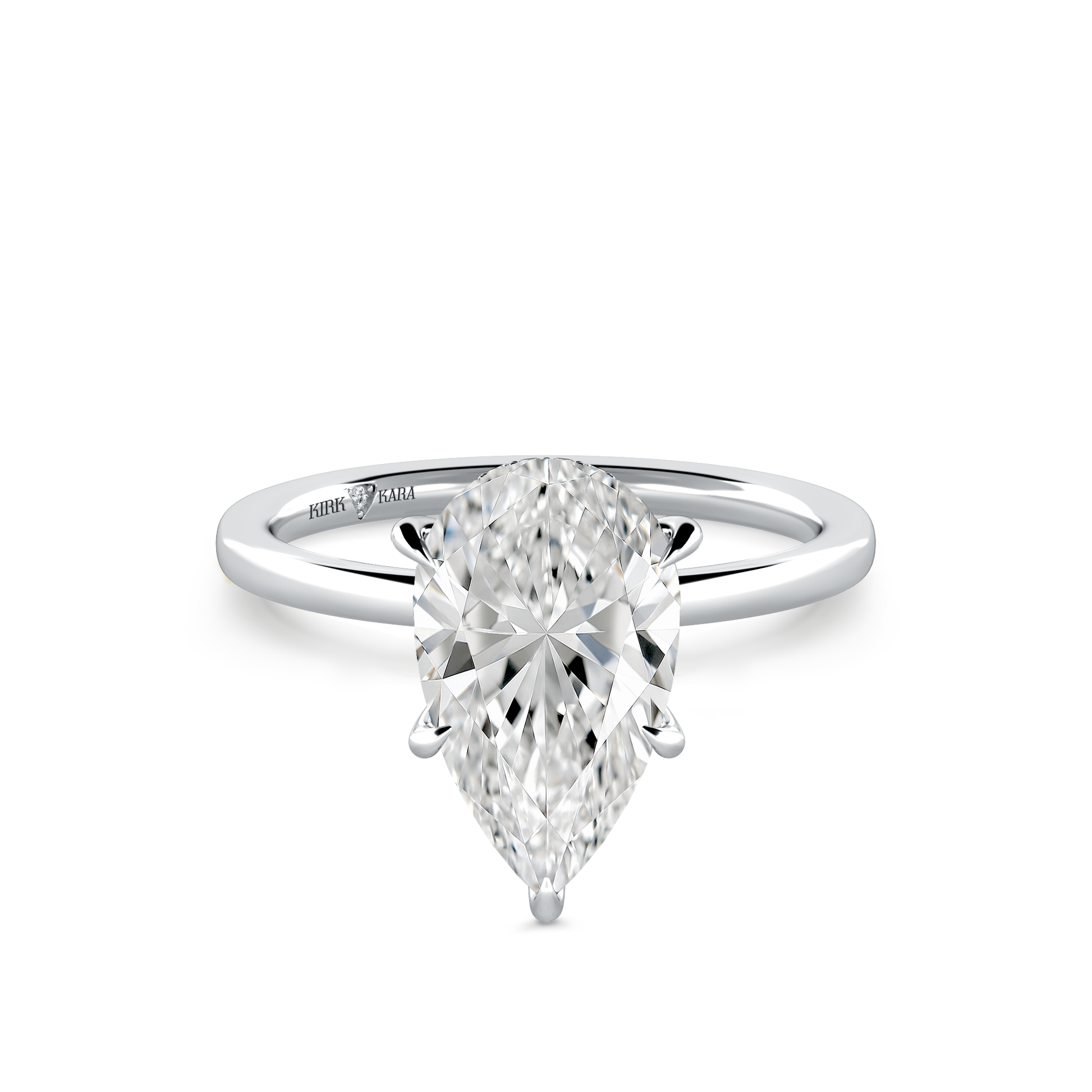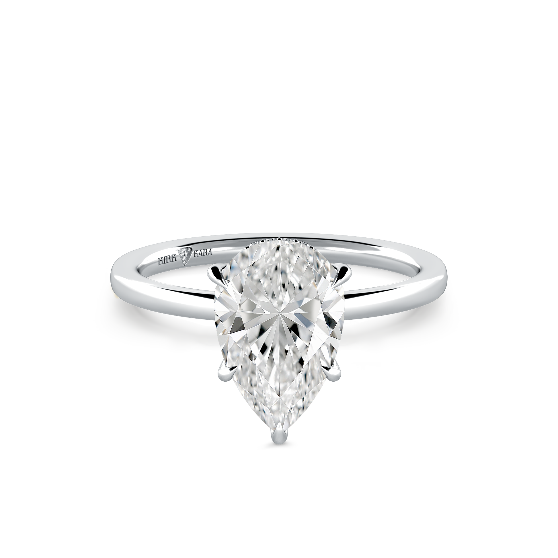 This classic hidden halo solitaire ring is an exclusive design from Kirk Kara. It features 1/20 ctw of lab grown diamond accents. This engagement ring arrives complete, set with a Pear lab grown center diamond. Available with your choice of of center stone sizes 1.00ct - 4.00ct.