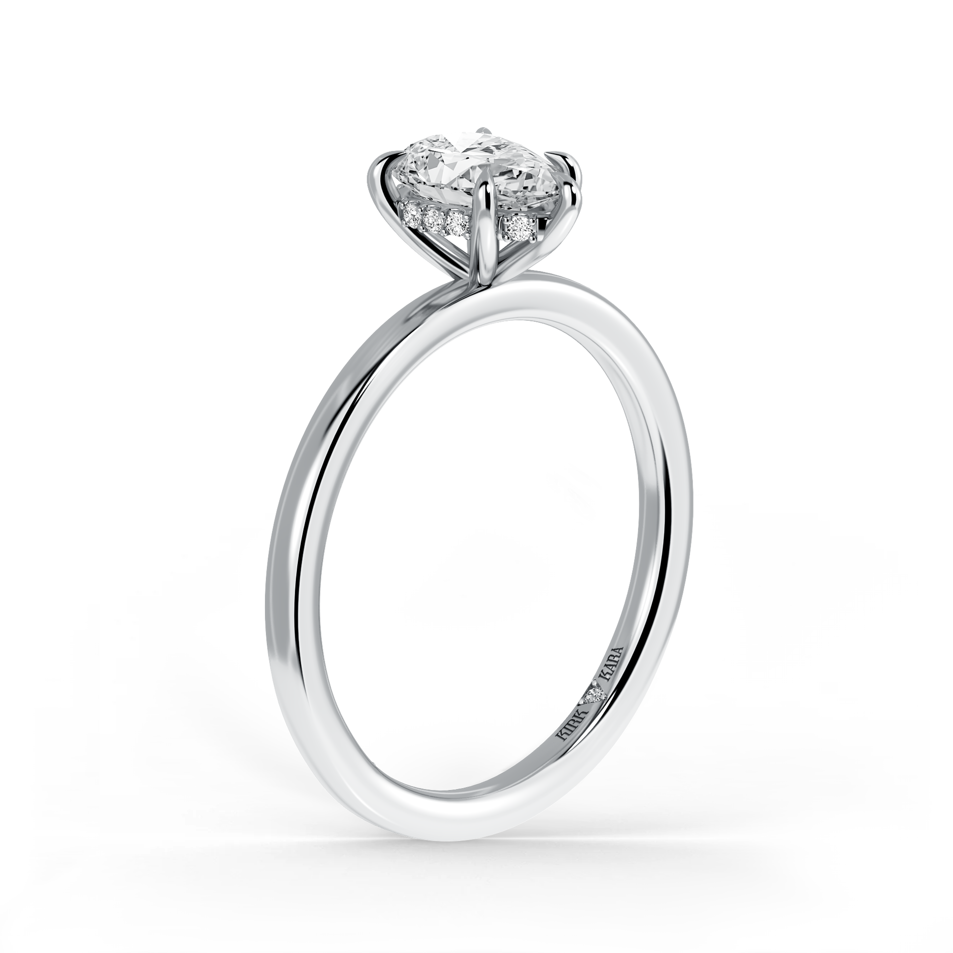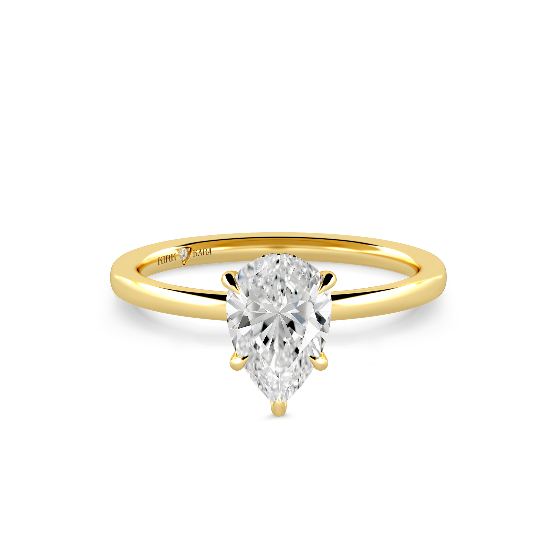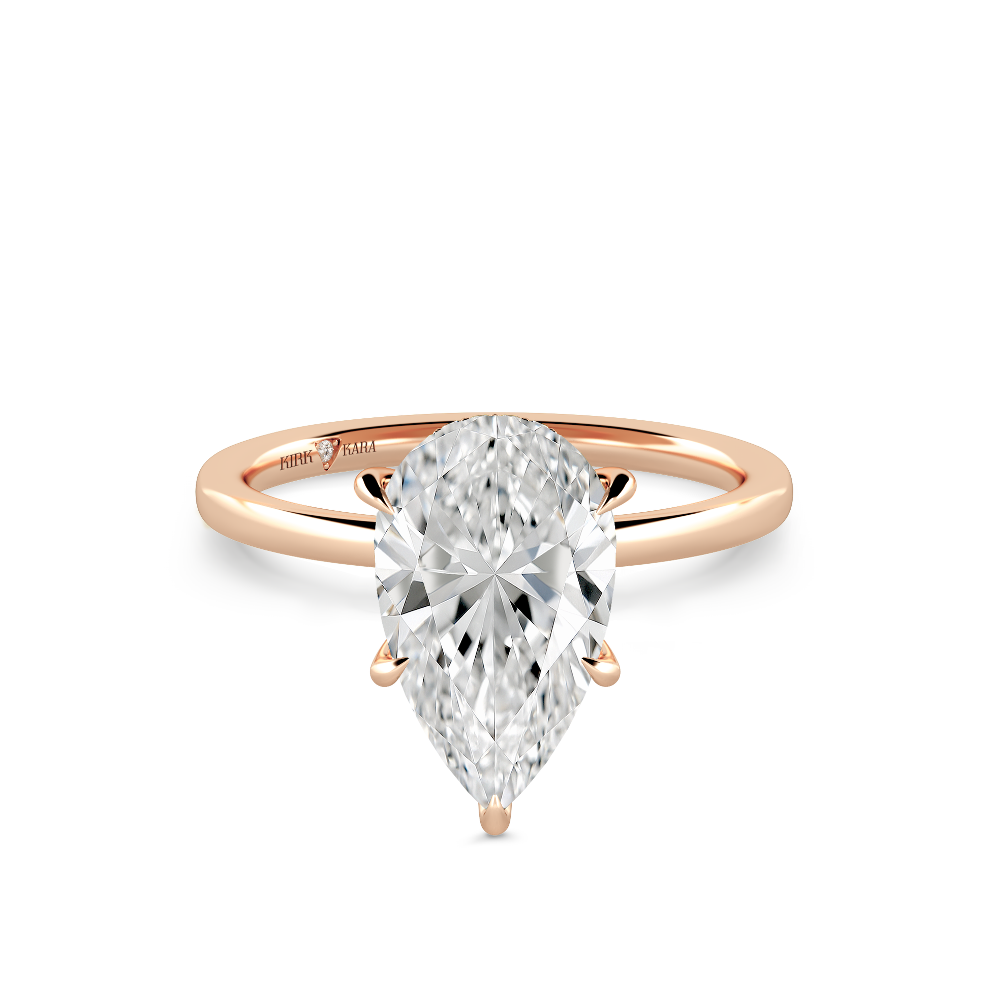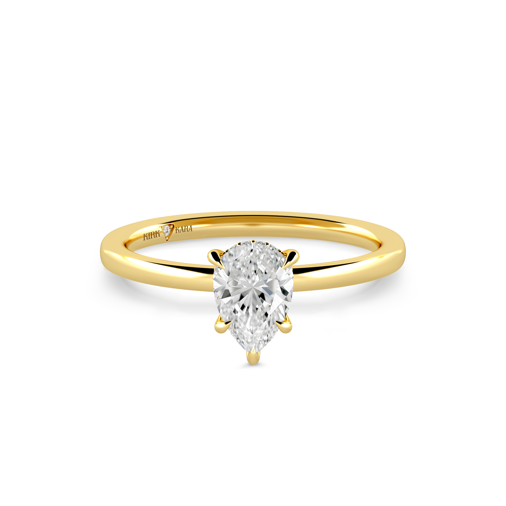 This classic hidden halo solitaire ring is an exclusive design from Kirk Kara. It features 1/20 ctw of lab grown diamond accents. This engagement ring arrives complete, set with a Pear lab grown center diamond. Available with your choice of of center stone sizes 1.00ct - 4.00ct.