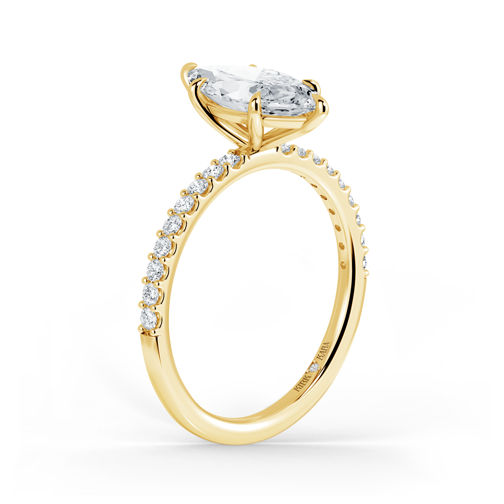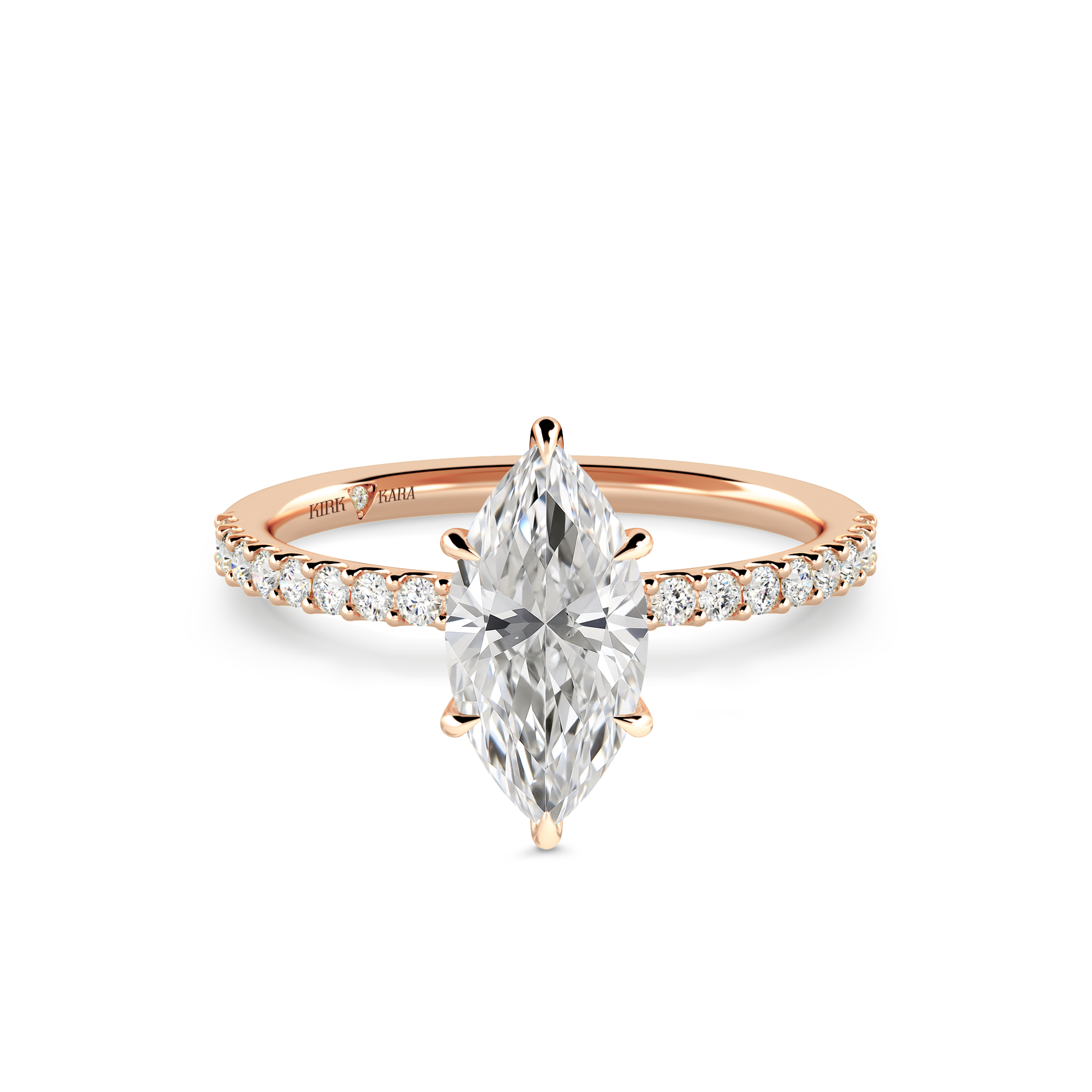 This classic diamond solitaire ring is an exclusive design from Kirk Kara. It features 1/5 ctw of lab grown diamond accents. This engagement ring arrives complete, set with a Marquise lab grown center diamond. Available with your choice of of center stone sizes 1.00ct - 4.00ct.
