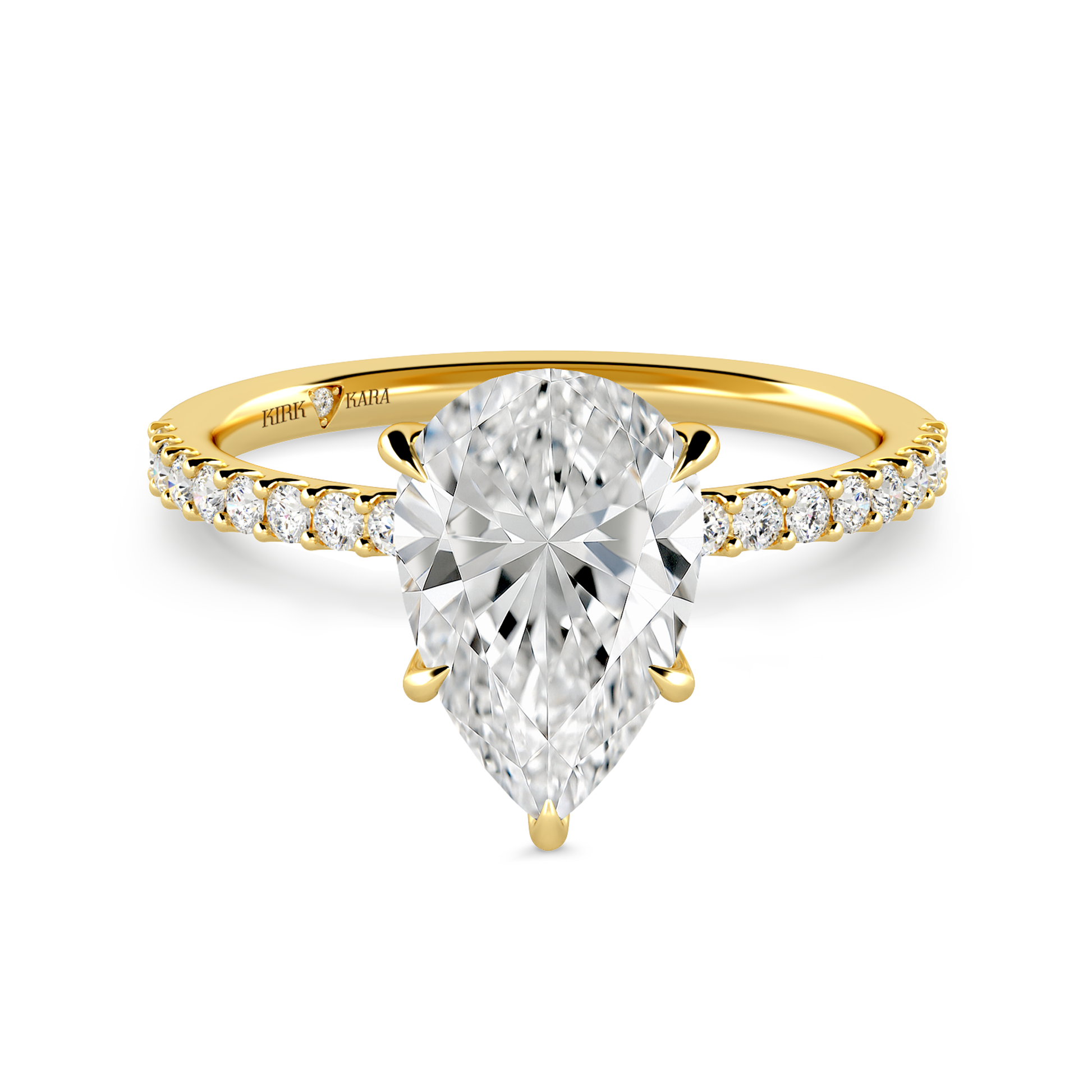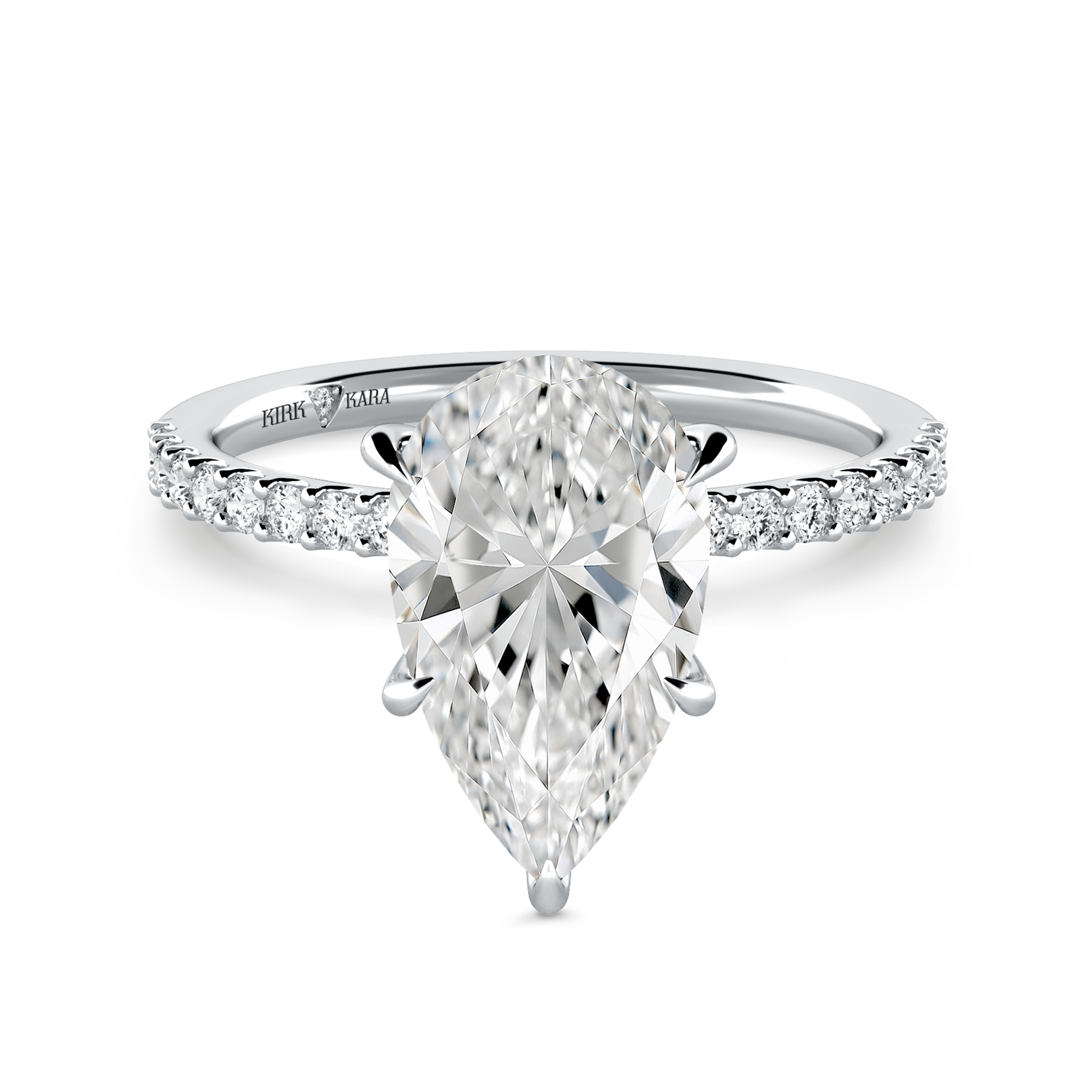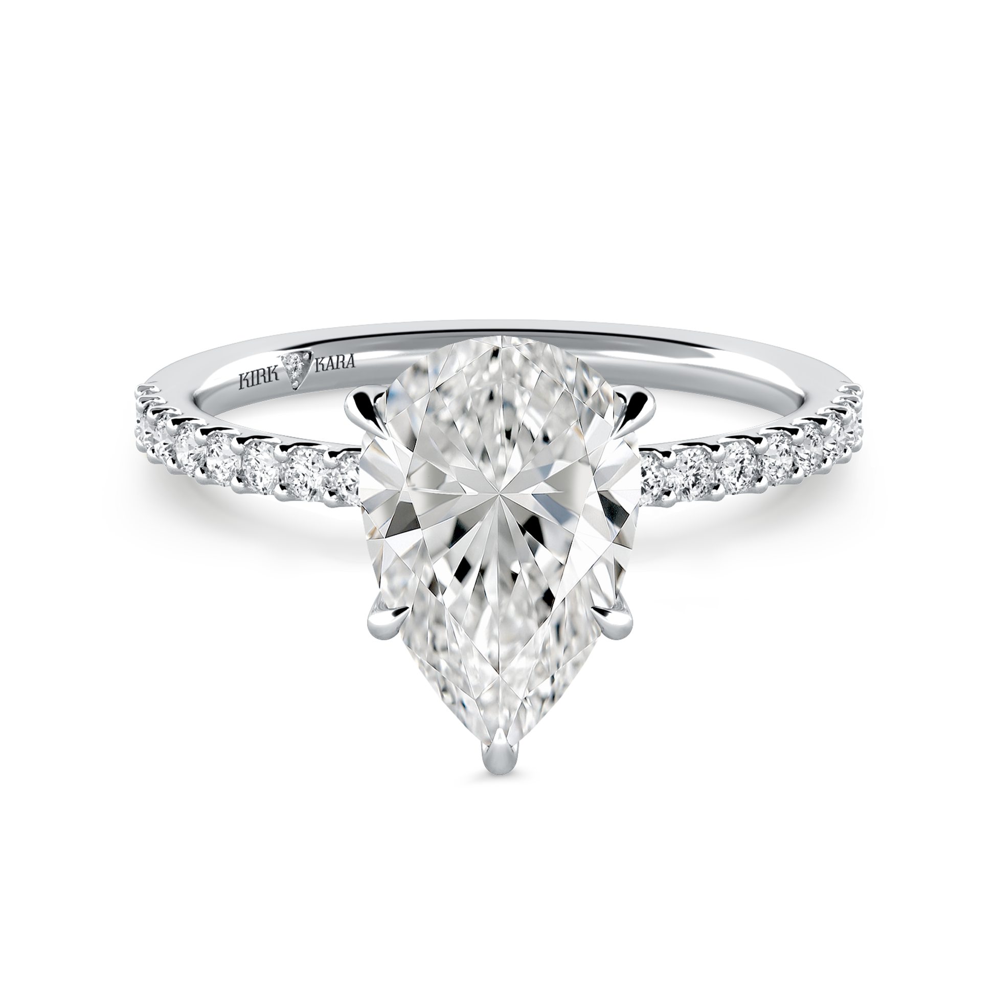 This classic diamond solitaire ring is an exclusive design from Kirk Kara. It features 1/5 ctw of lab grown diamond accents. This engagement ring arrives complete, set with a Pear lab grown center diamond. Available with your choice of of center stone sizes 2.00ct - 4.00ct.