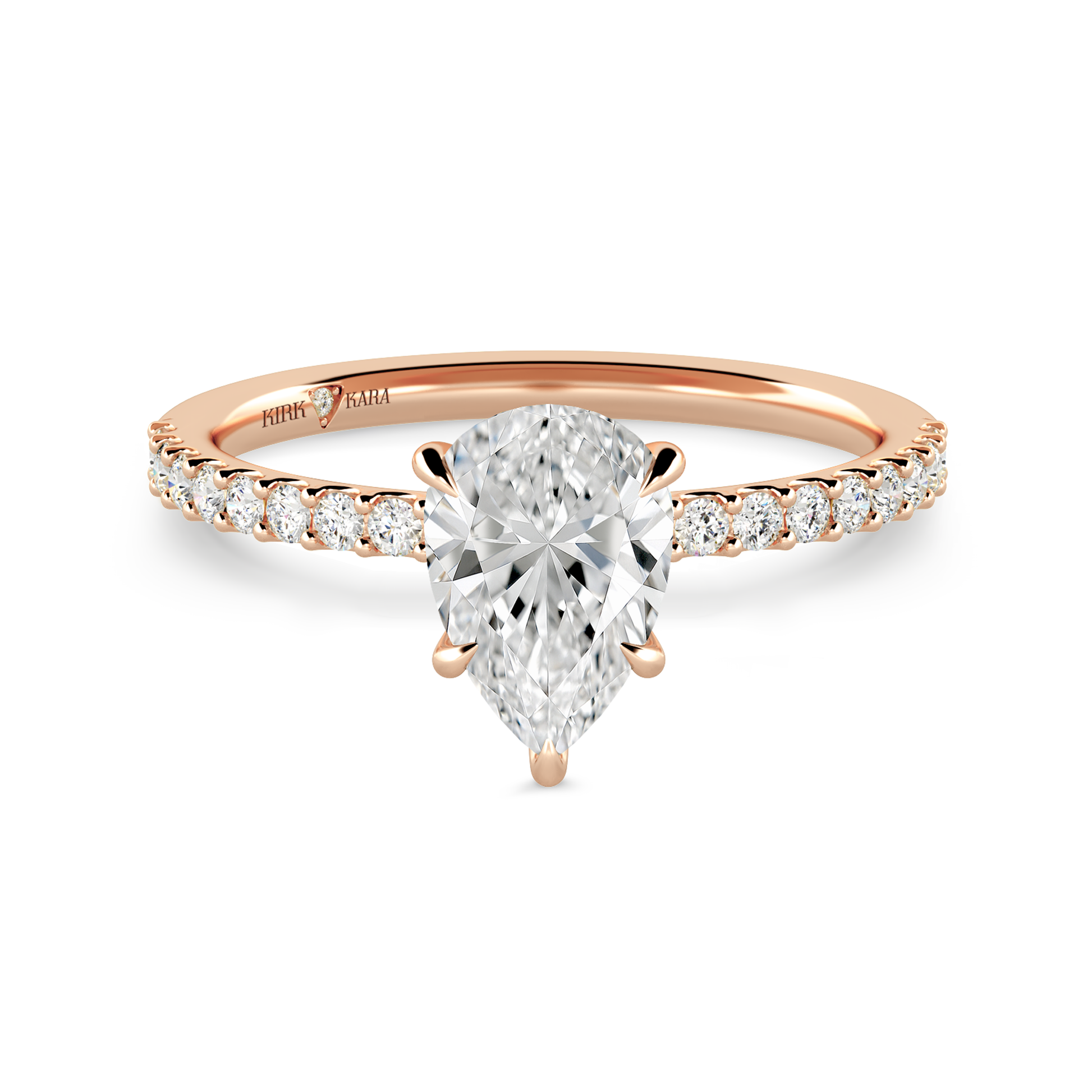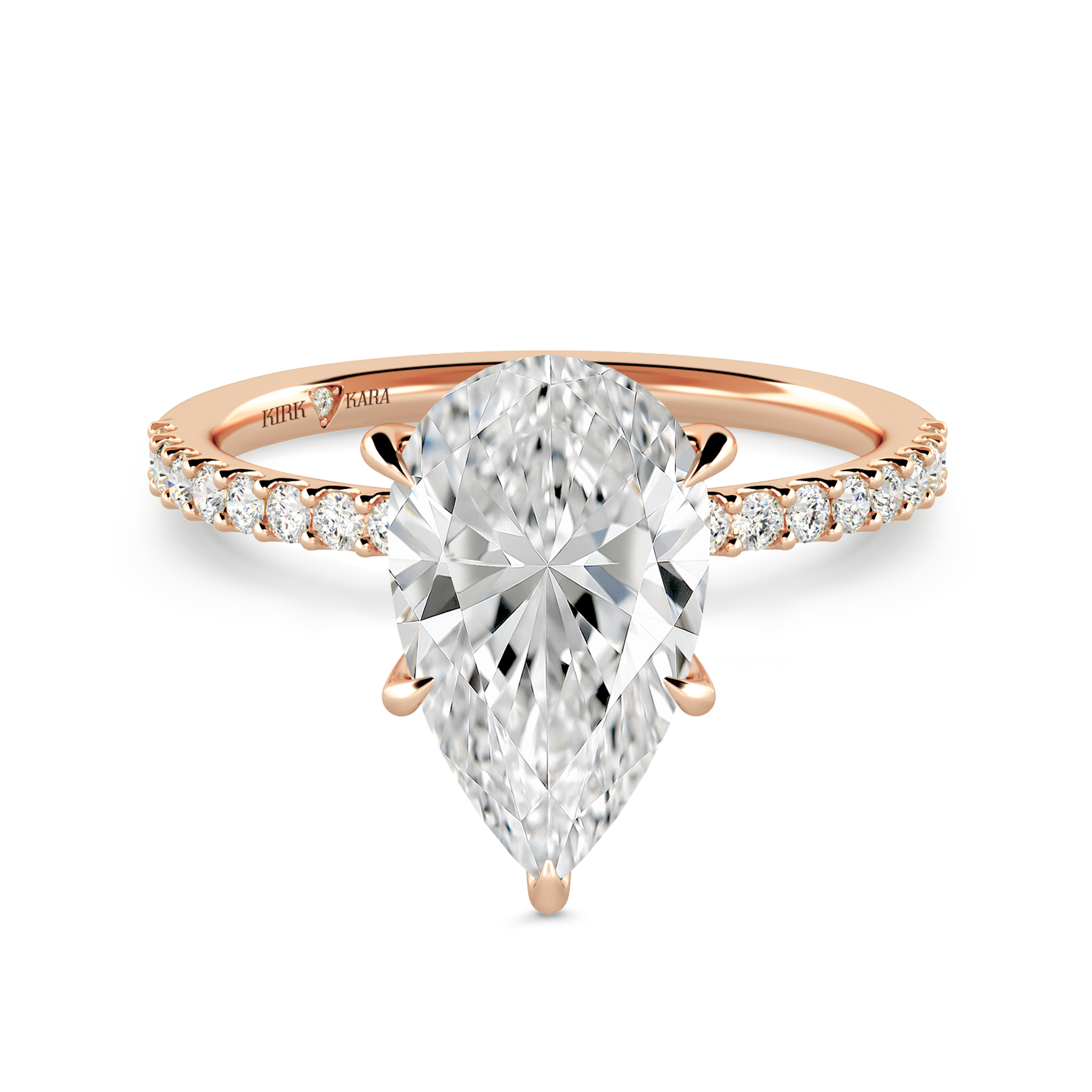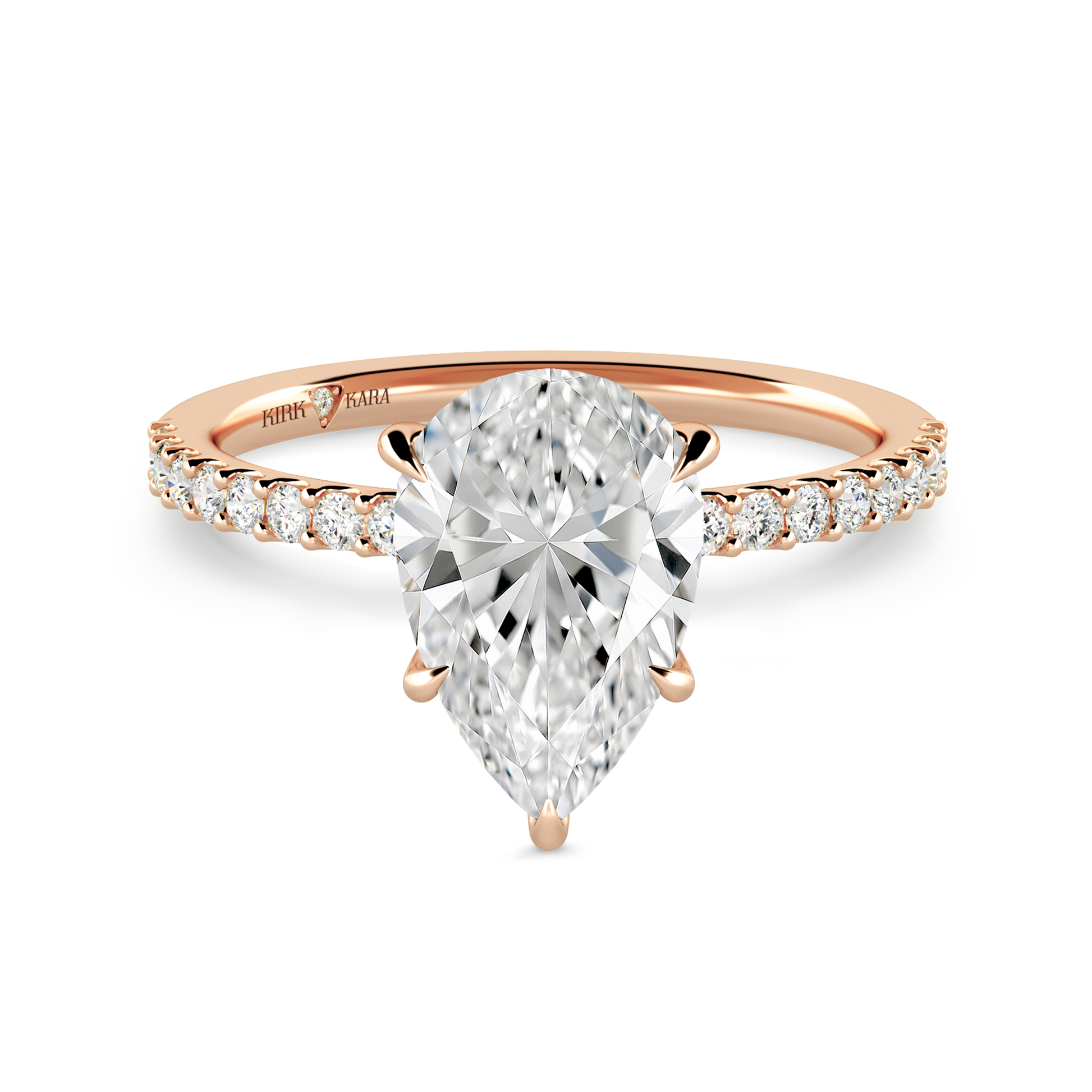 This classic diamond solitaire ring is an exclusive design from Kirk Kara. It features 1/5 ctw of lab grown diamond accents. This engagement ring arrives complete, set with a Pear lab grown center diamond. Available with your choice of of center stone sizes 2.00ct - 4.00ct.