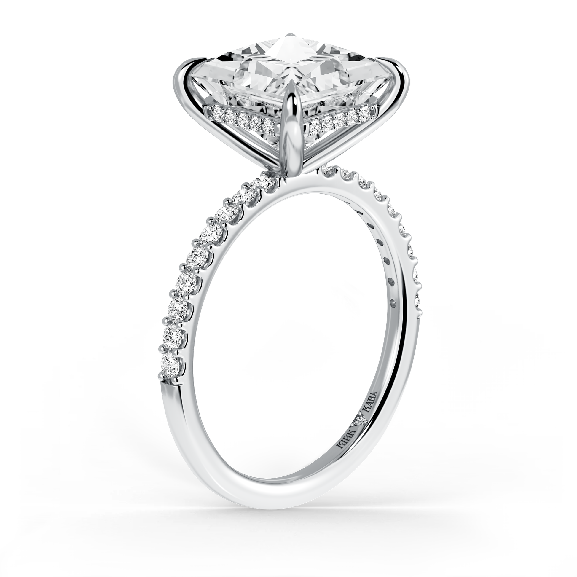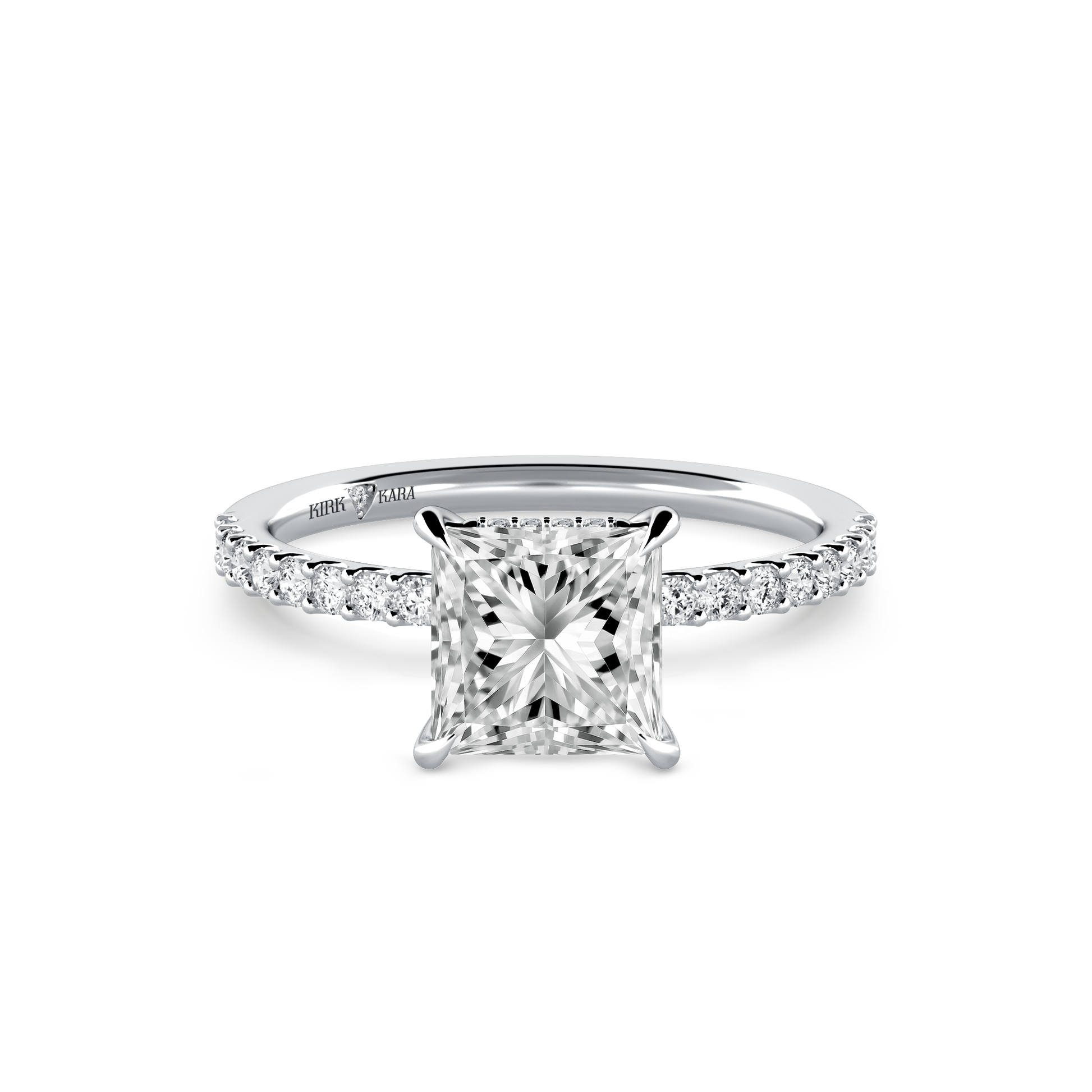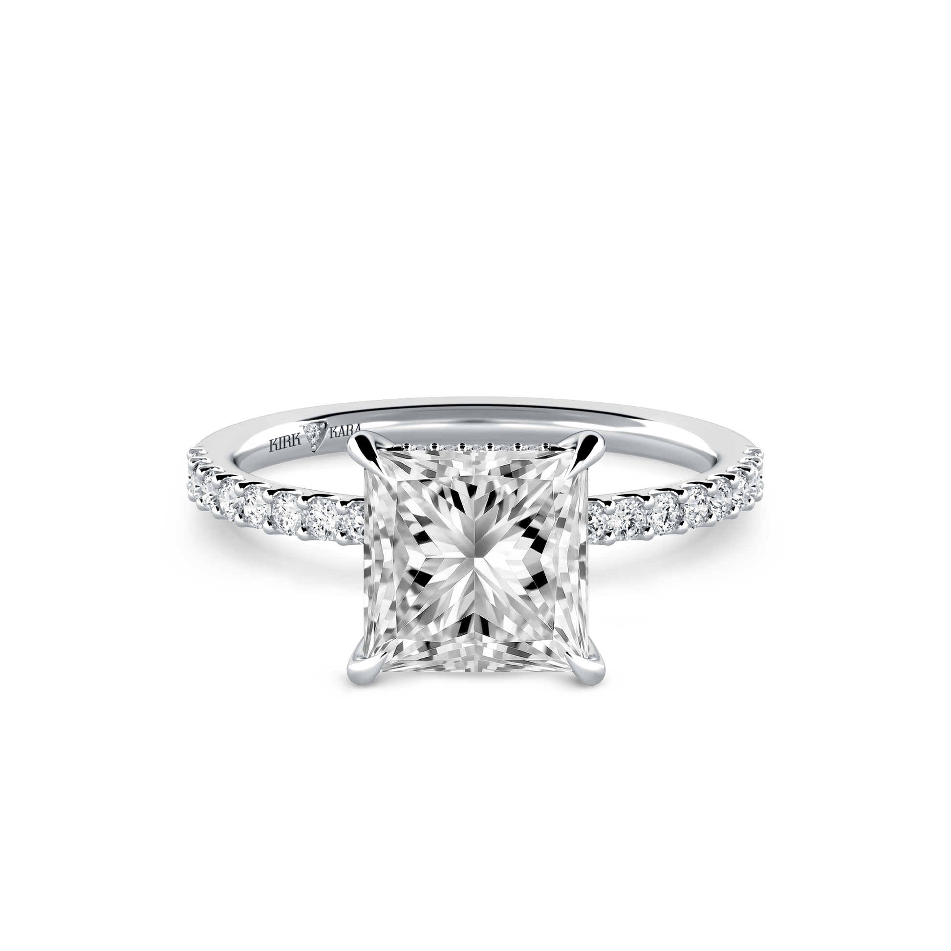 This classic diamond with a hidden halo solitaire ring is an exclusive design from Kirk Kara. It features 1/4 ctw of lab grown diamond accents. This engagement ring arrives complete, set with a Princess lab grown center diamond. Available with your choice of of center stone sizes 1.00ct - 4.00ct.