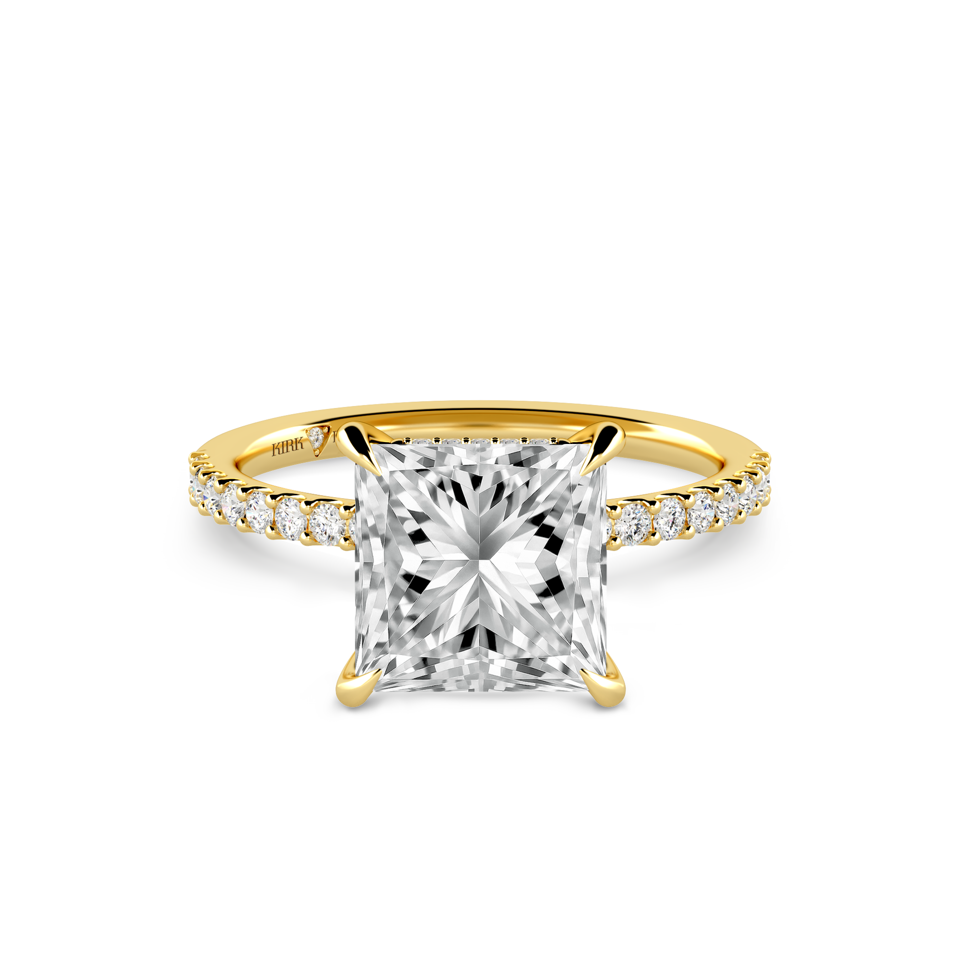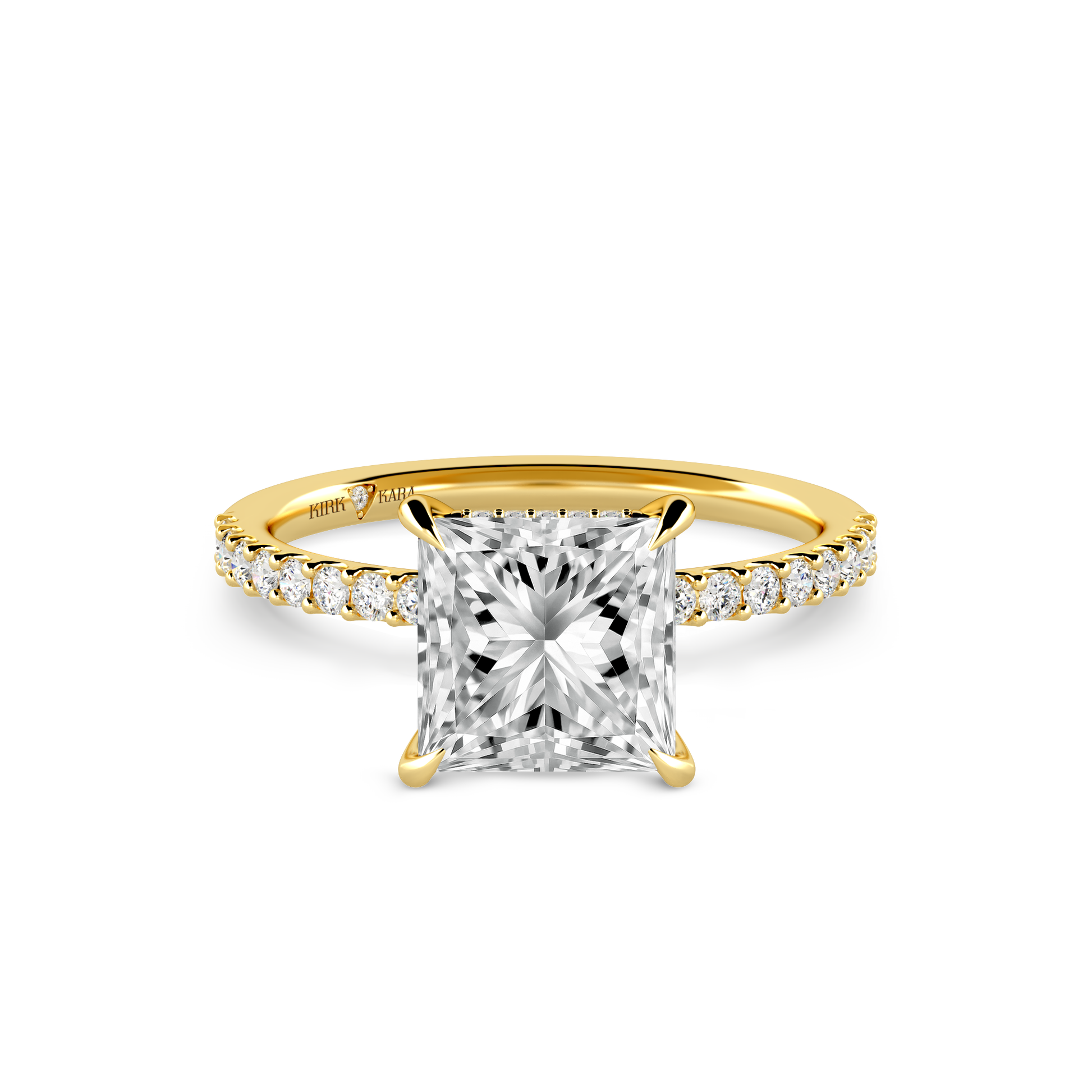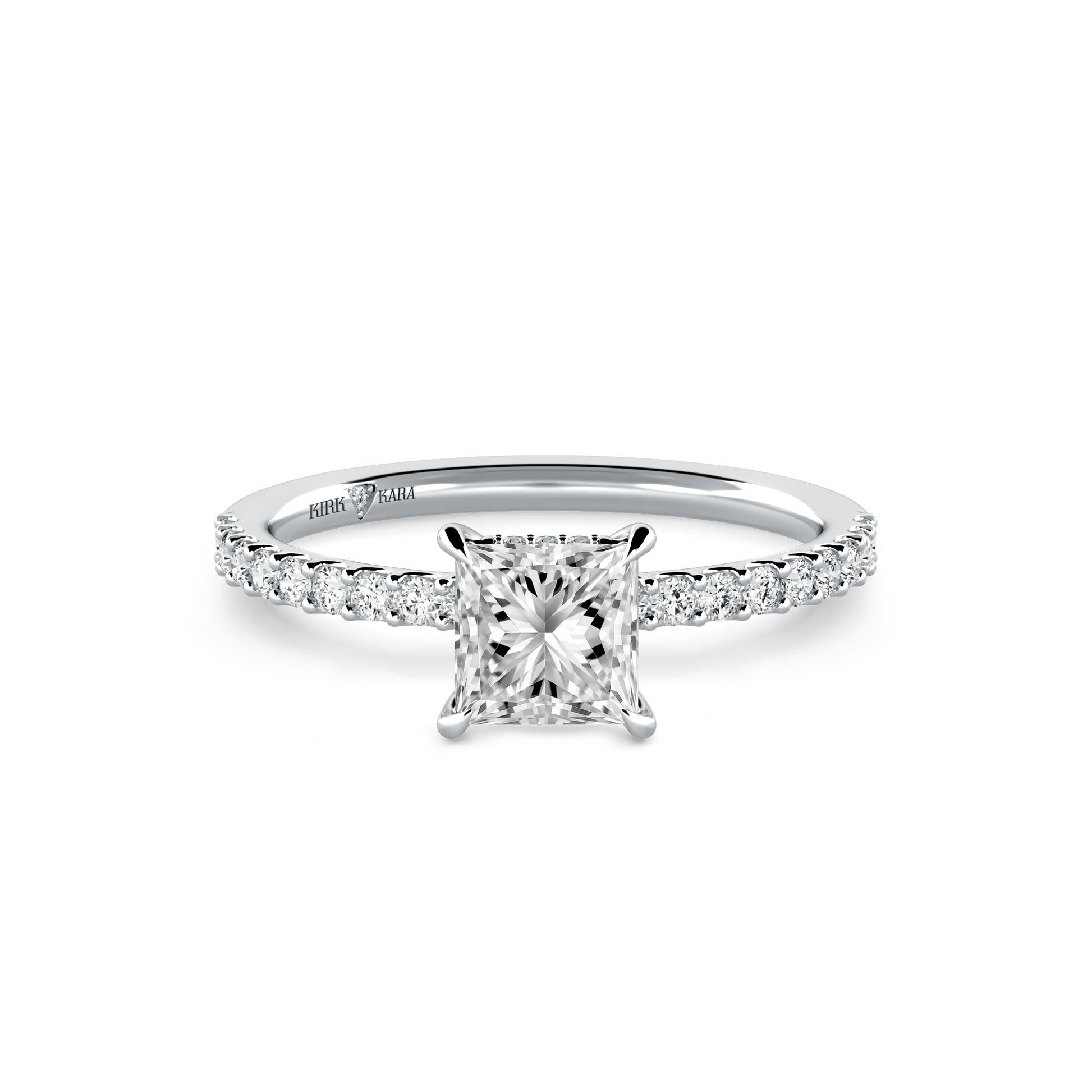 This classic diamond with a hidden halo solitaire ring is an exclusive design from Kirk Kara. It features 1/4 ctw of lab grown diamond accents. This engagement ring arrives complete, set with a Princess lab grown center diamond. Available with your choice of of center stone sizes 1.00ct - 4.00ct.
