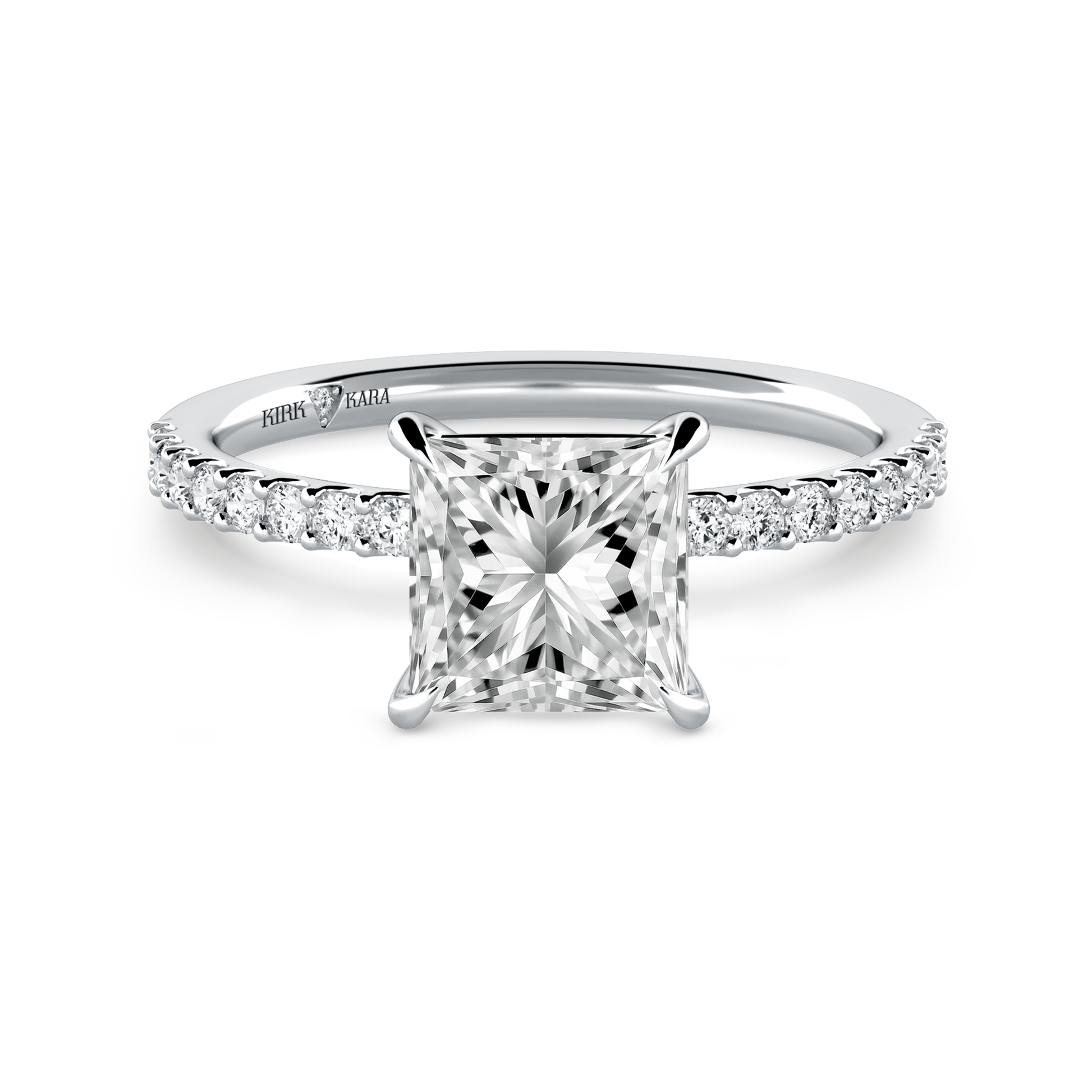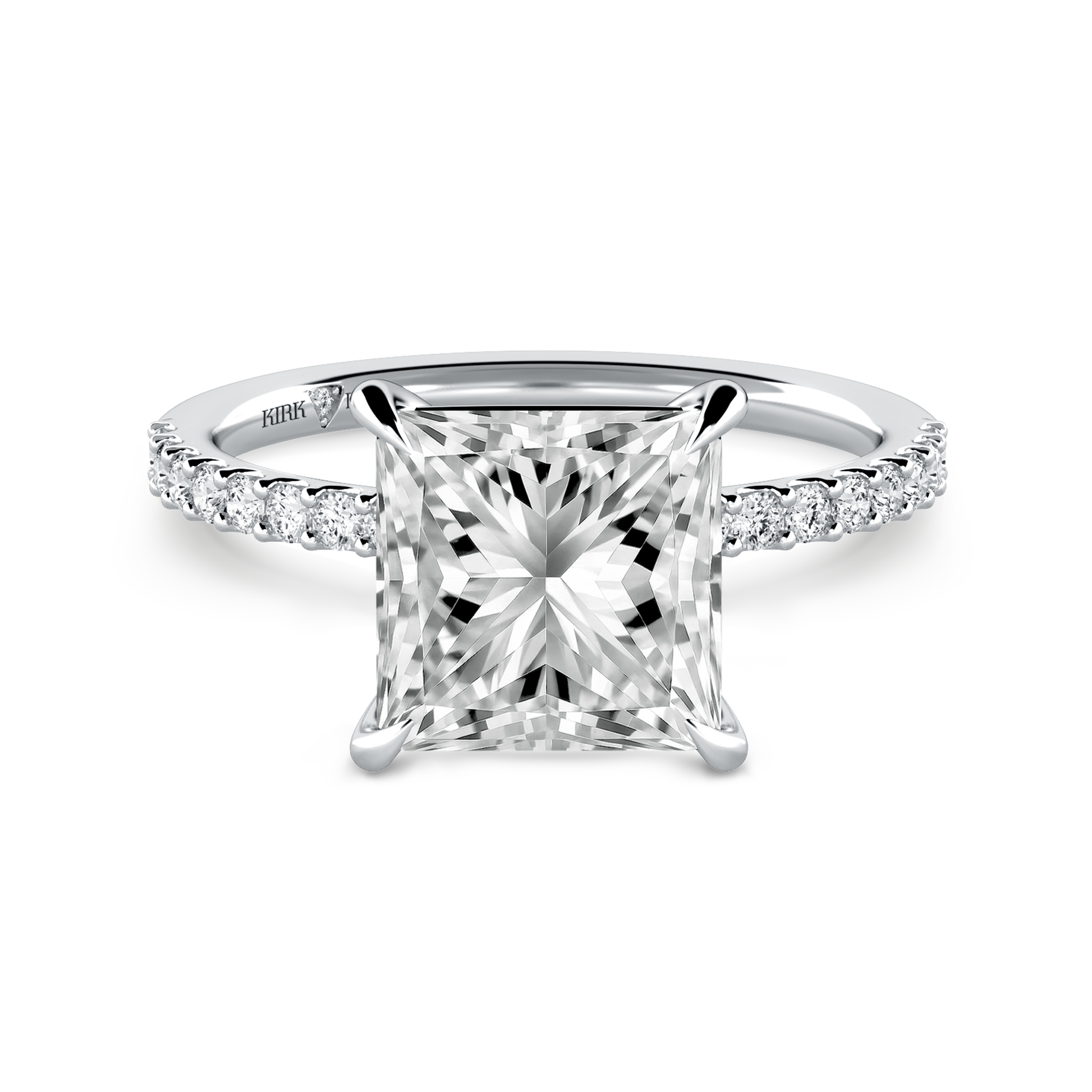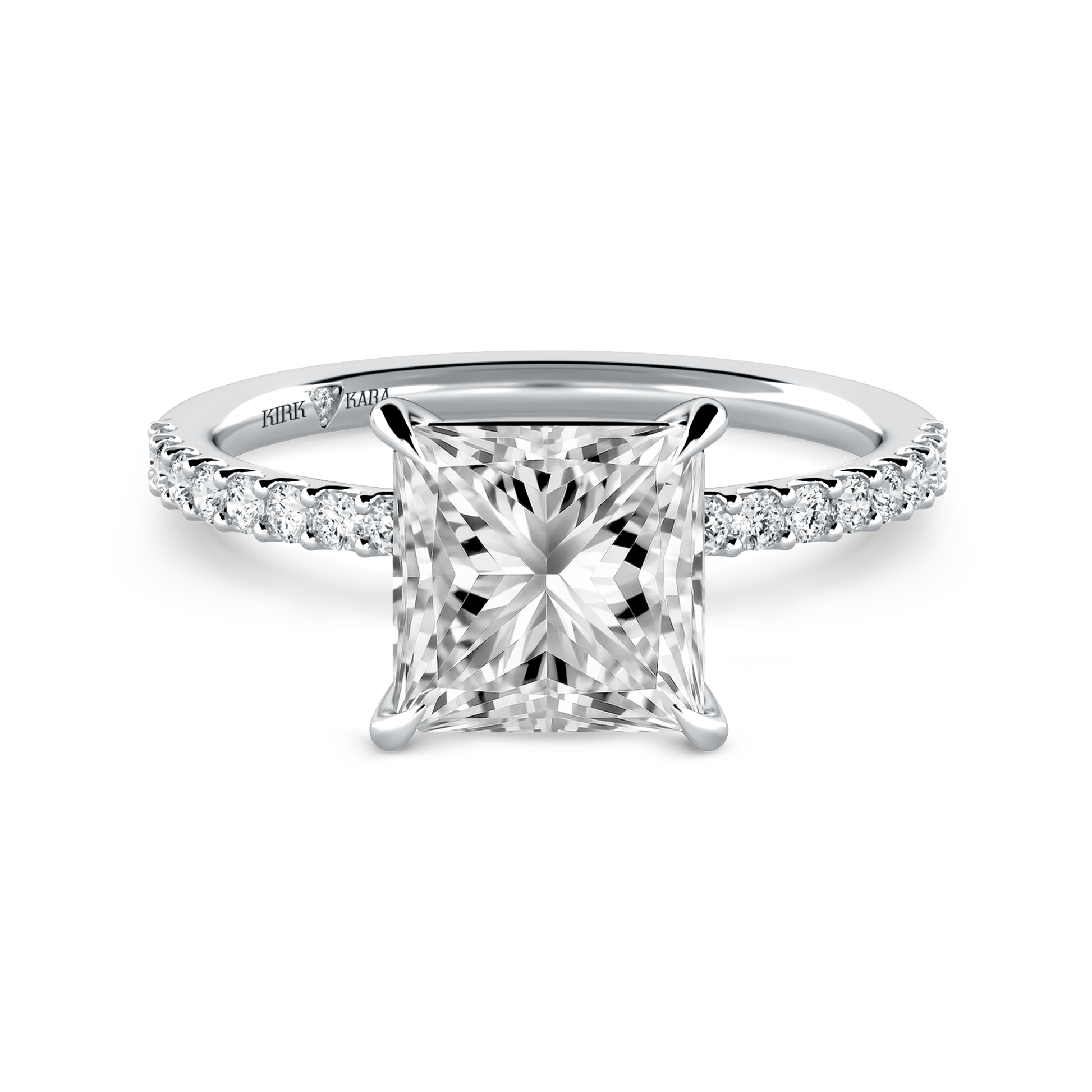 This classic diamond solitaire ring is an exclusive design from Kirk Kara. It features 1/5 ctw of lab grown diamond accents. This engagement ring arrives complete, set with a Princess lab grown center diamond. Available with your choice of of center stone sizes 2.00ct - 4.00ct.