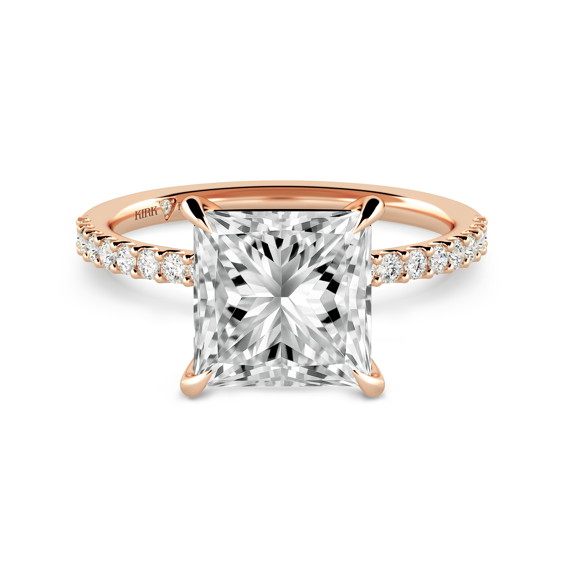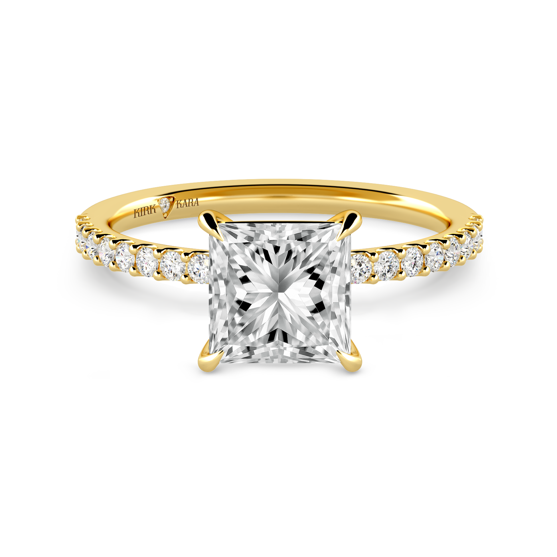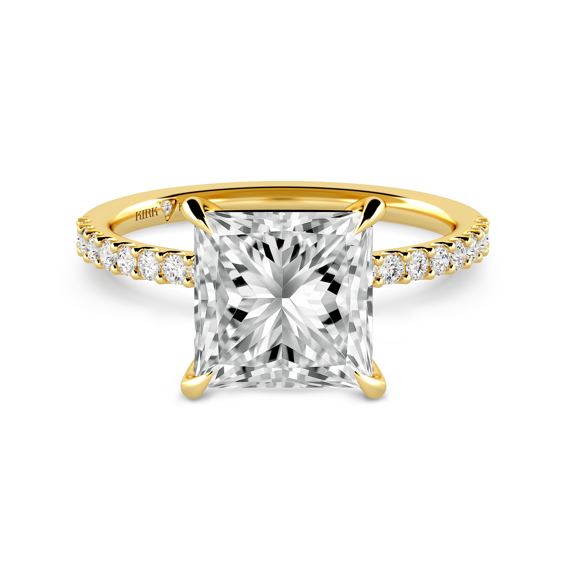 This classic diamond solitaire ring is an exclusive design from Kirk Kara. It features 1/5 ctw of lab grown diamond accents. This engagement ring arrives complete, set with a Princess lab grown center diamond. Available with your choice of of center stone sizes 2.00ct - 4.00ct.
