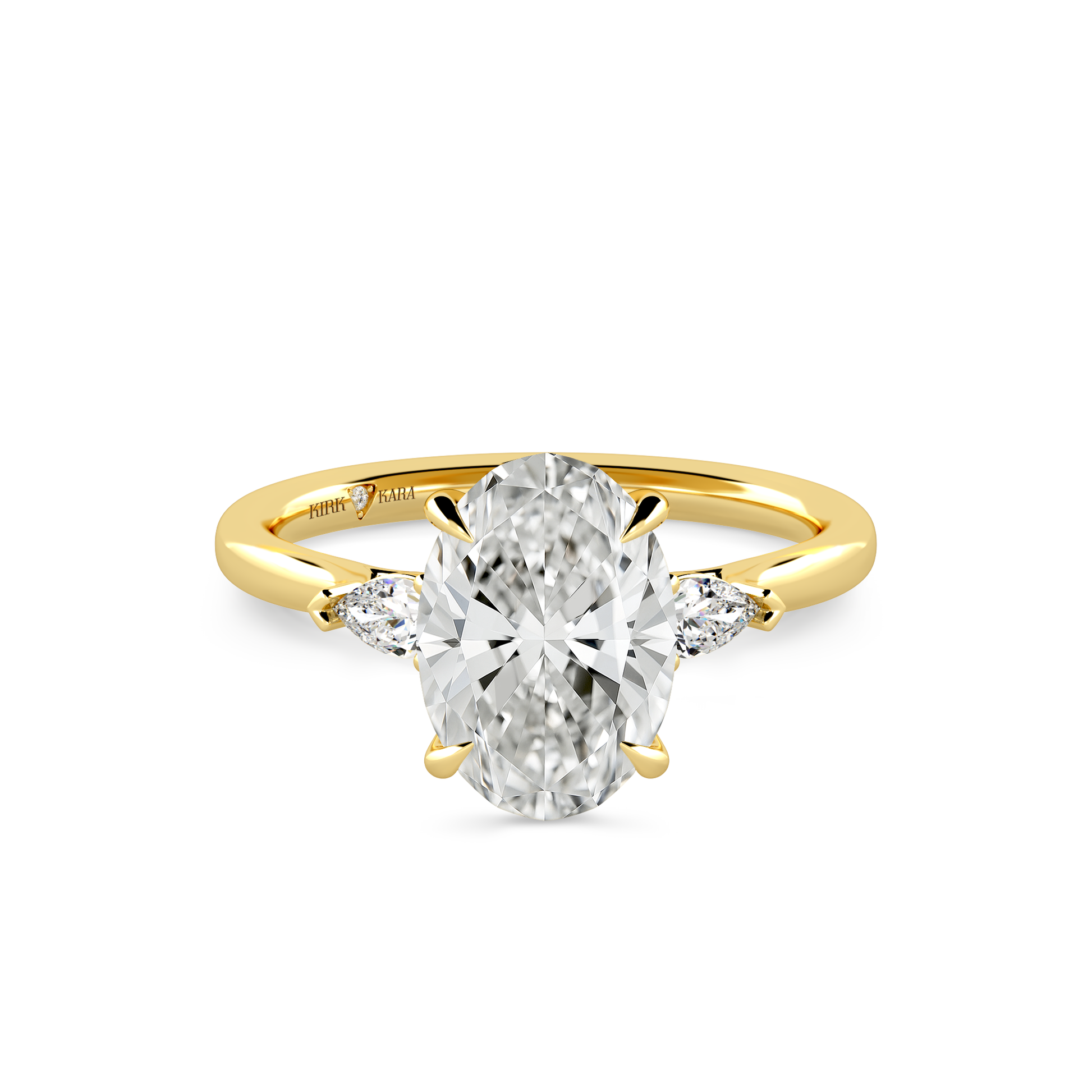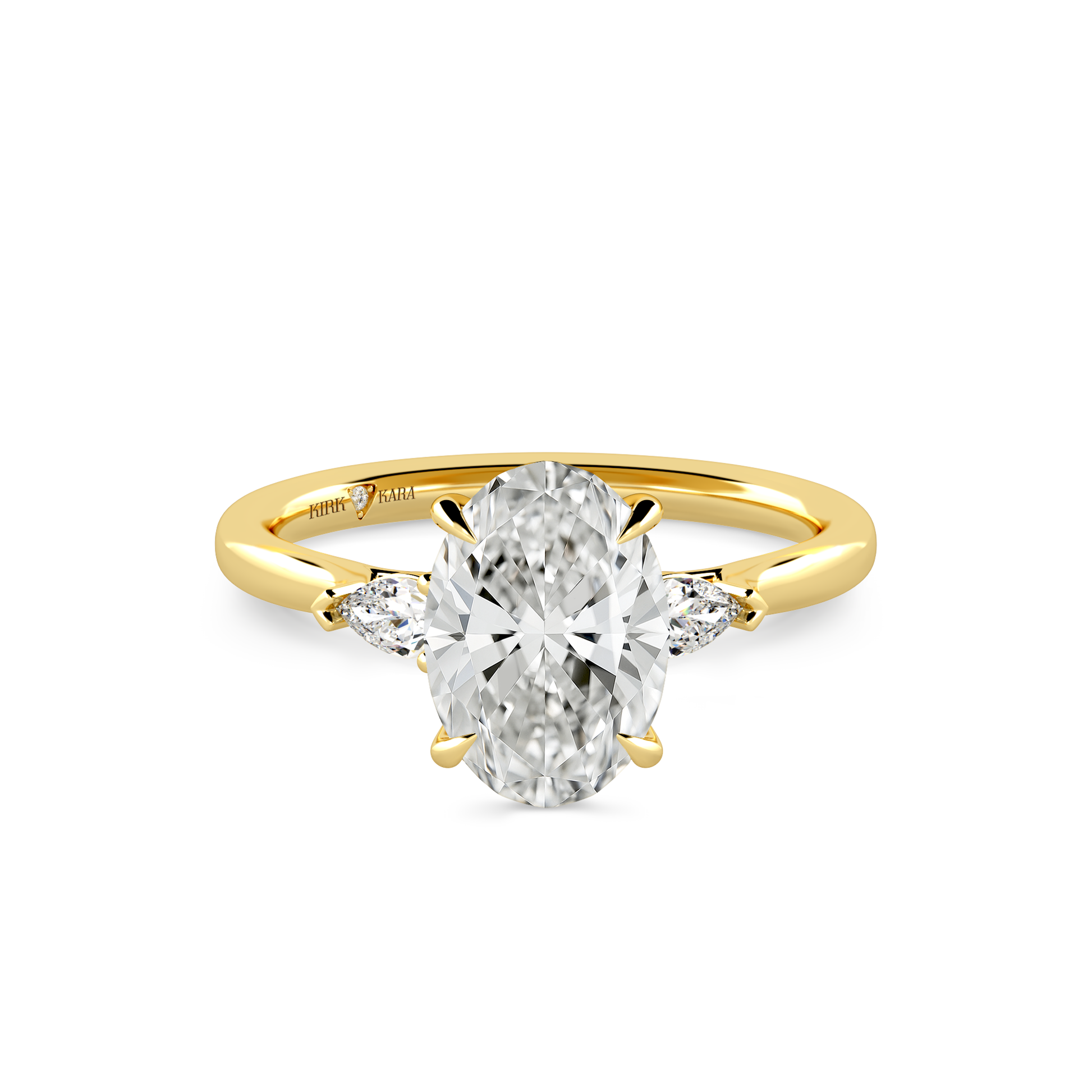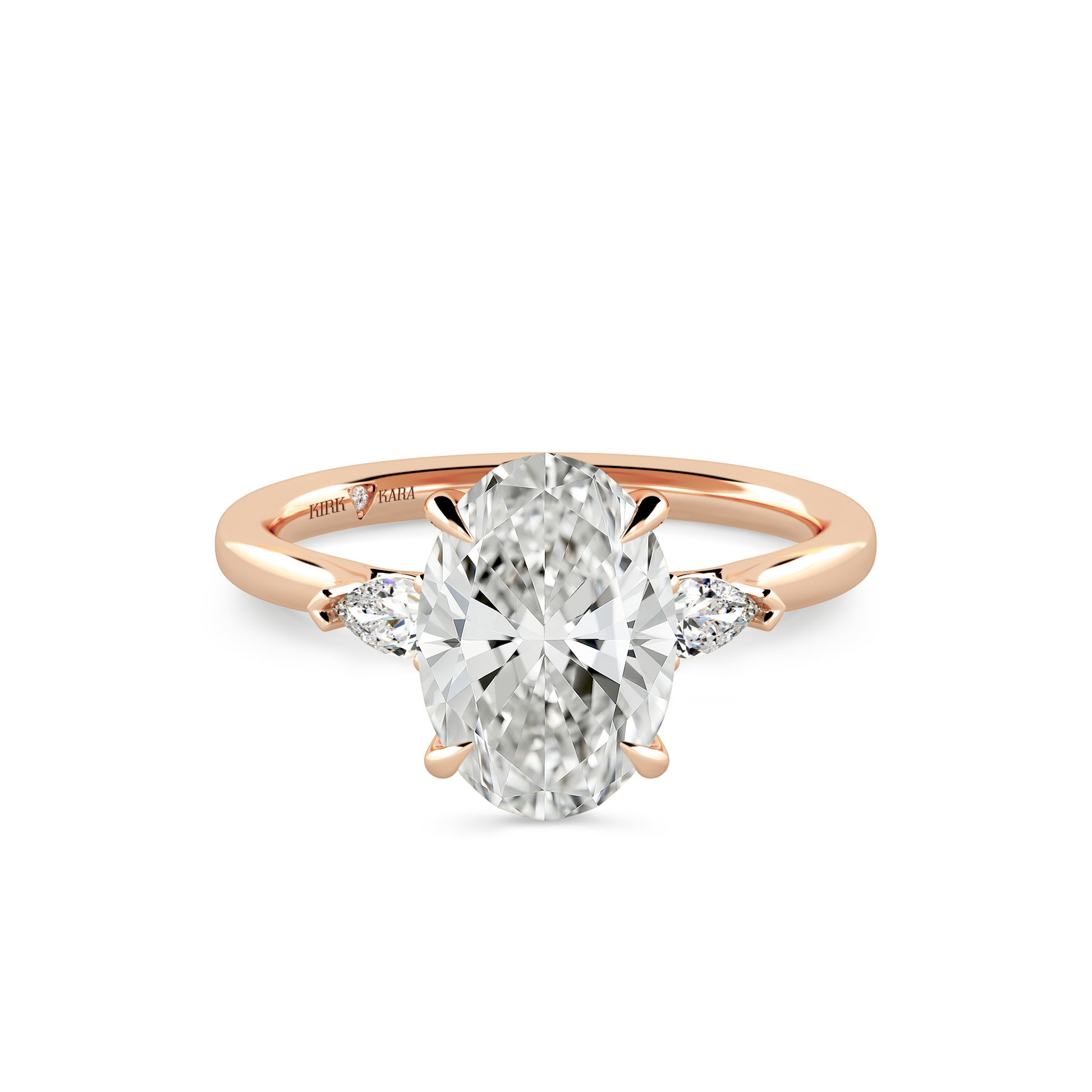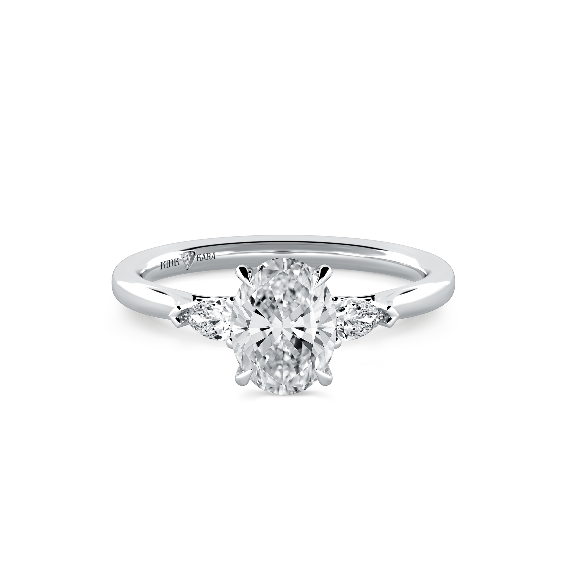 This classic diamond three stone ring is an exclusive design from Kirk Kara. It features 1/5 ctw of lab grown pear diamond accents. This engagement ring arrives complete, set with an Oval lab grown center diamond. Available with your choice of of center stone sizes 1.00ct - 4.00ct.