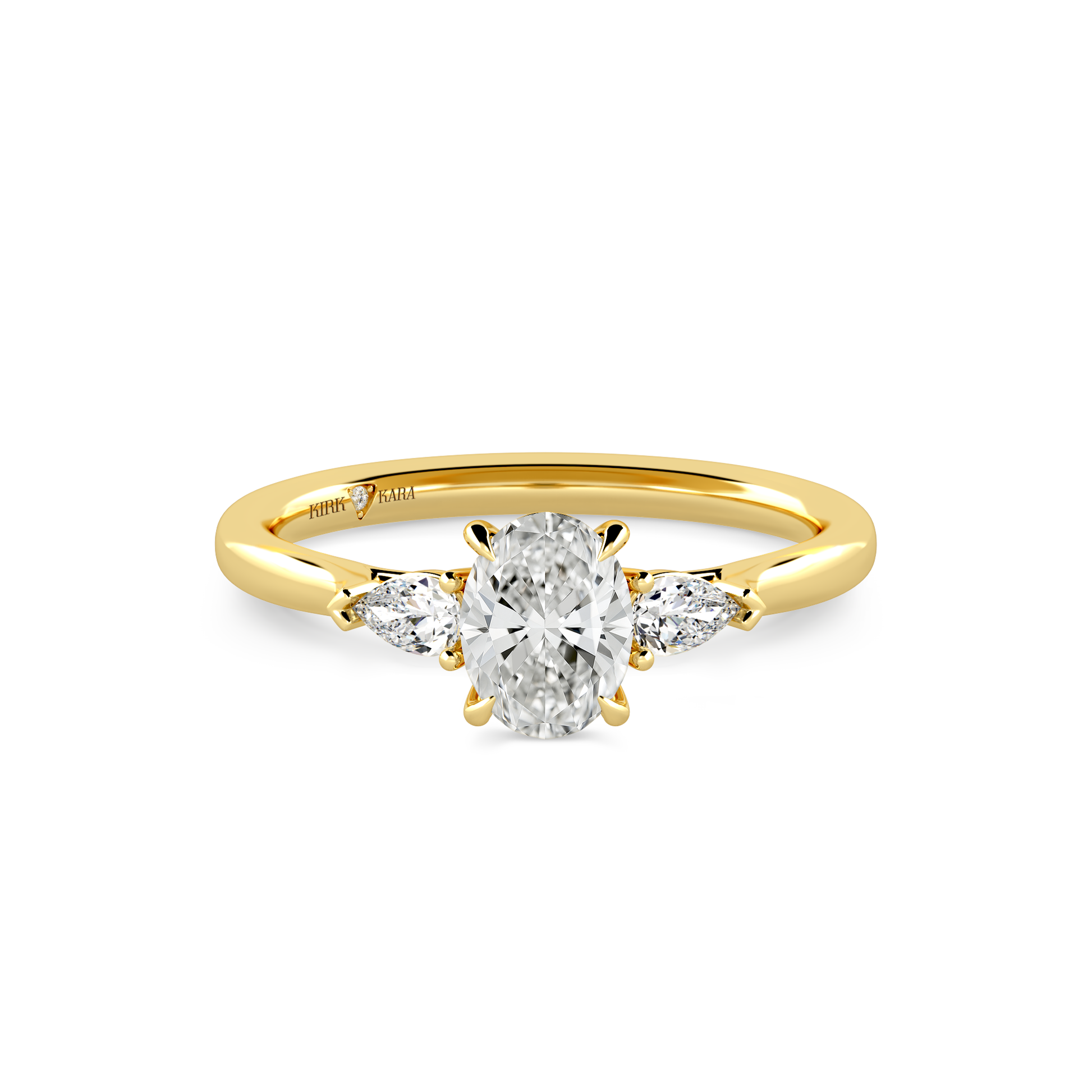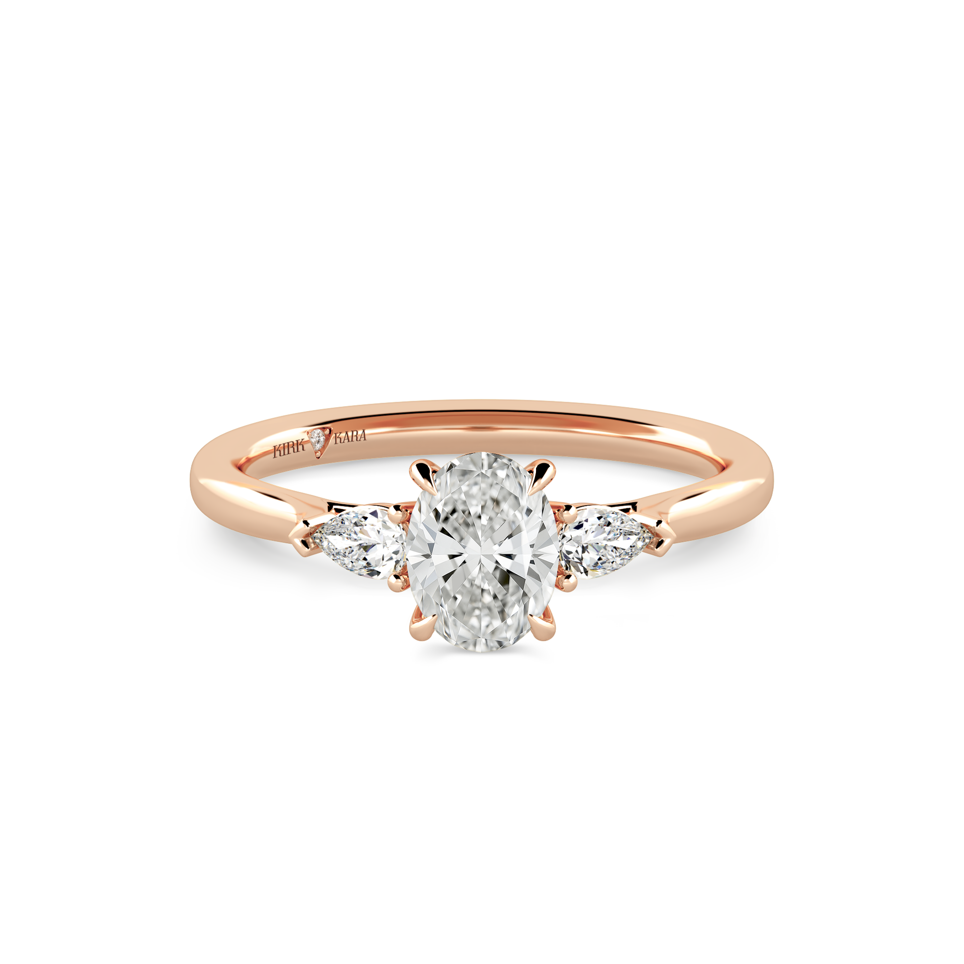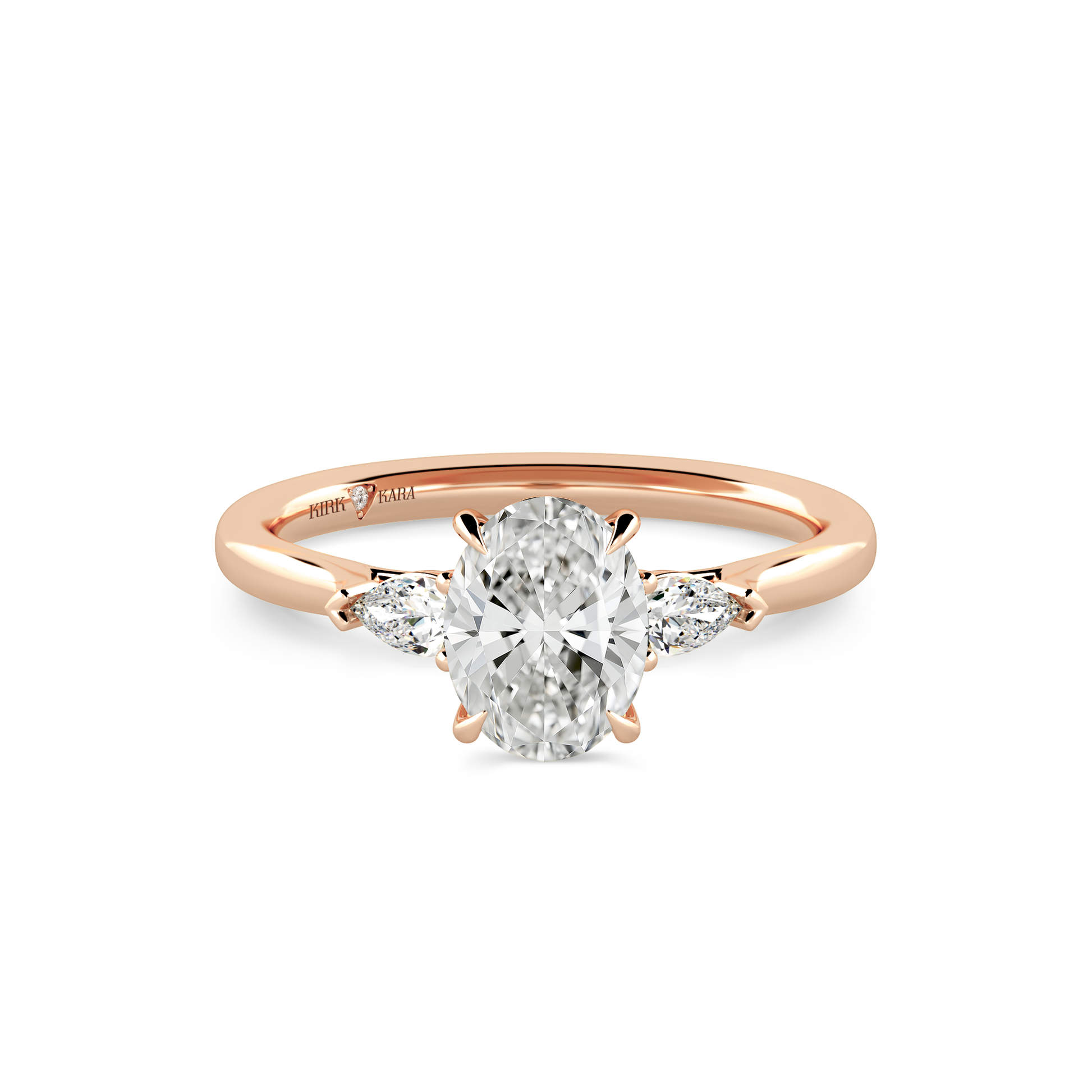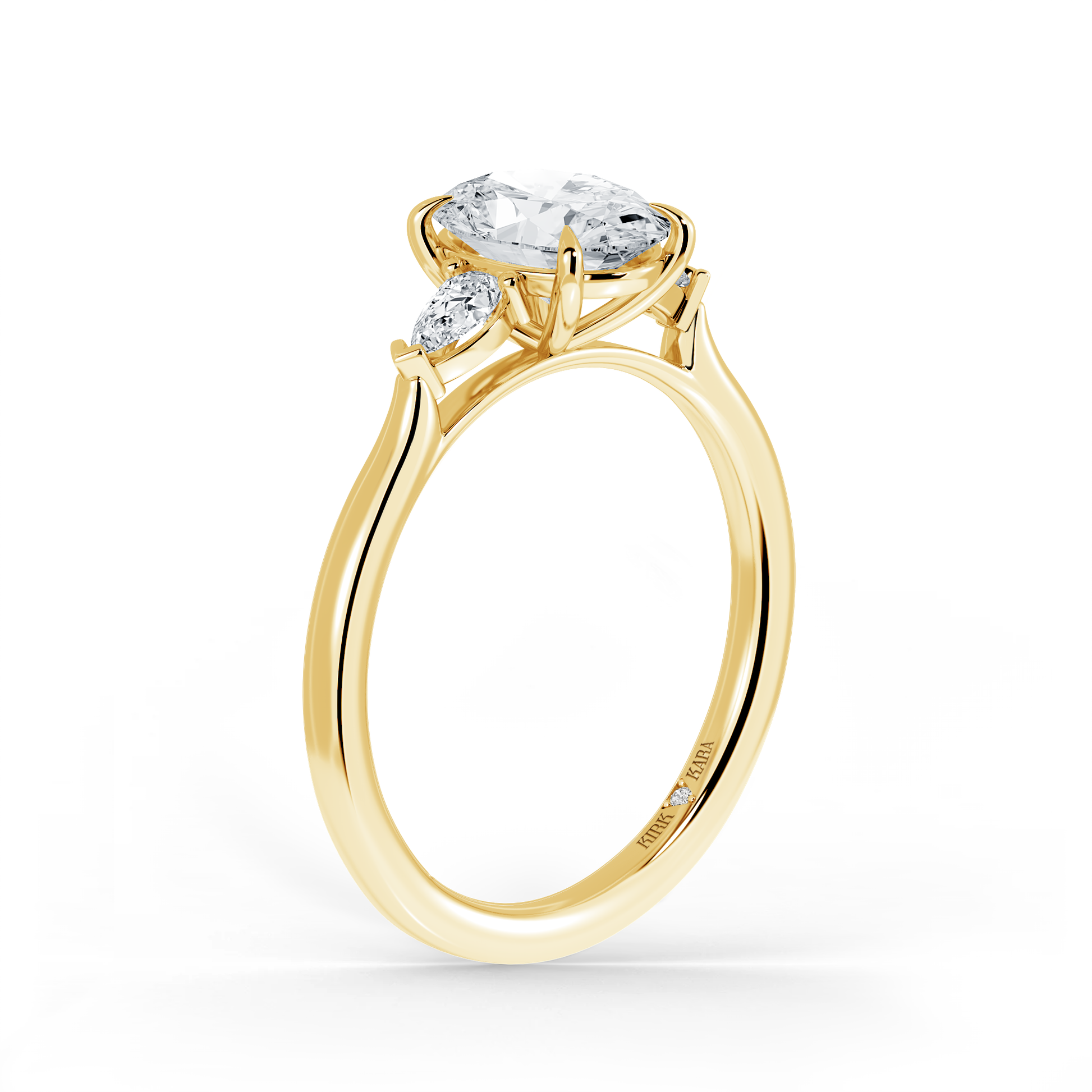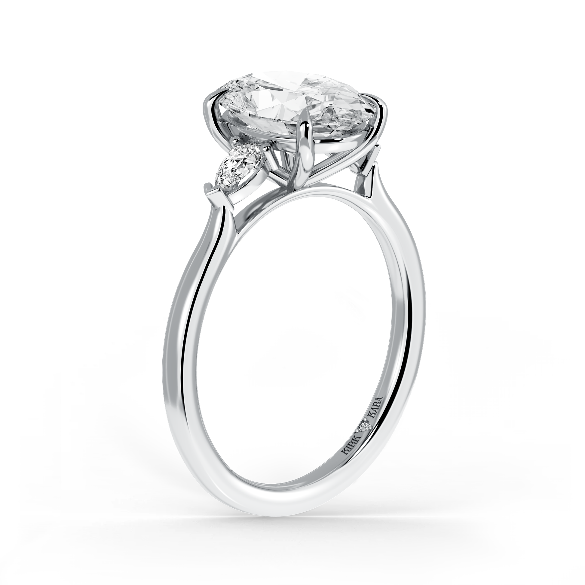 This classic diamond three stone ring is an exclusive design from Kirk Kara. It features 1/5 ctw of lab grown pear diamond accents. This engagement ring arrives complete, set with an Oval lab grown center diamond. Available with your choice of of center stone sizes 1.00ct - 4.00ct.