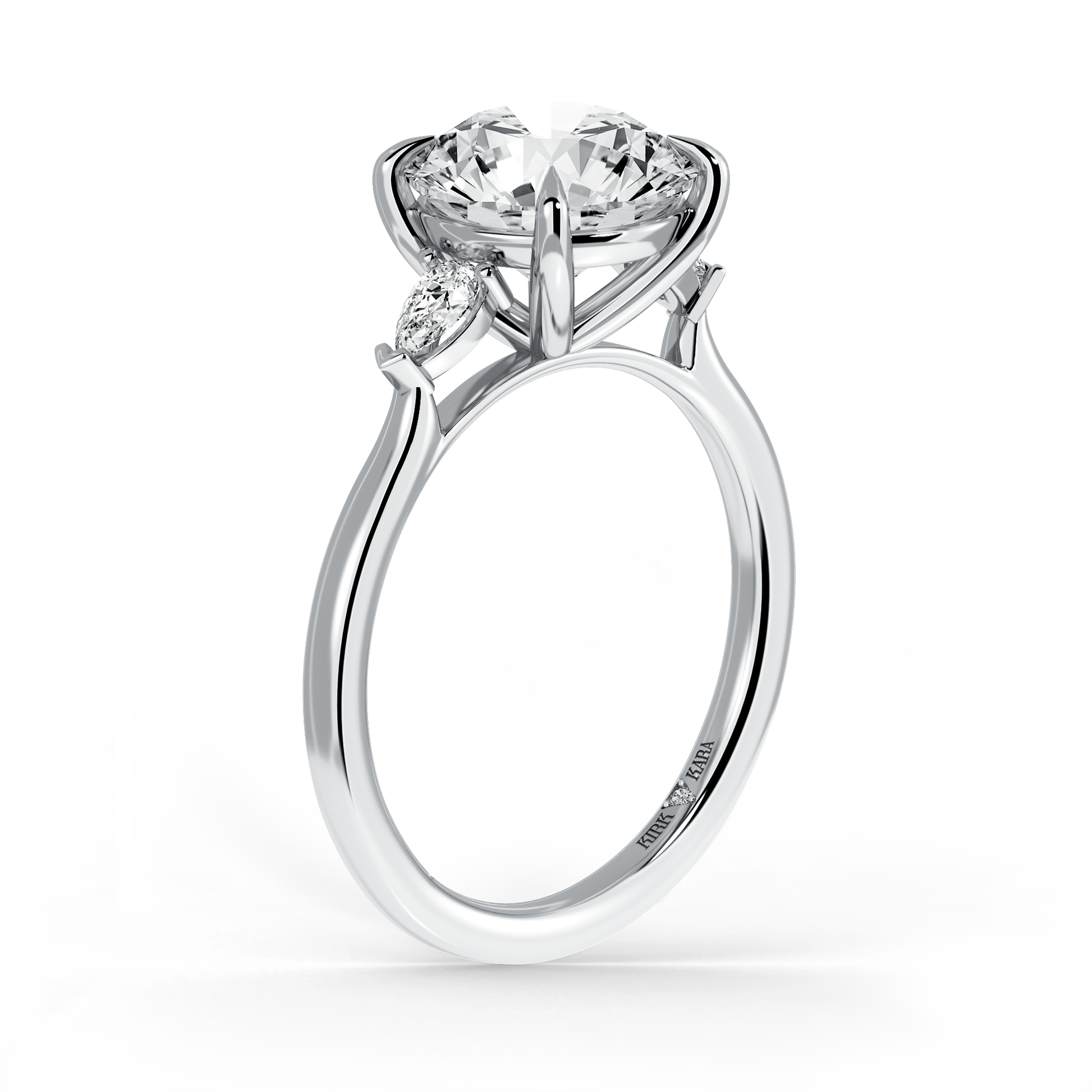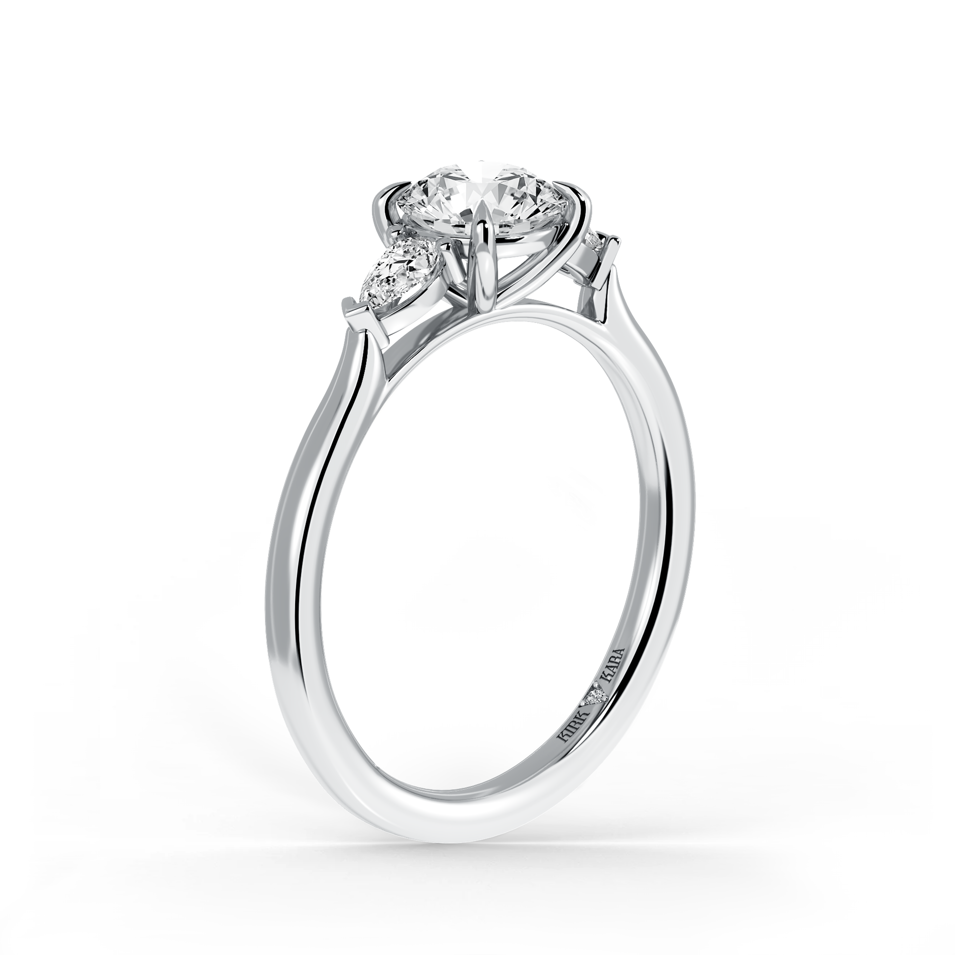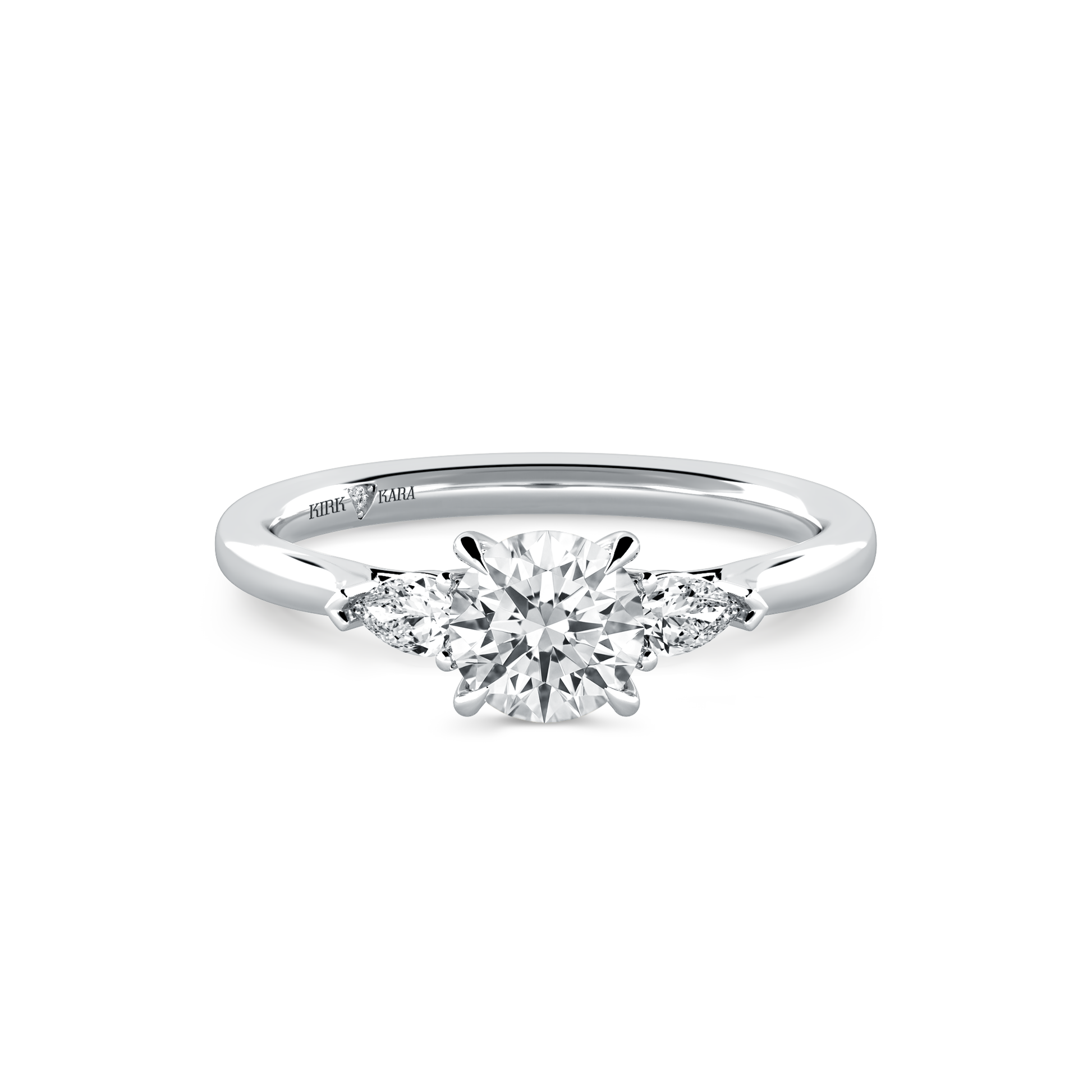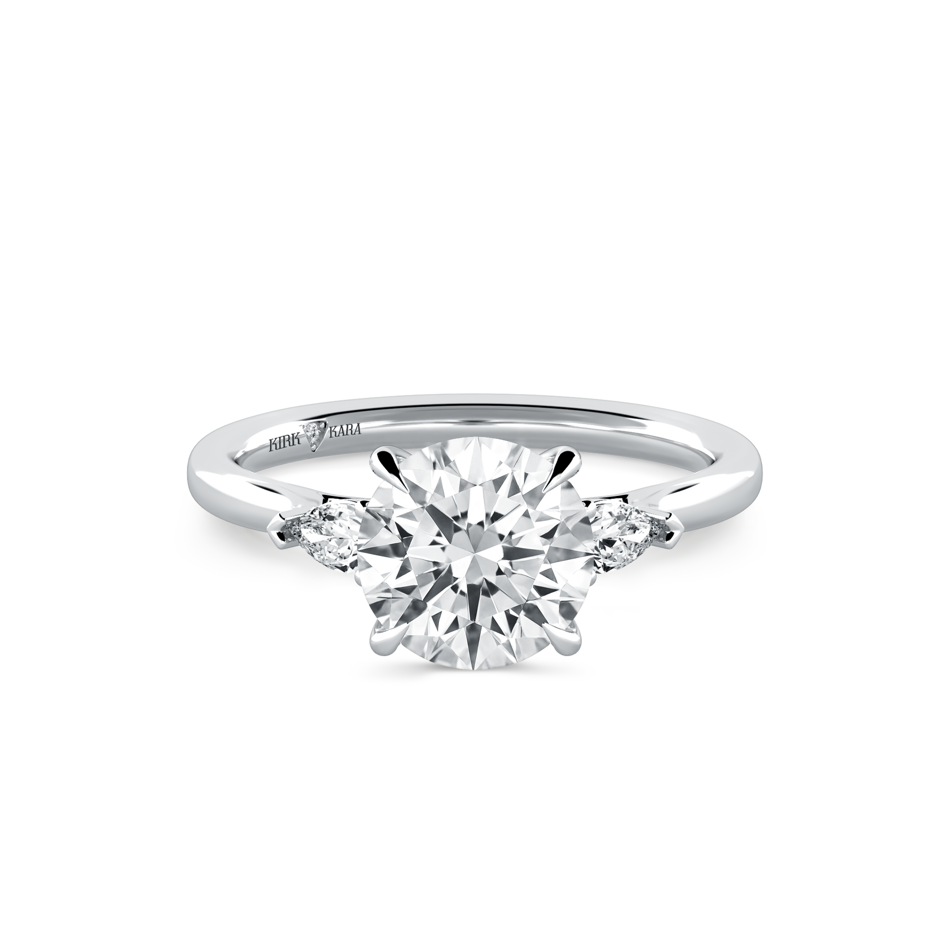 This classic diamond three stone ring is an exclusive design from Kirk Kara. It features 1/5 ctw of lab grown pear diamond accents. This engagement ring arrives complete, set with a Round lab grown center diamond. Available with your choice of of center stone sizes 1.00ct - 4.00ct.