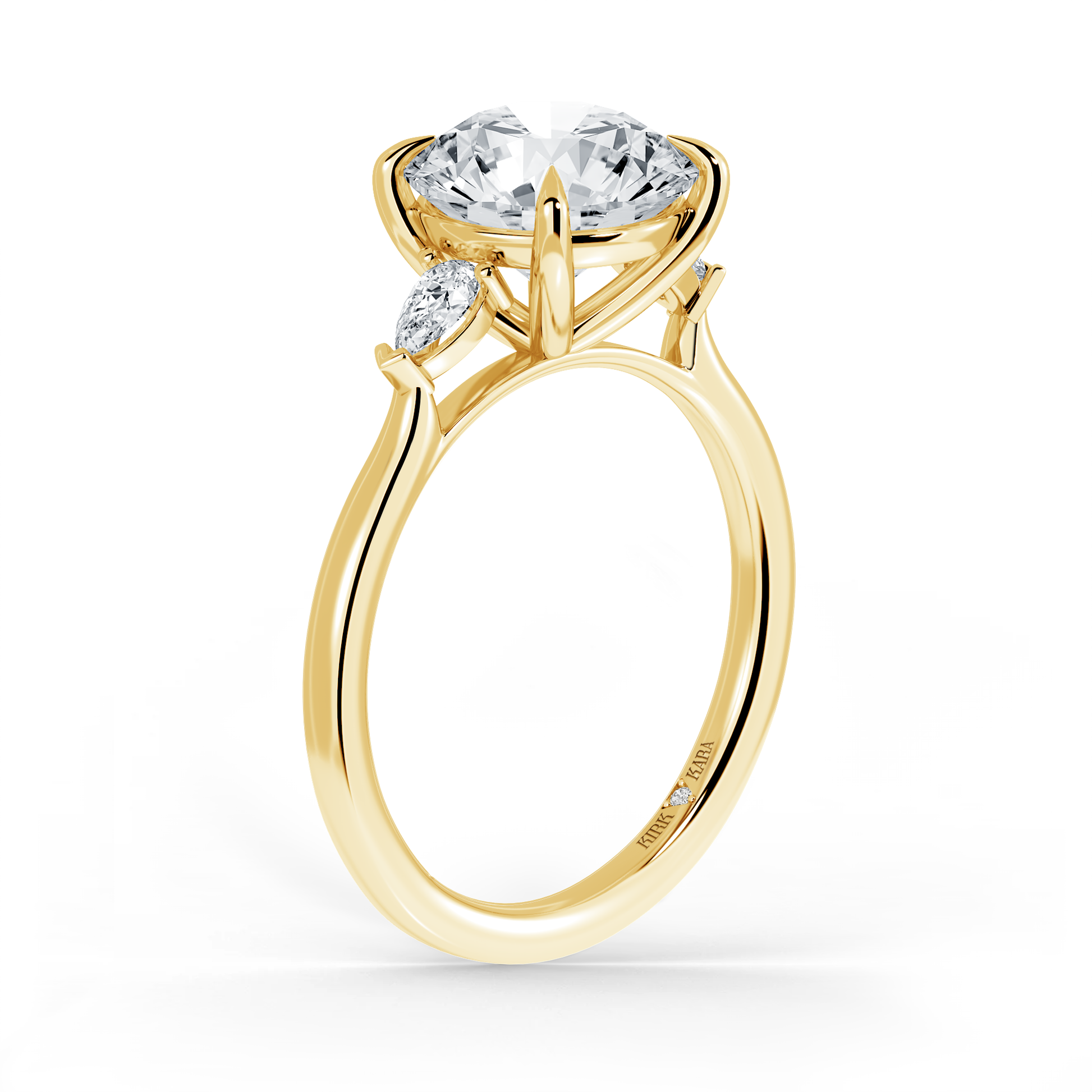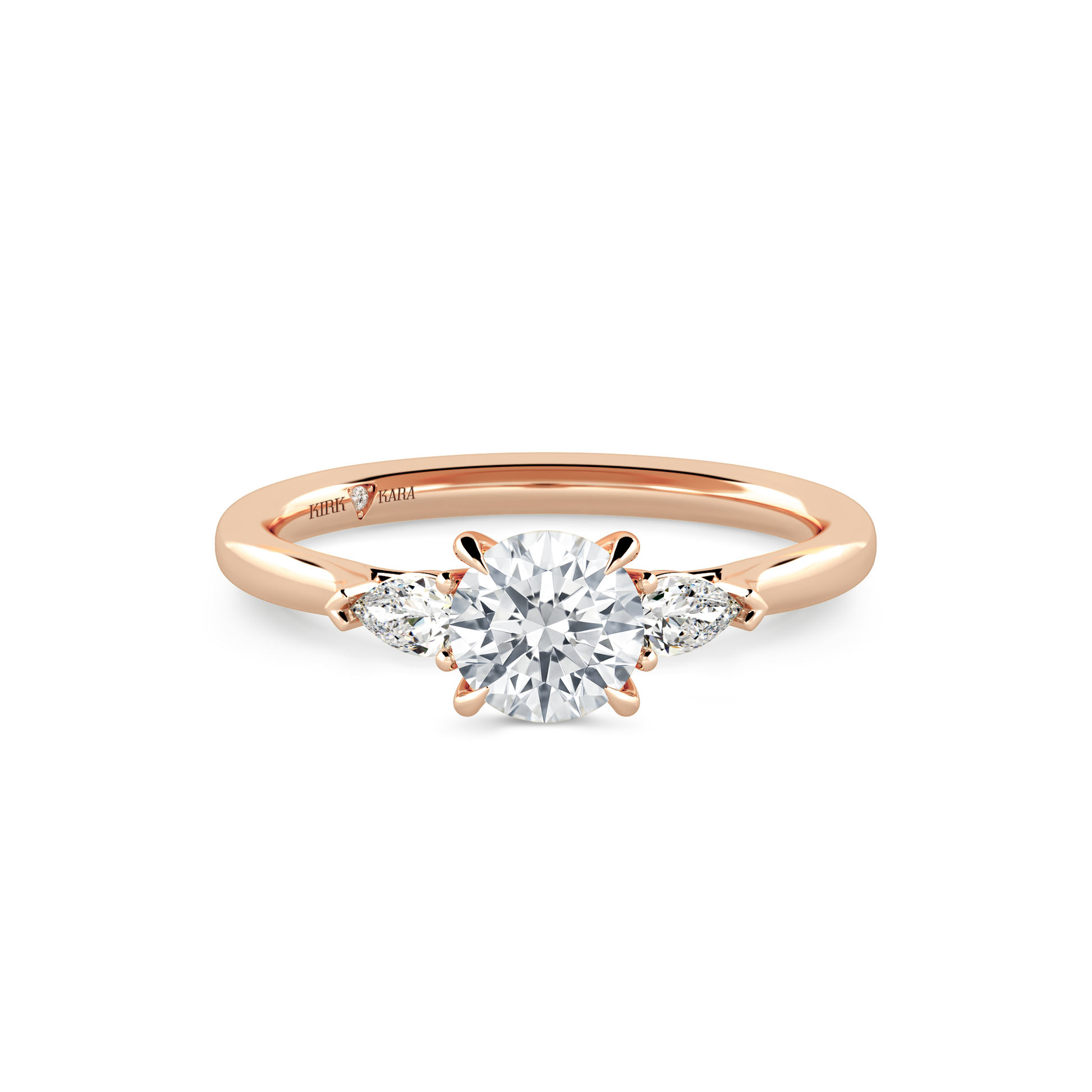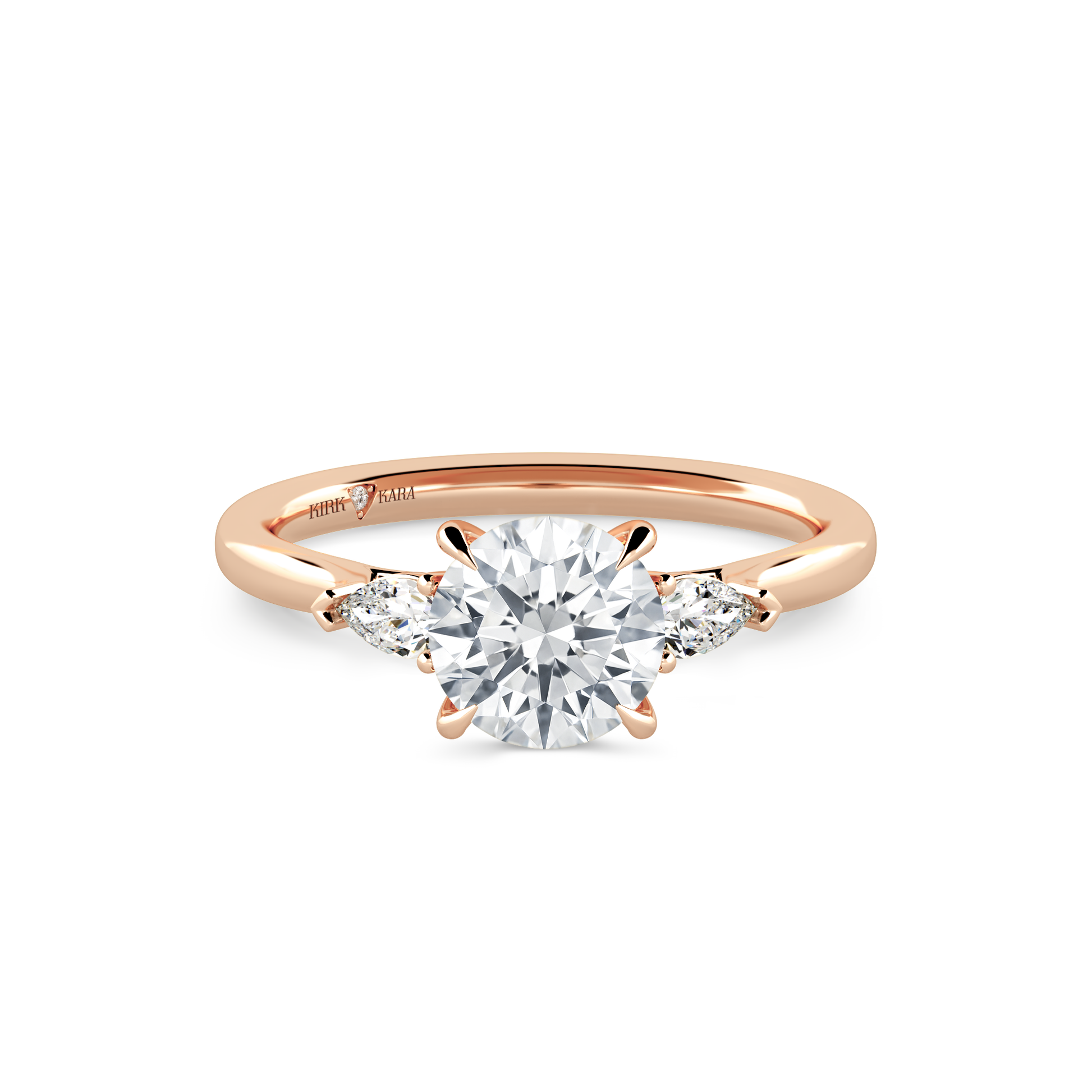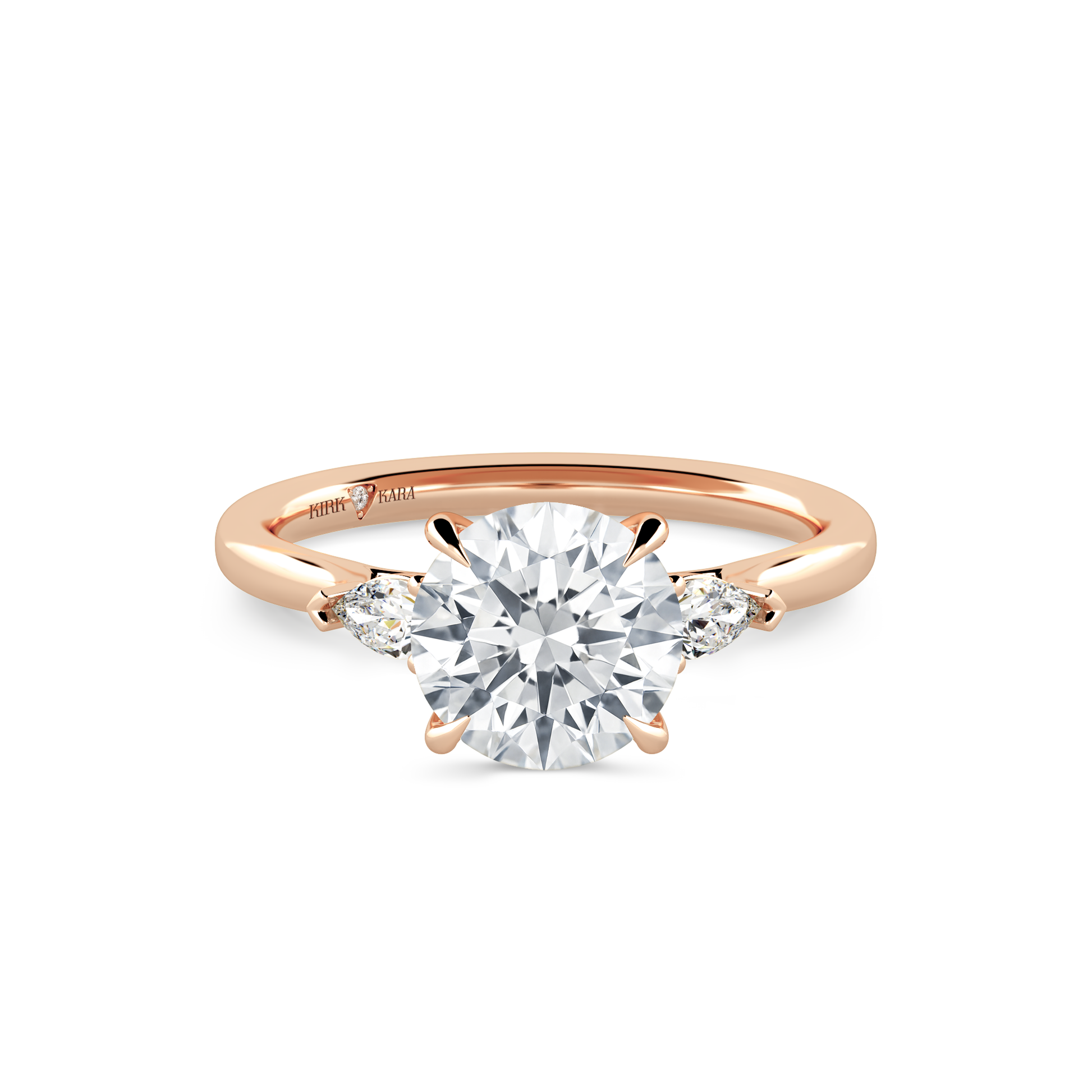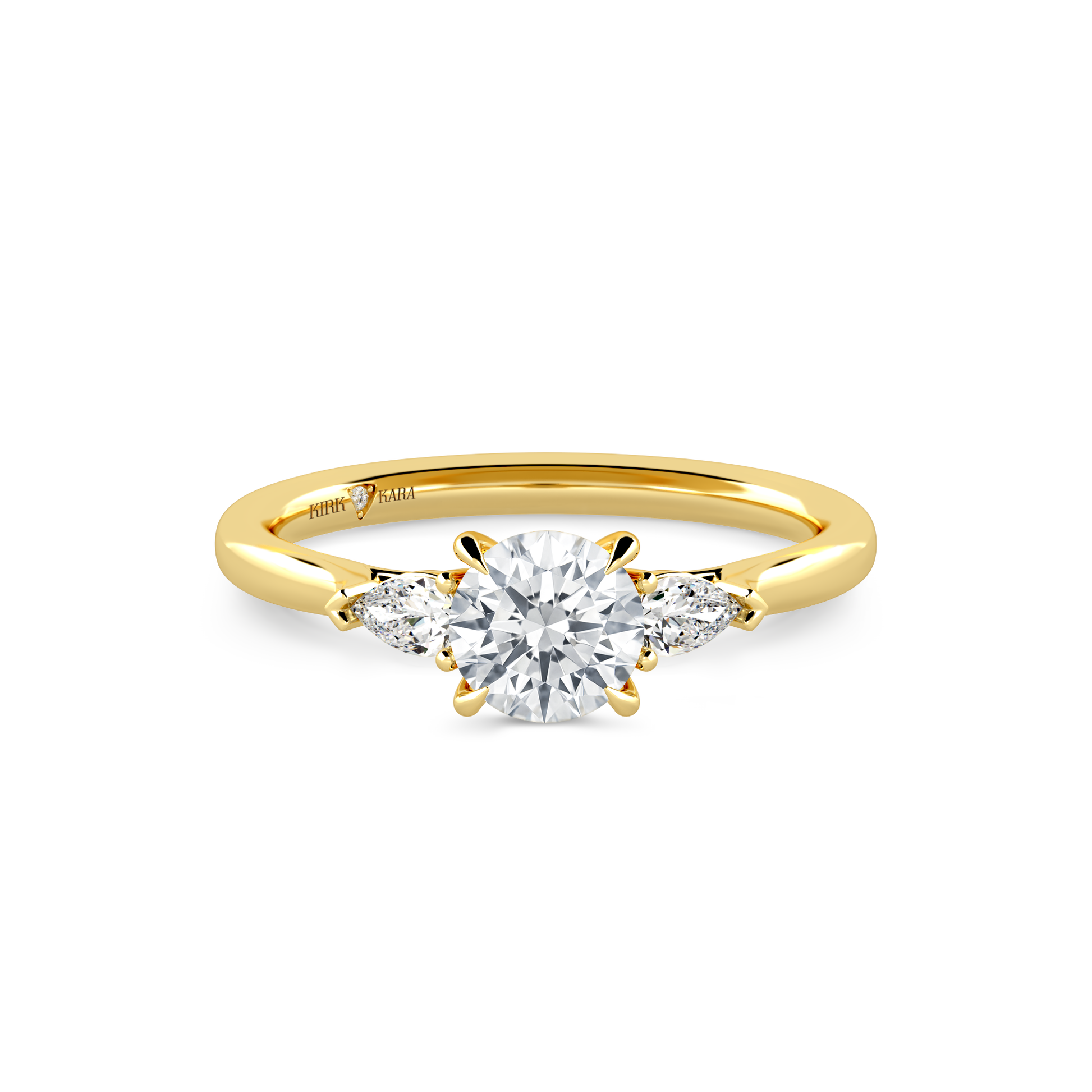 This classic diamond three stone ring is an exclusive design from Kirk Kara. It features 1/5 ctw of lab grown pear diamond accents. This engagement ring arrives complete, set with a Round lab grown center diamond. Available with your choice of of center stone sizes 1.00ct - 4.00ct.