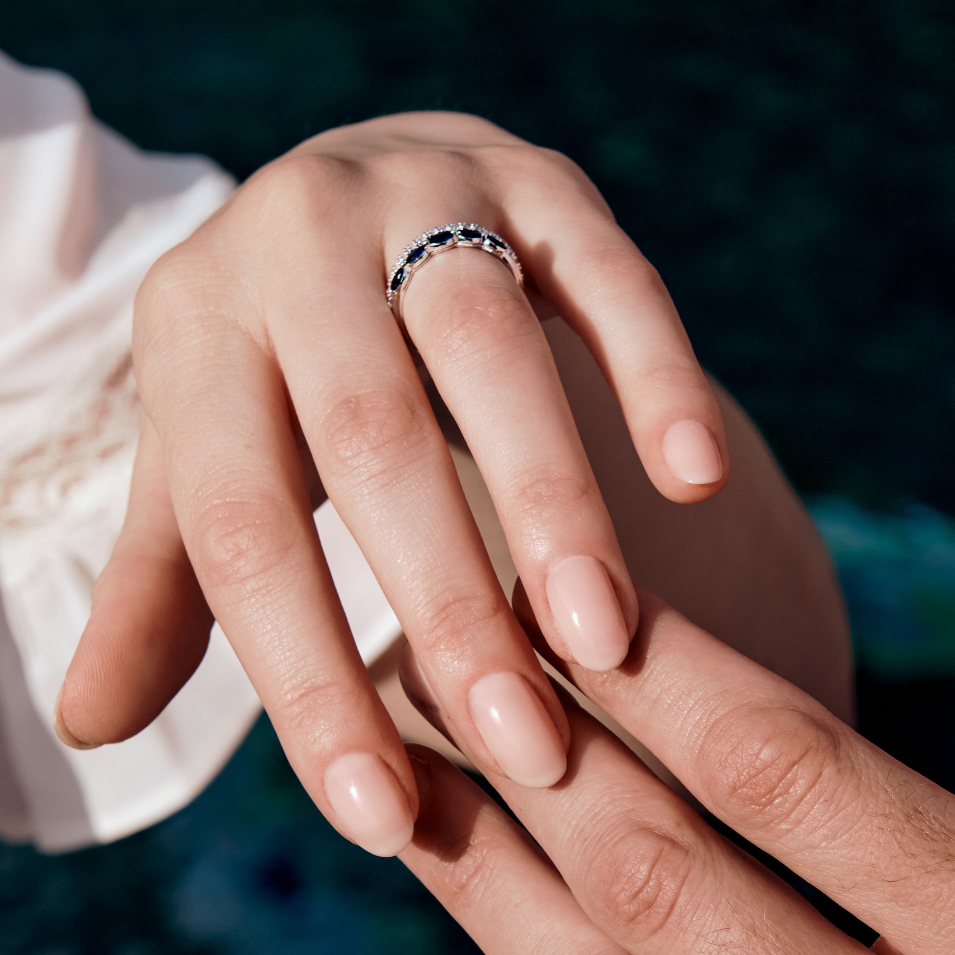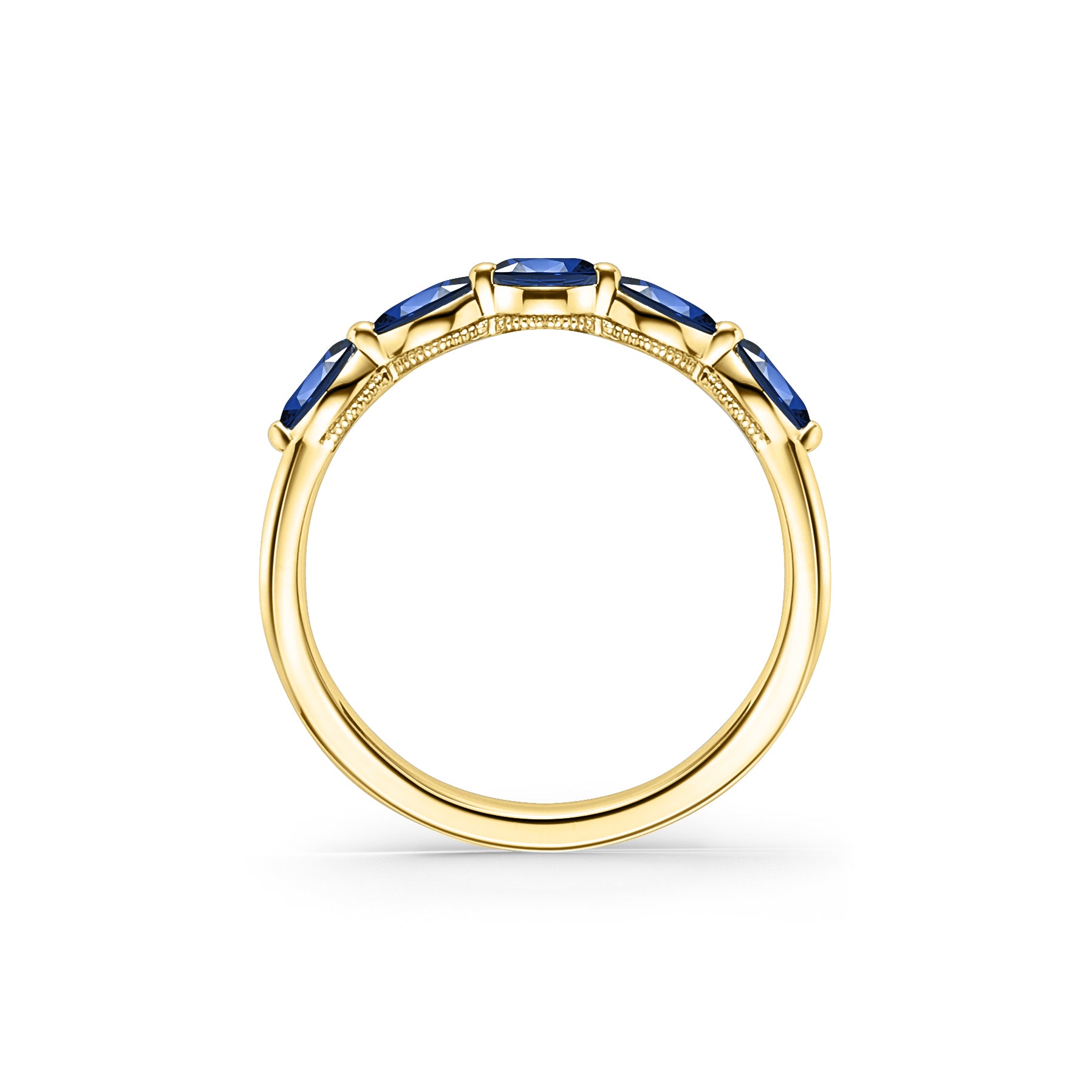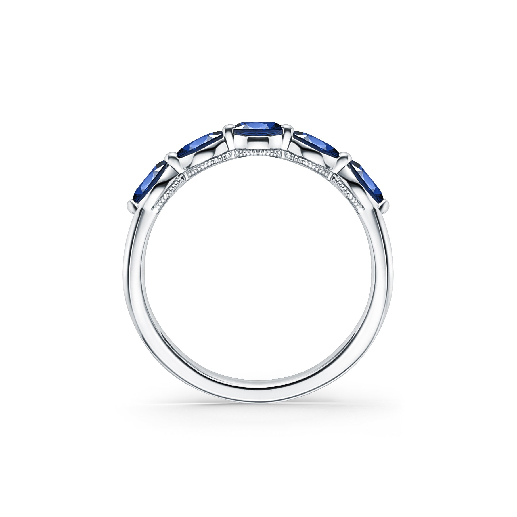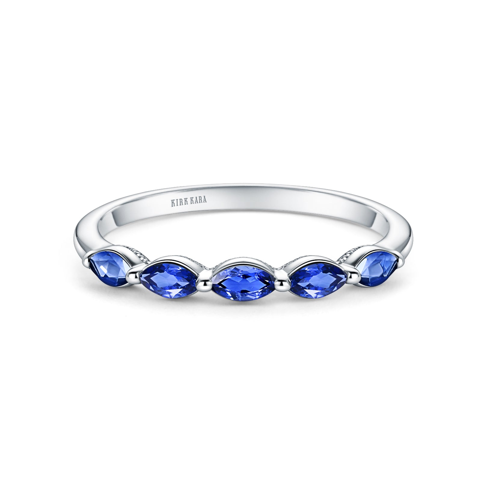 This timeless classic is a ladies' band from the Stella collection. It features natural blue sapphire marquise and signature handcrafted milgrain edging.