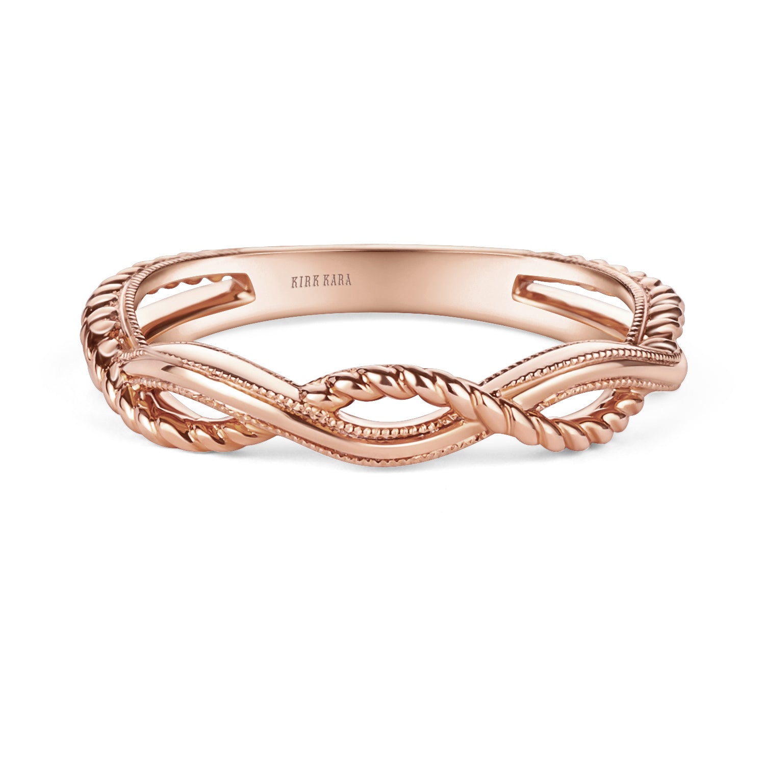 This romantic design is a split shank ladies' band from the Pirouetta collection. It features a twisted rope detail and milgrain details.
