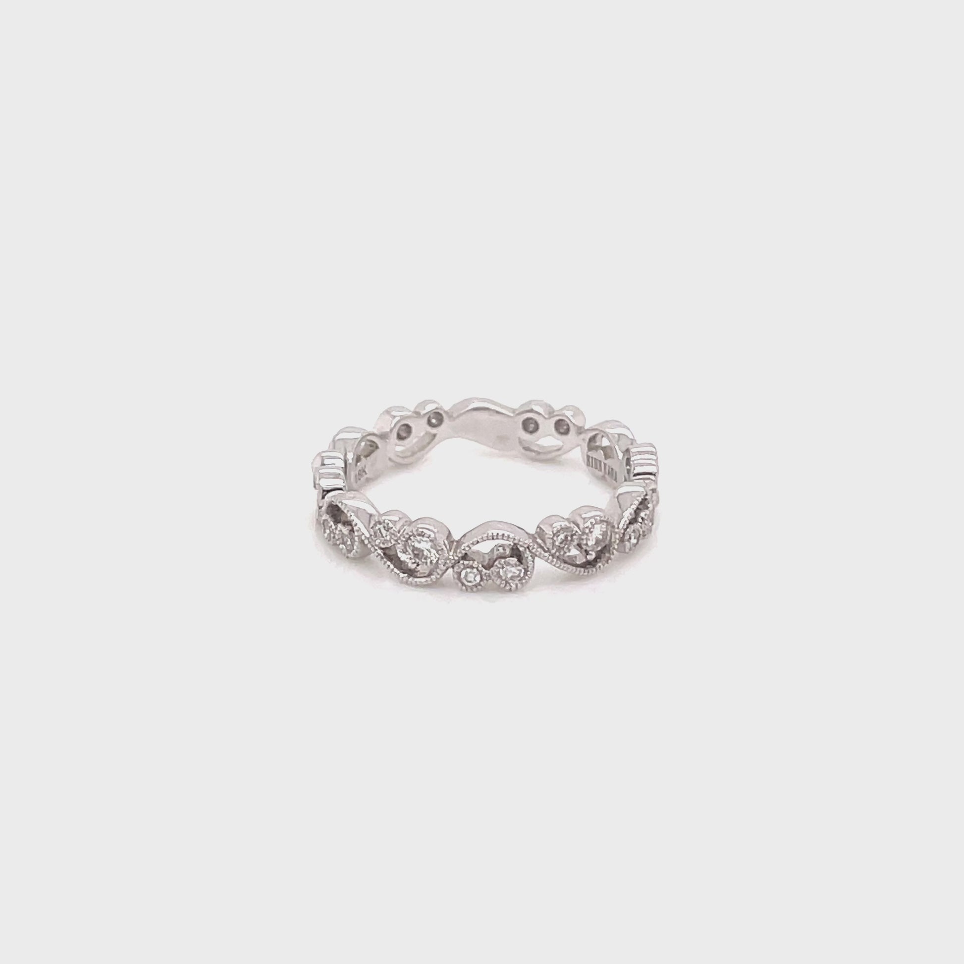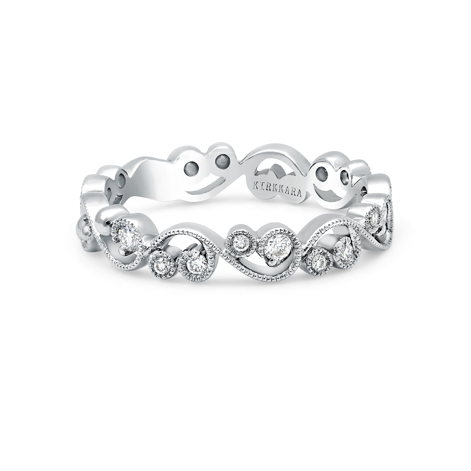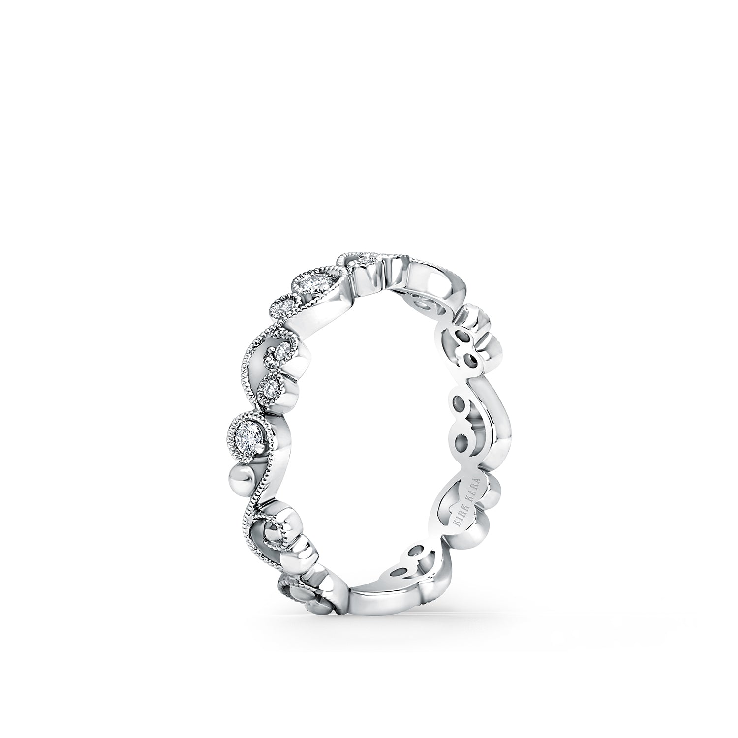 This whimsically chic, artistic design is a wedding band from the Angelique collection. It features 1/6 ctw of diamonds and signature handcrafted milgrain edging. Both lab grown and natural diamonds are available for this band.