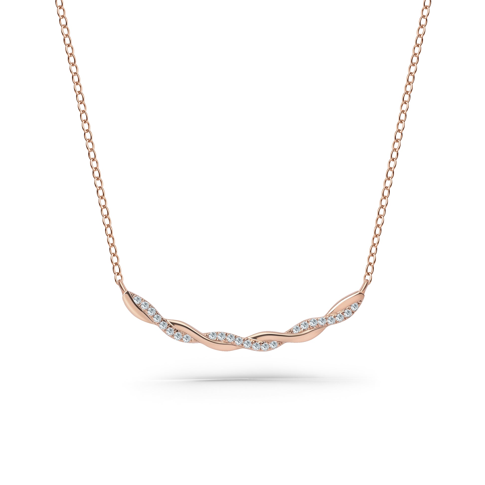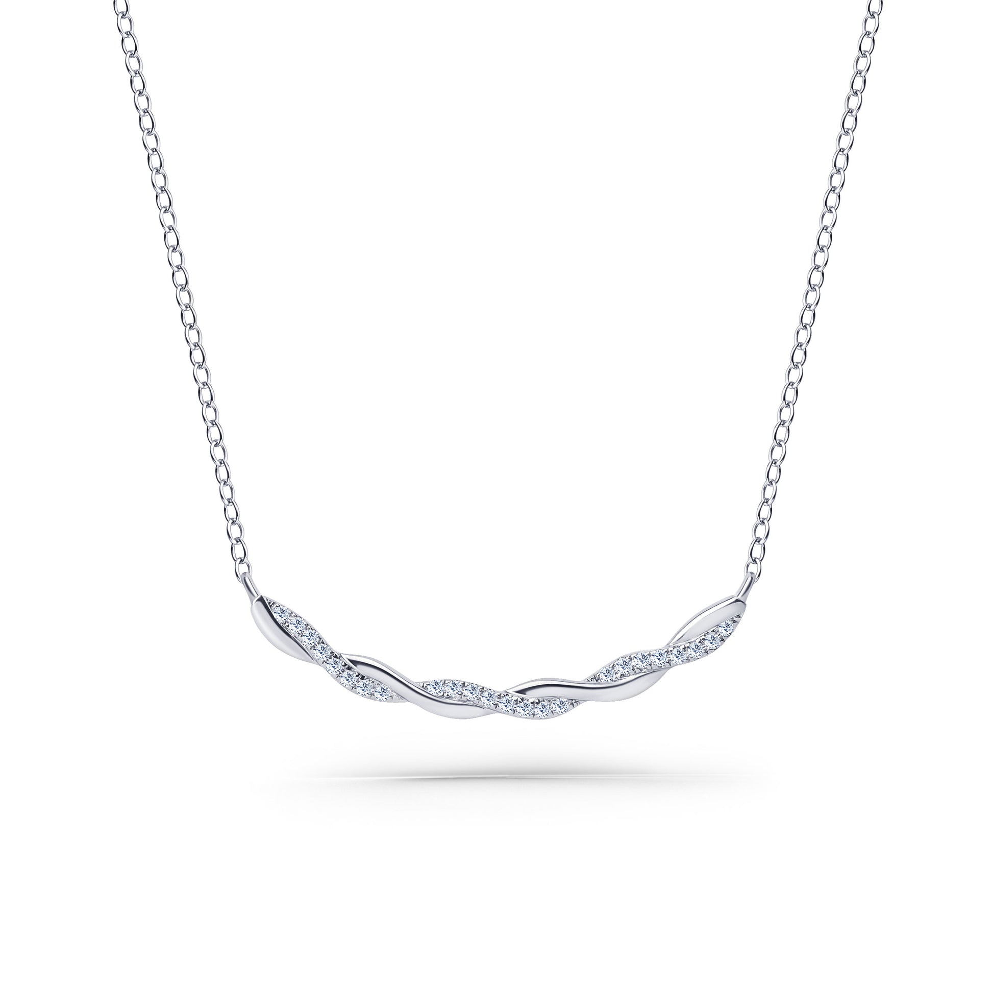 This romantic design is a twisted bar necklace from the Pirouetta collection. It features 1/10 ctw of diamonds. Both lab grown and natural diamonds are available for this necklace. This necklace comes complete with an 18-inch chain.