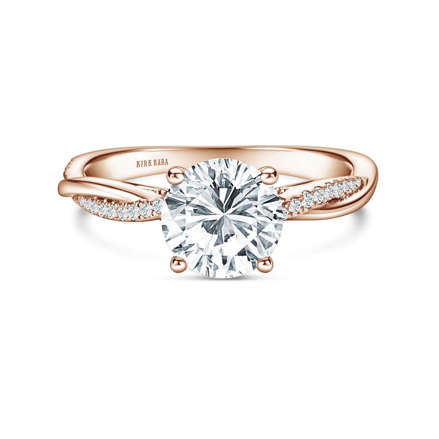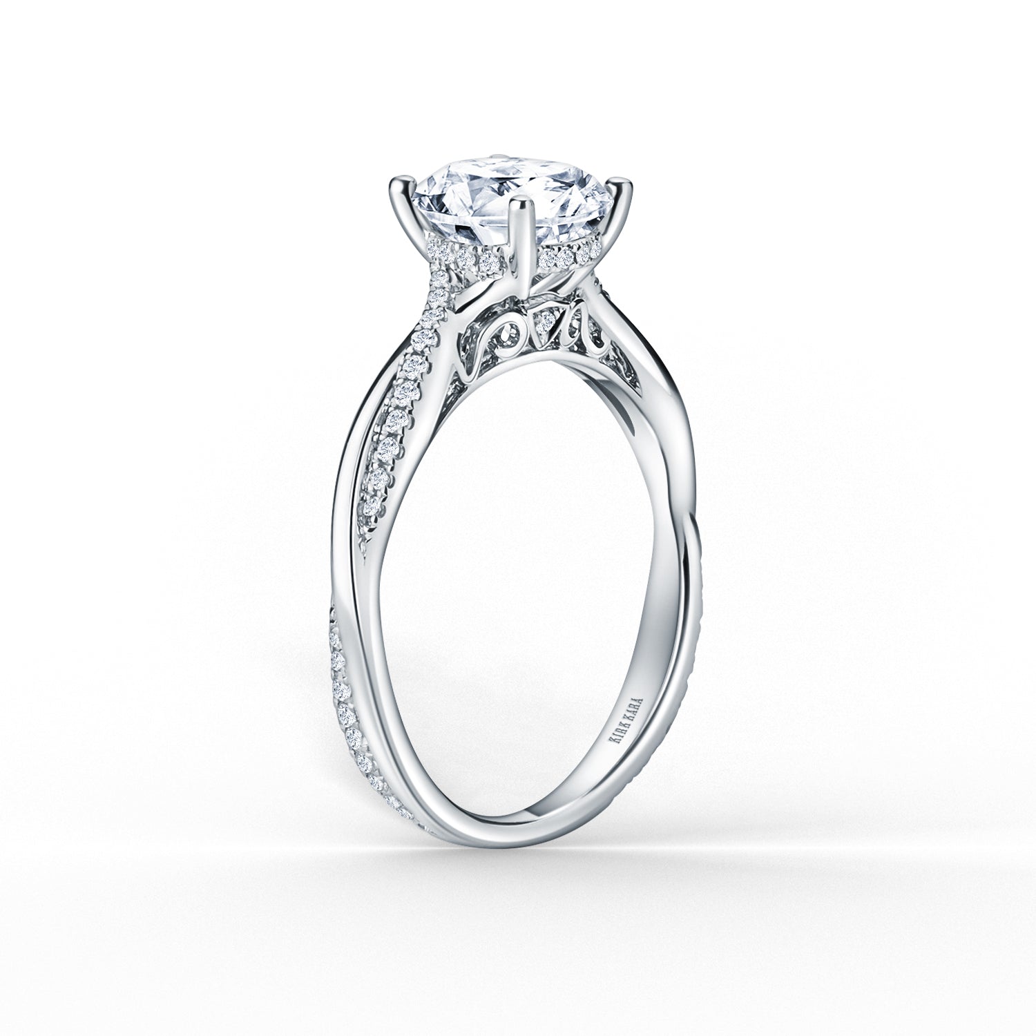 This romantic design is a split shank engagement ring from the Pirouetta collection. It features 1/5 ctw of diamonds. The signature handcrafted details include signature filigree and peek-a-boo diamonds. Both lab grown and natural diamonds are available for this setting. Ring as shown fits a 1.50 carat round cut stone. All center stone sizes and shapes are possible.