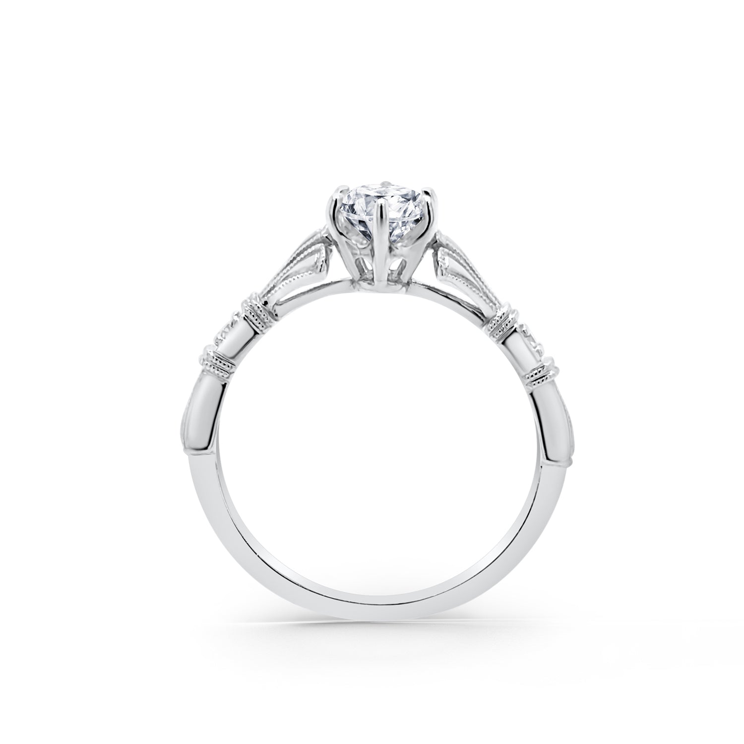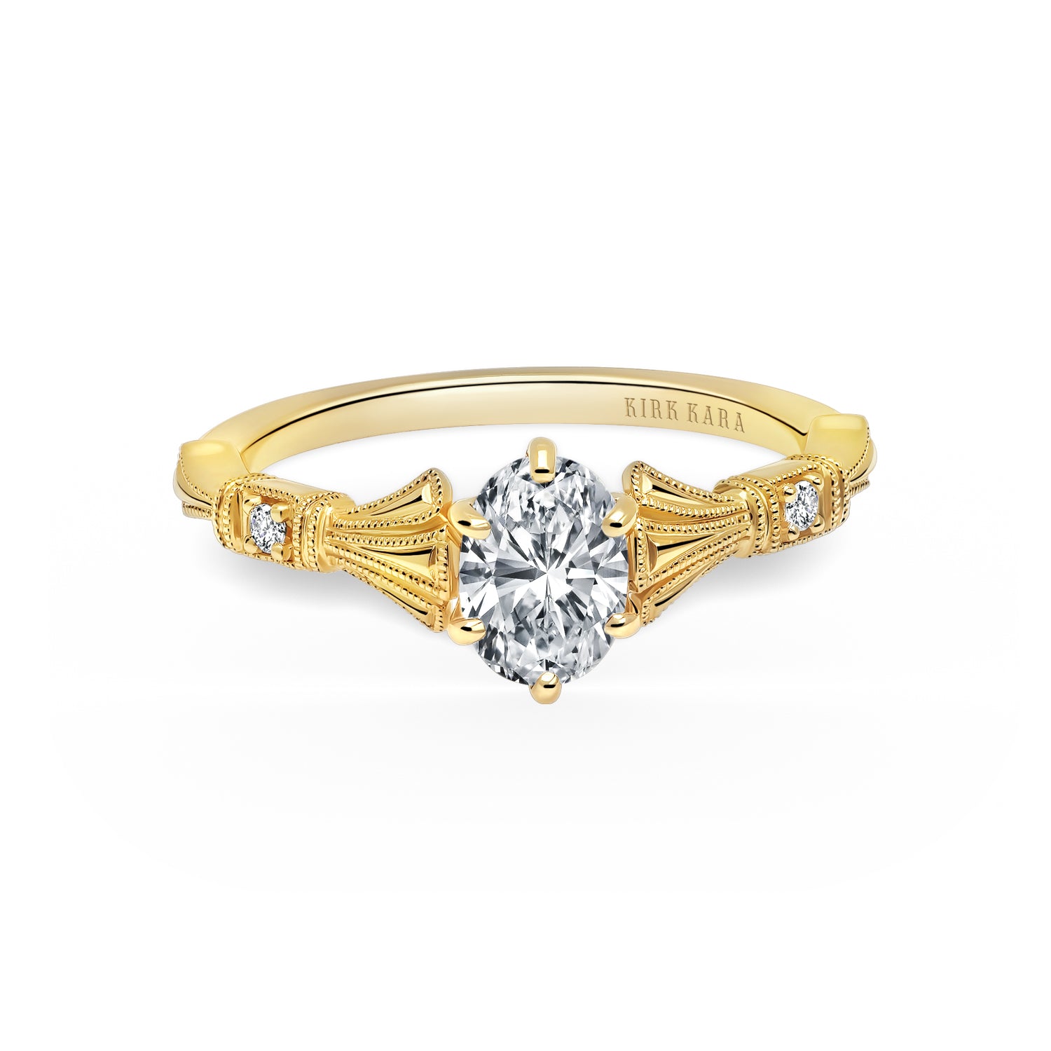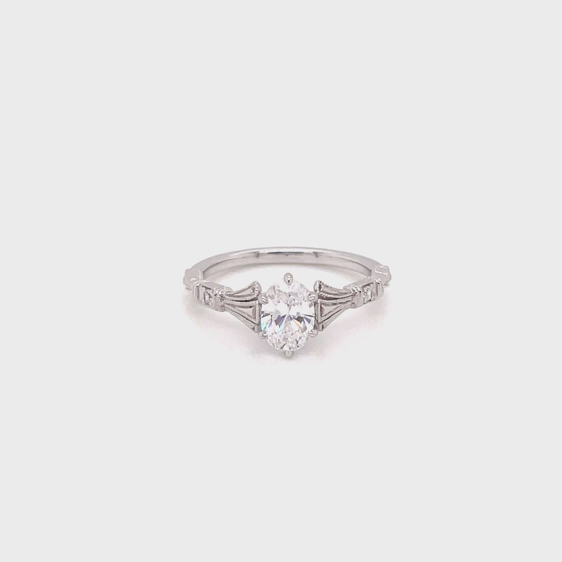 This deco inspired classic is an artistic design from the Lori collection. It features 0.02 ctw of diamonds. The signature handcrafted details include signature filigree and milgrain edging. Both lab grown and natural diamonds are available for this setting. Ring as shown fits a 1.00 carat oval cut stone. All center stone sizes and shapes are possible.