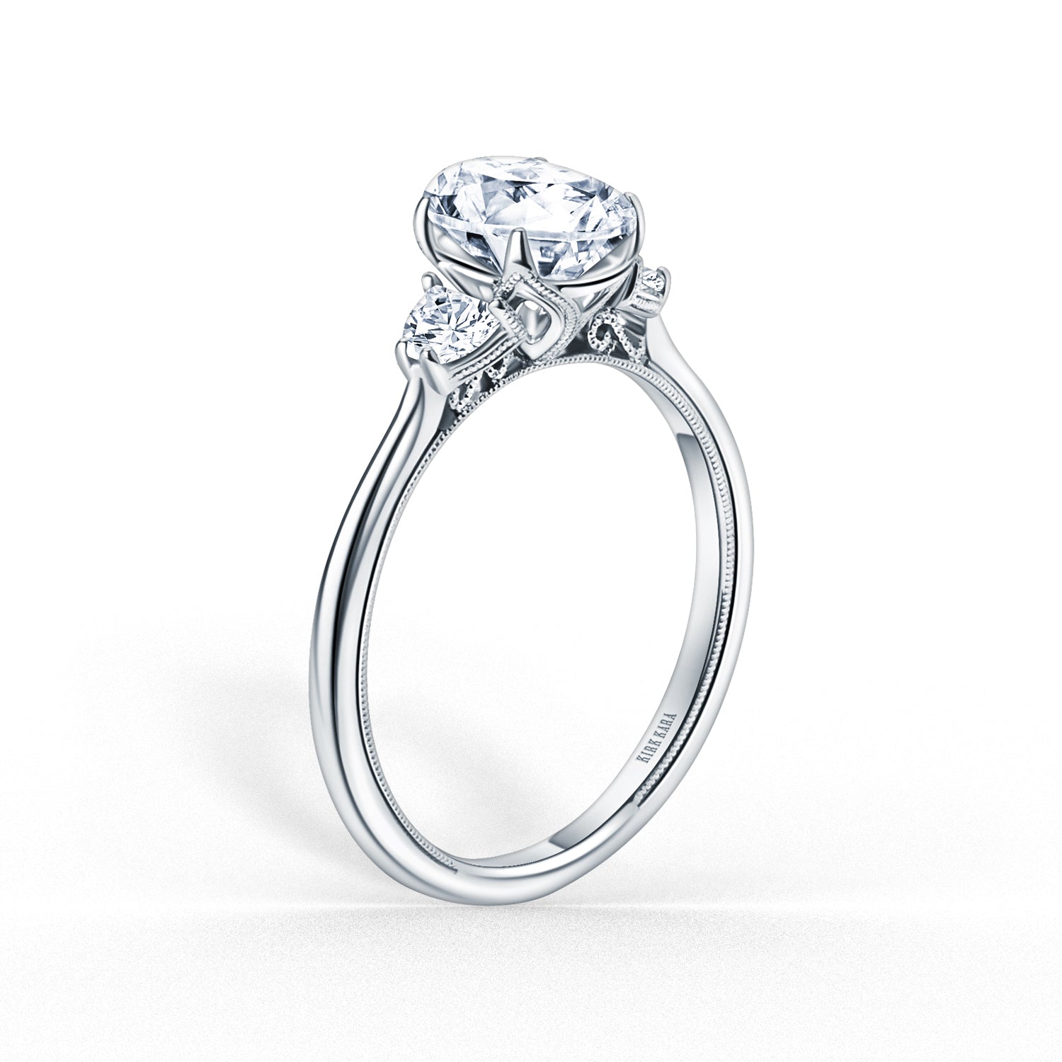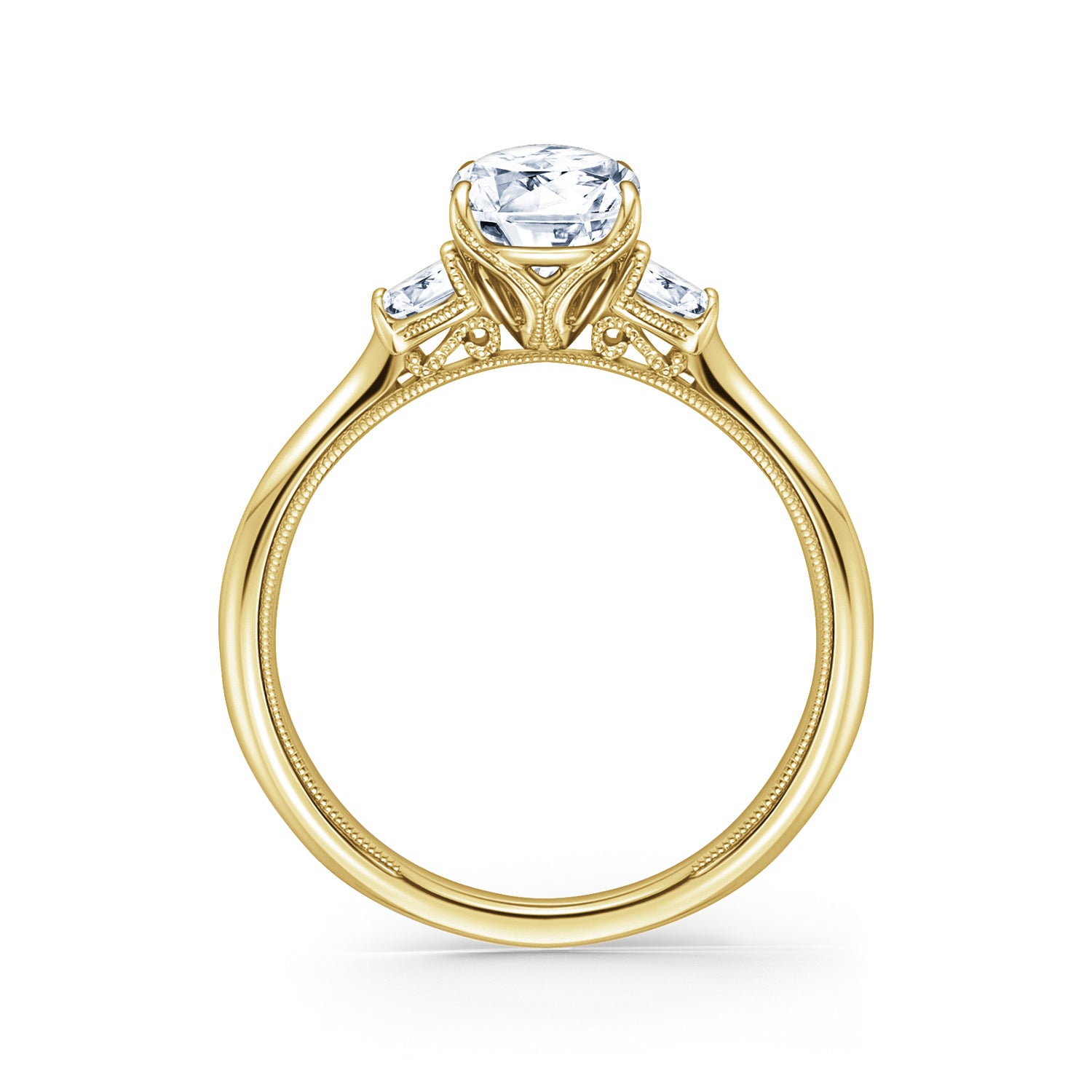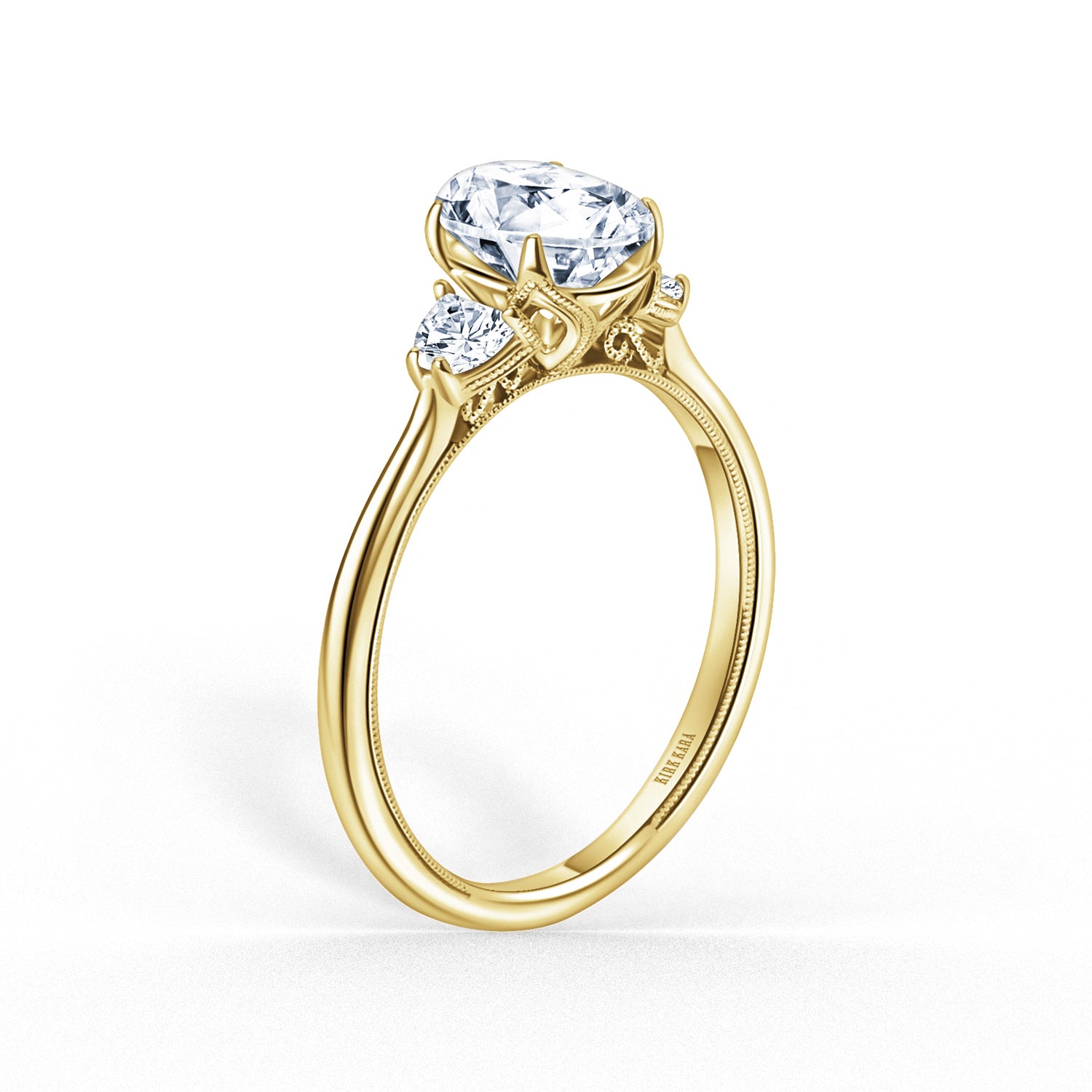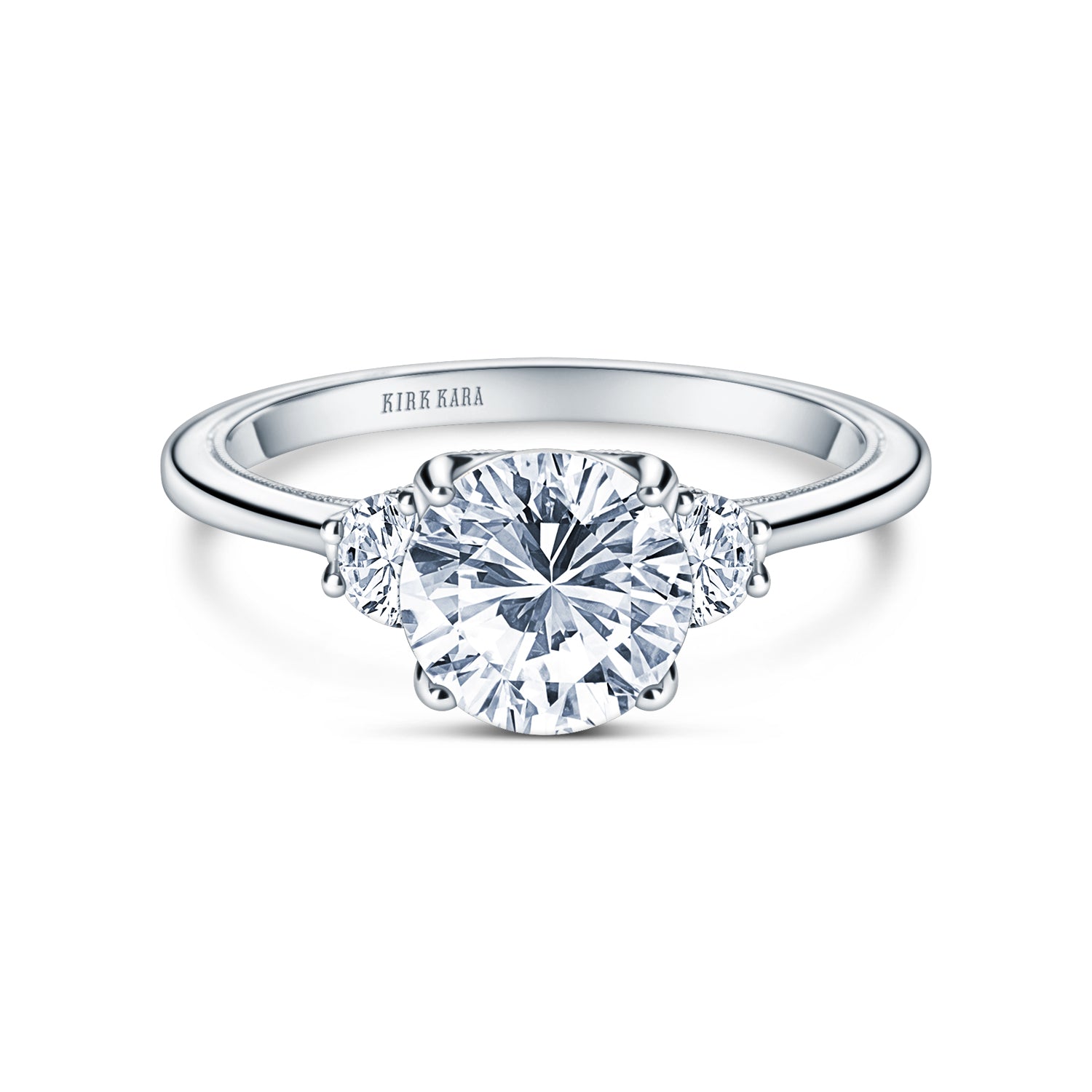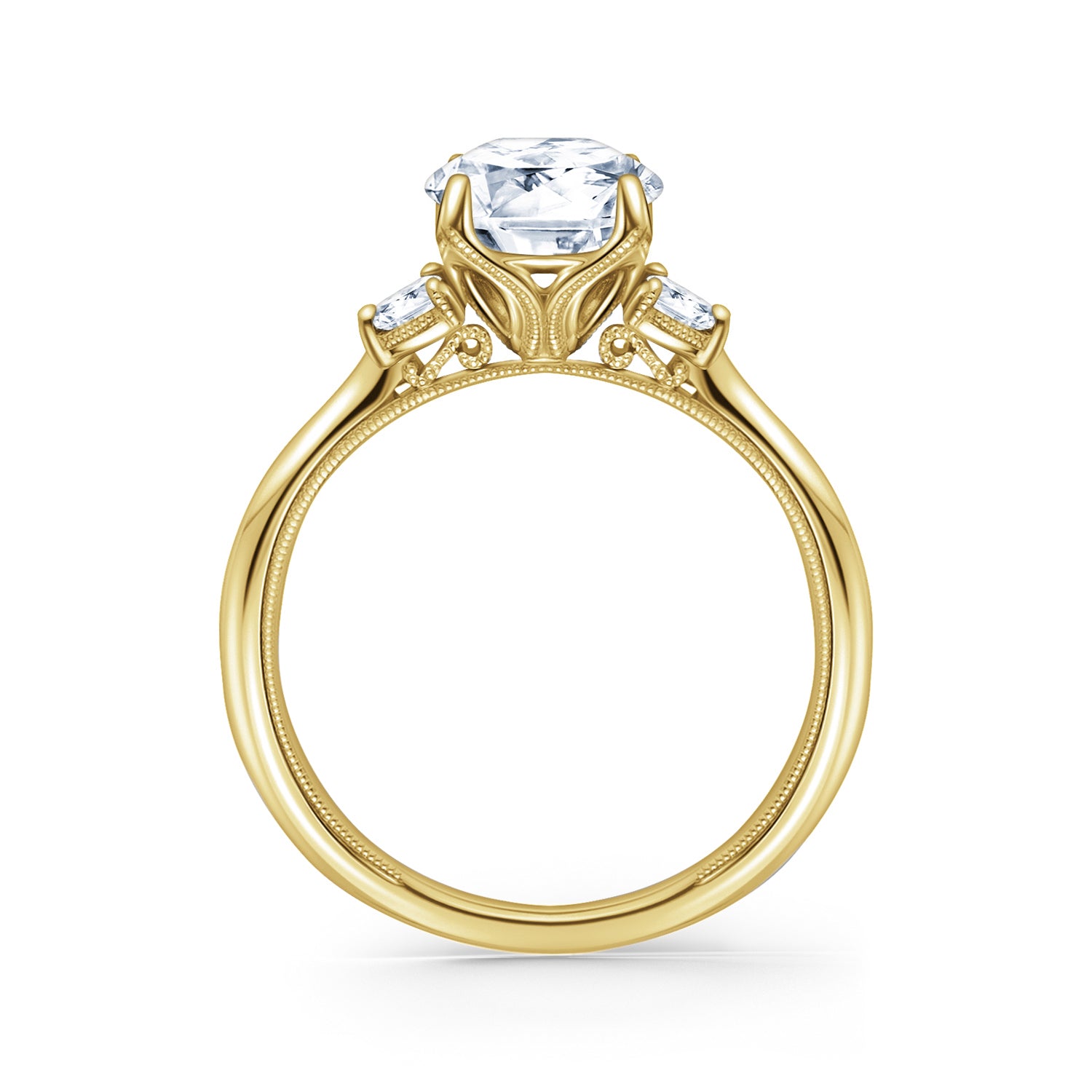 This classic three-stone ring is from the Stella collection. It features 1/4 ctw of diamonds. The signature handcrafted details include milgrain and signature filigree. Both lab grown and natural diamonds are available for this setting. All center stone sizes and shapes are possible.