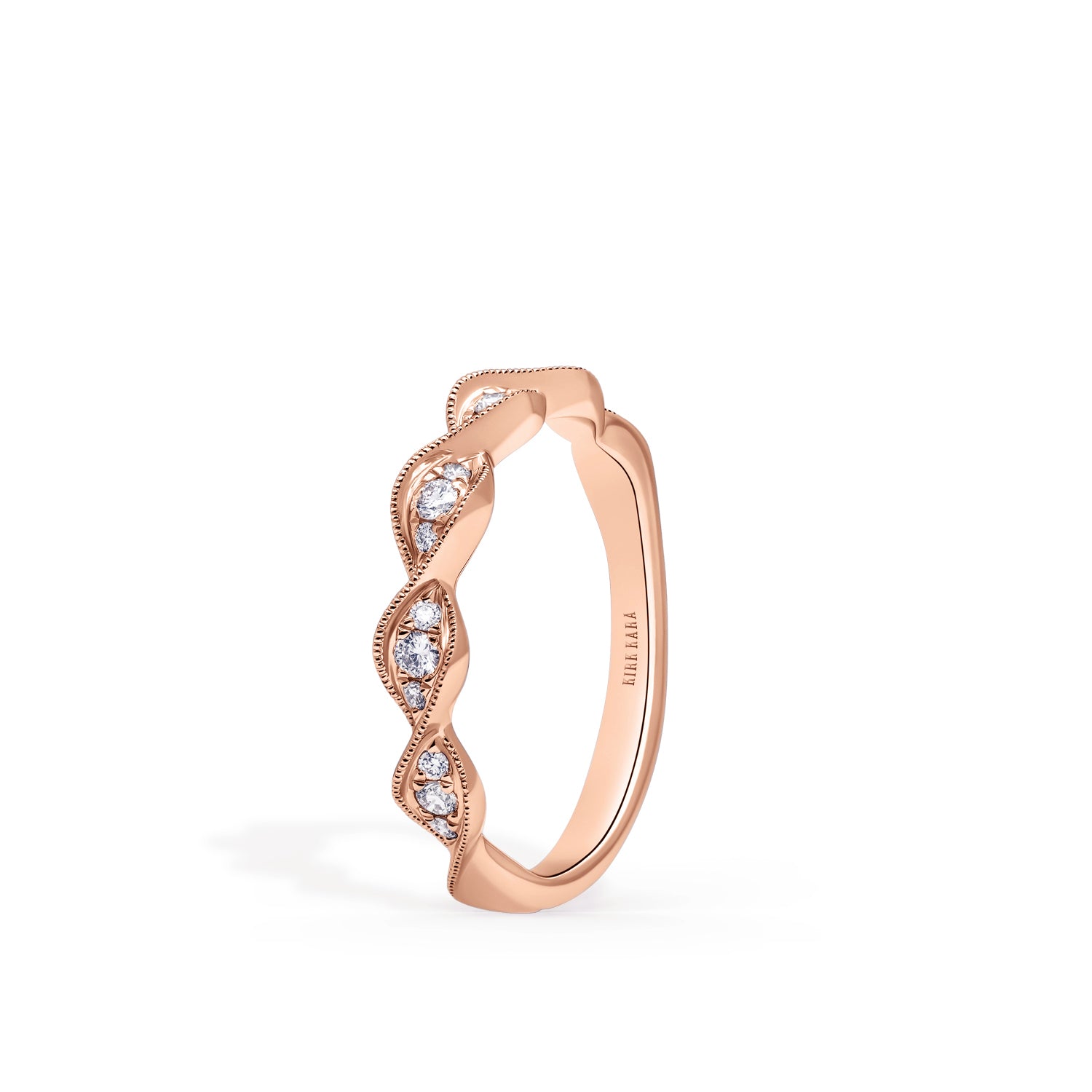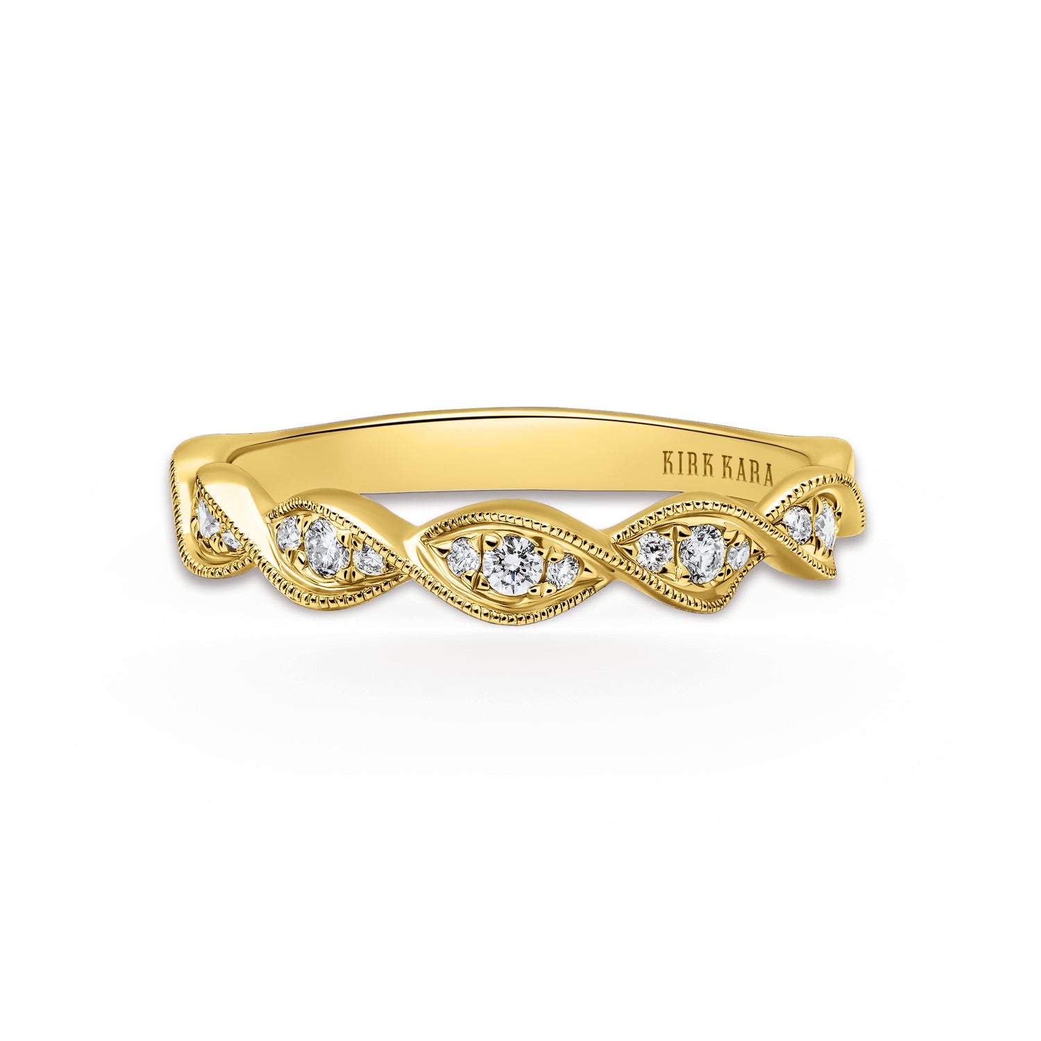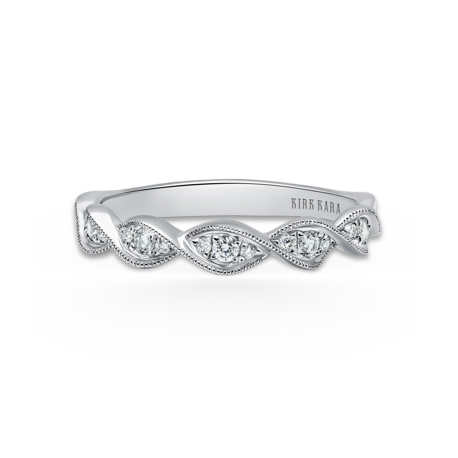 This romantic twist design is from the Pirouetta collection. It features 1/6 ctw of diamonds and signature handcrafted milgrain edging. Both lab grown and natural diamonds are available for this band.