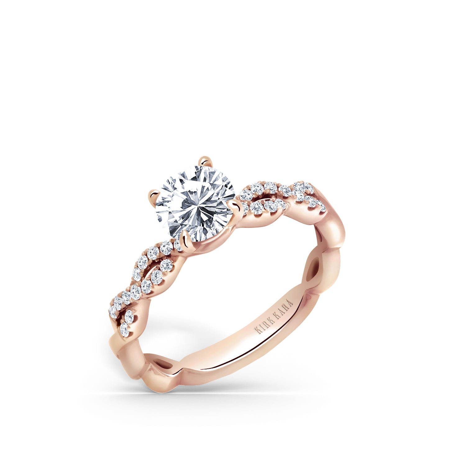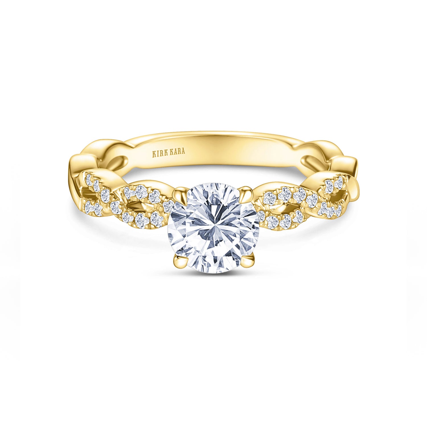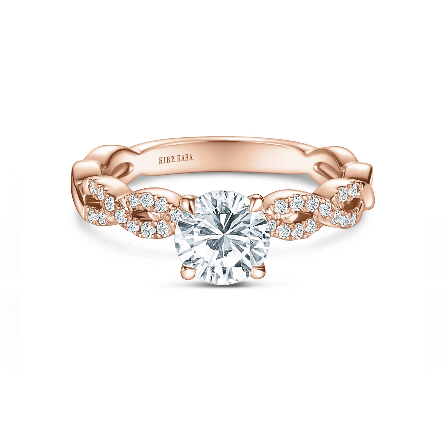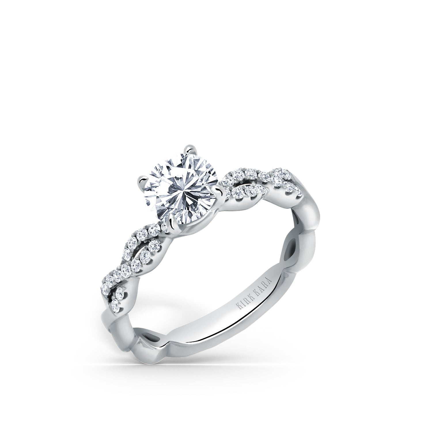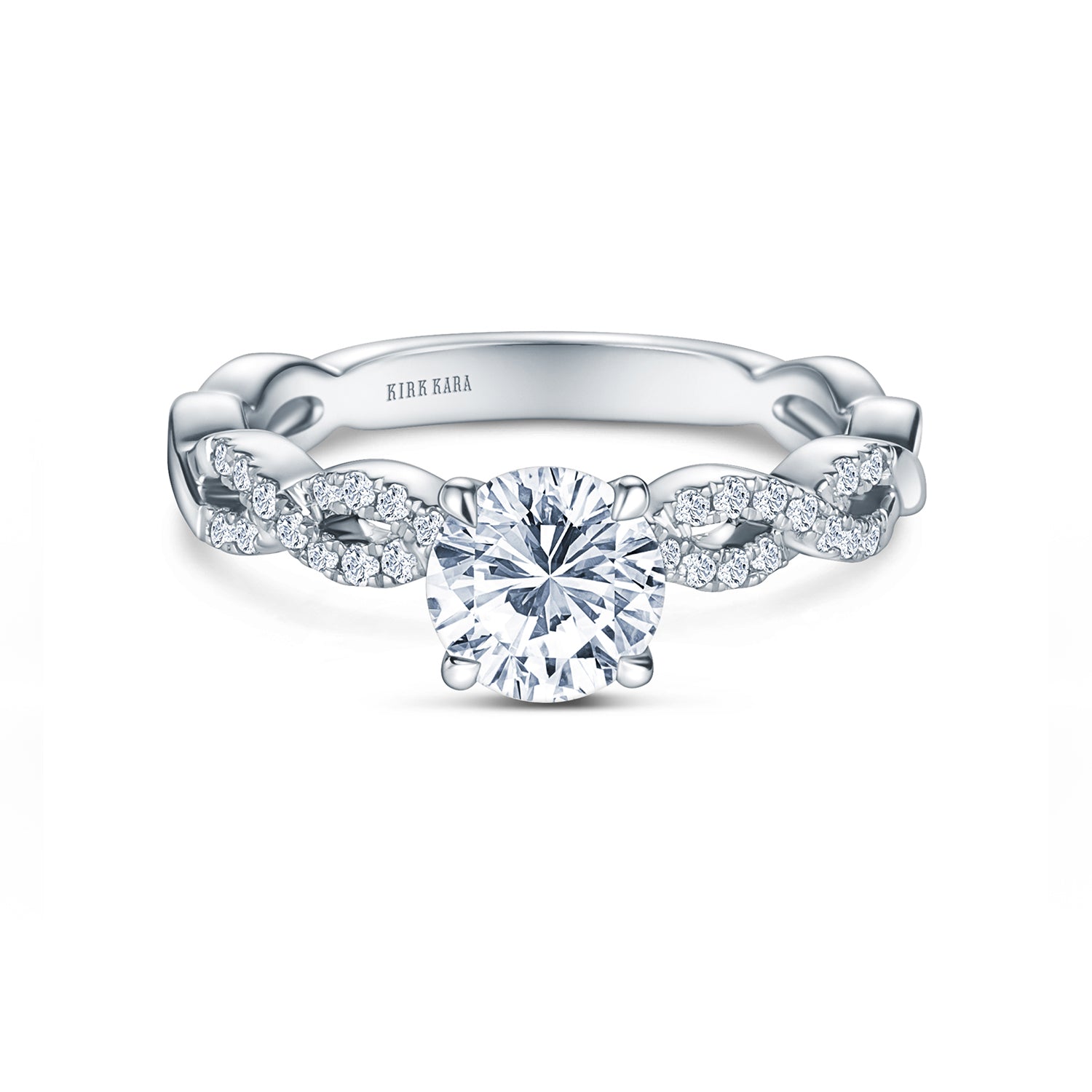 This elegant design is a twist engagement ring from the Pirouetta collection. It features 1/6 ctw of diamonds. Ring as shown fits a 1.00 carat round cut stone. Both lab grown and natural diamonds are available for this setting. All center stone sizes and shapes are possible.