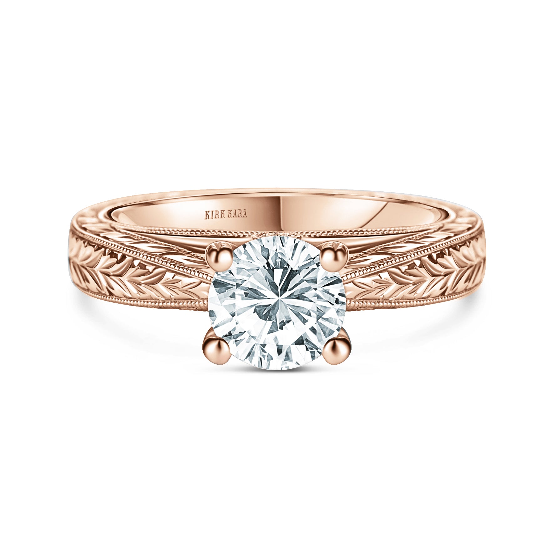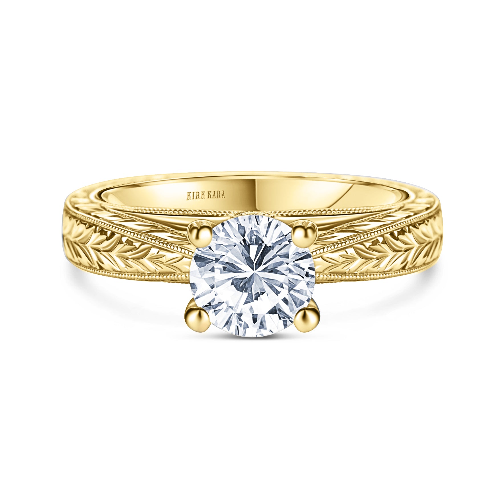 This timeless design is a tapered classic solitaire engagement ring from the Stella collection. It features 0.02 ctw of diamonds. The signature handcrafted details include wheat hand engravings, peek-a-boo diamonds and milgrain edging. Both lab grown and natural diamonds are available for this setting. Ring as shown fits a 1.00 carat round cut stone. All center stone sizes and shapes are possible.