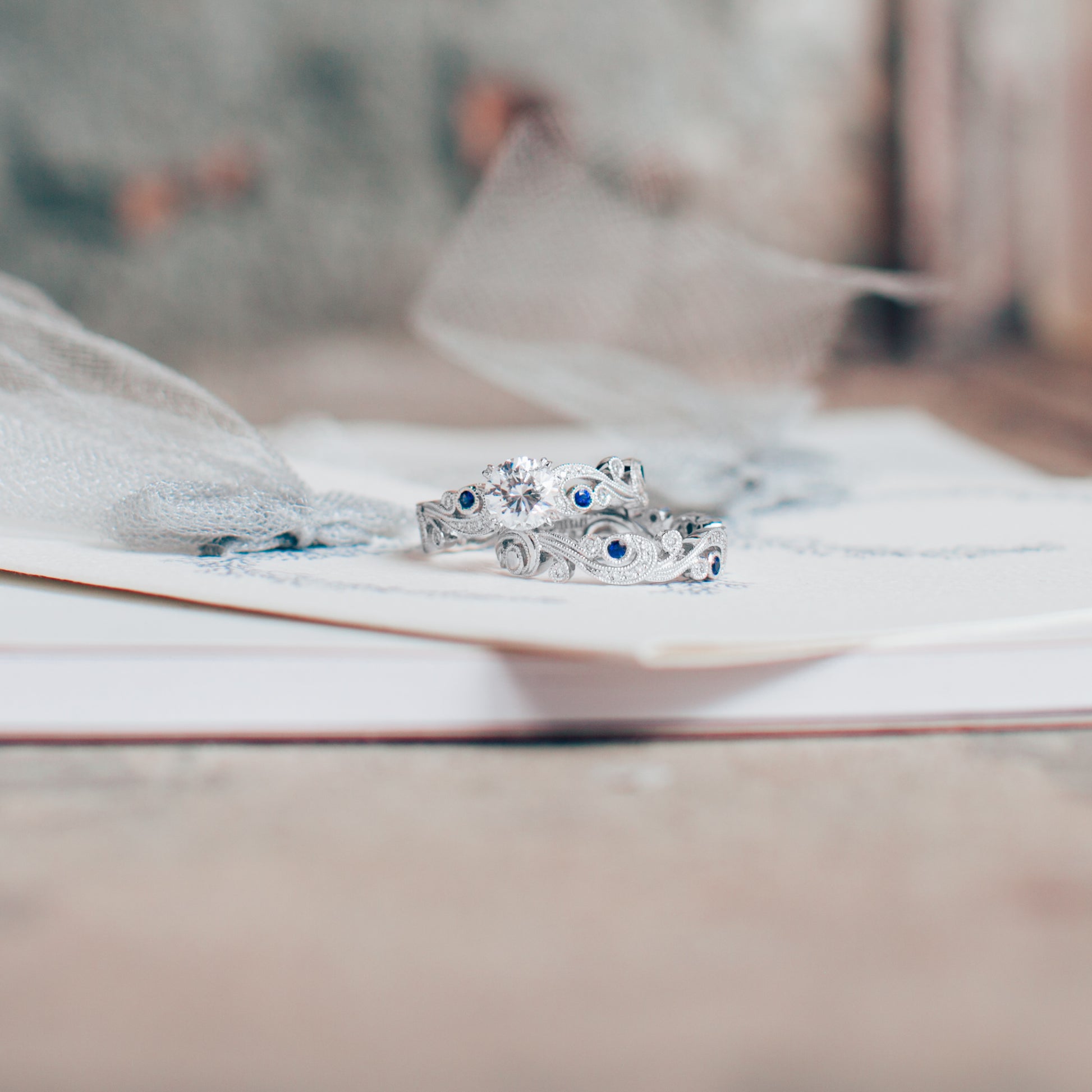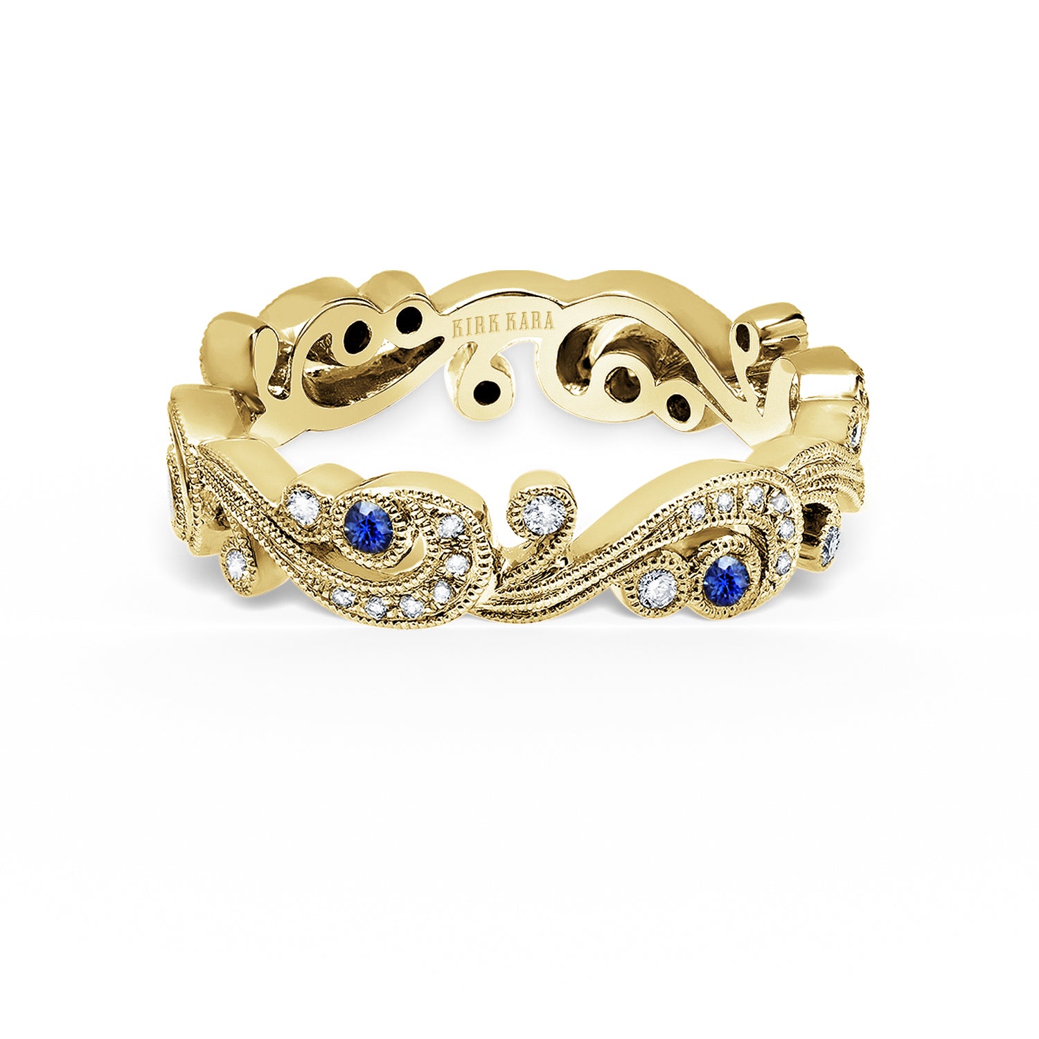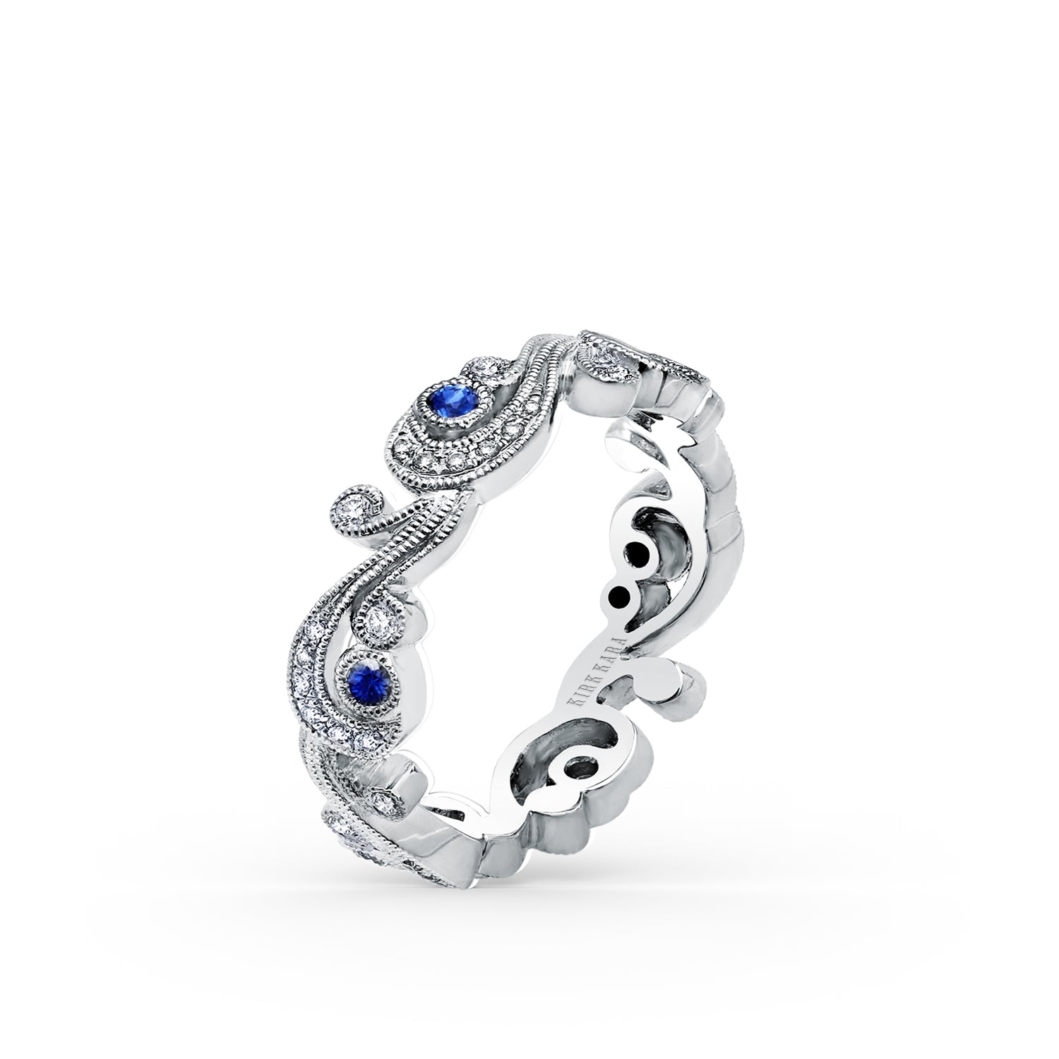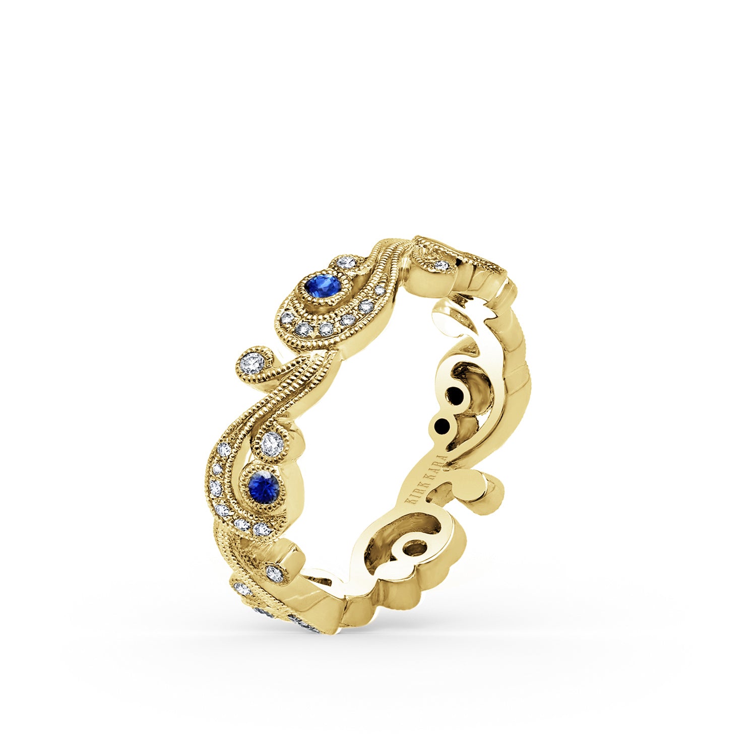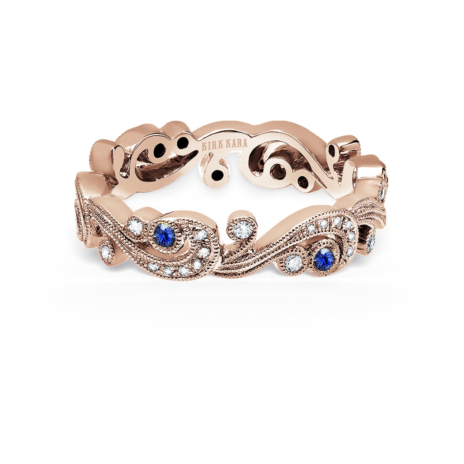 Whimsical Swirl Milgrain Blue Sapphire Diamond Wedding Band