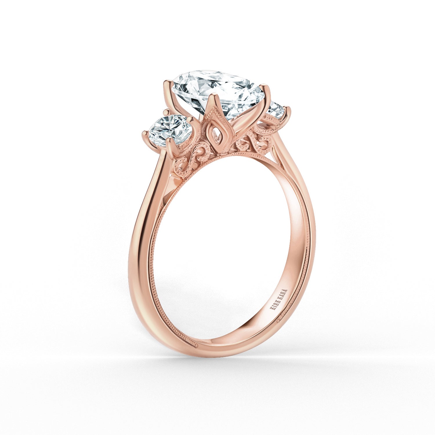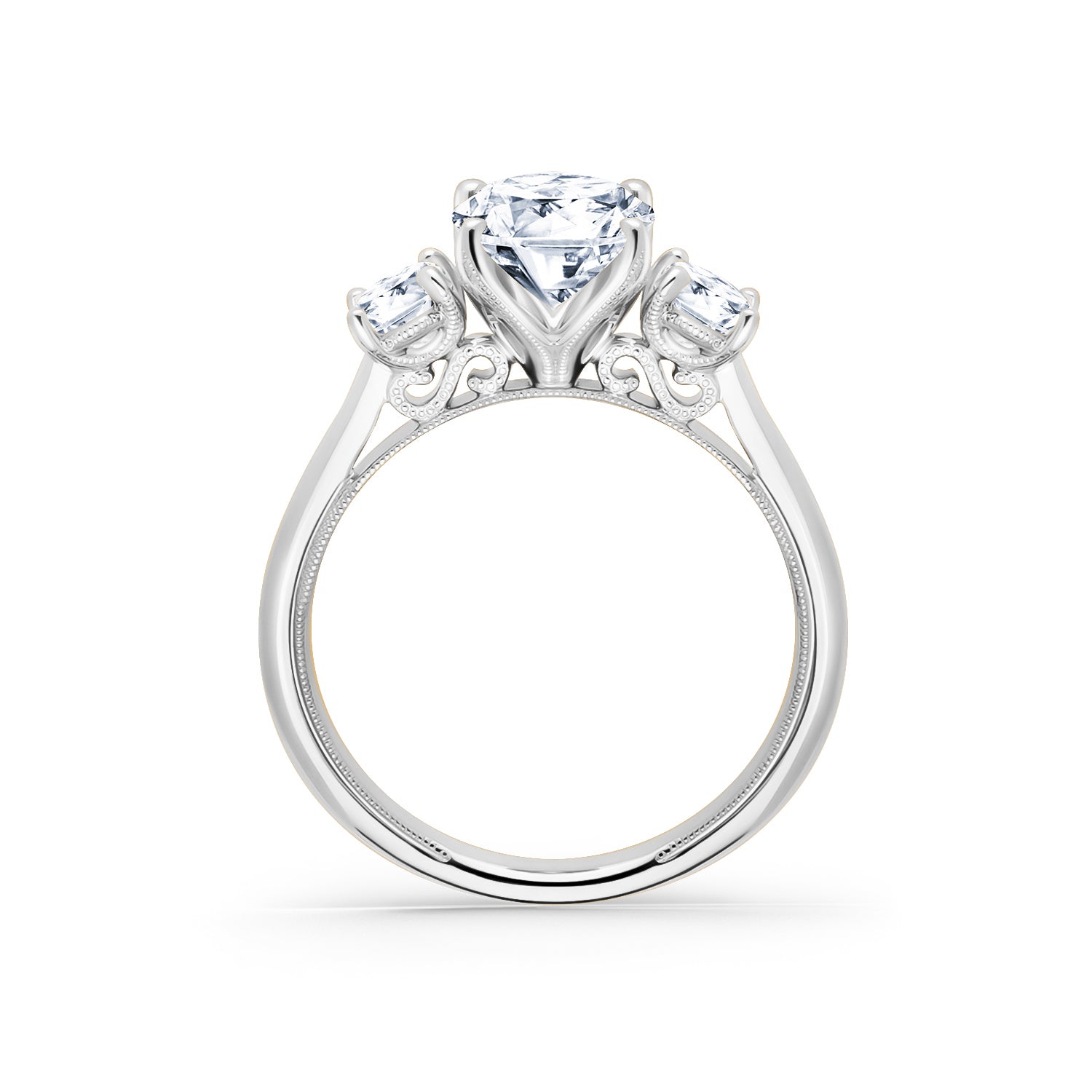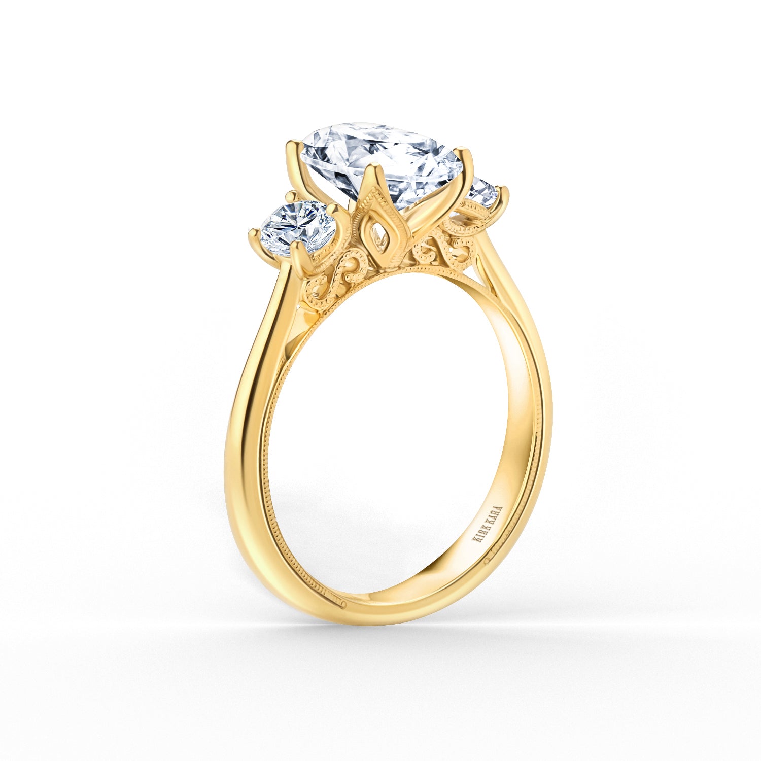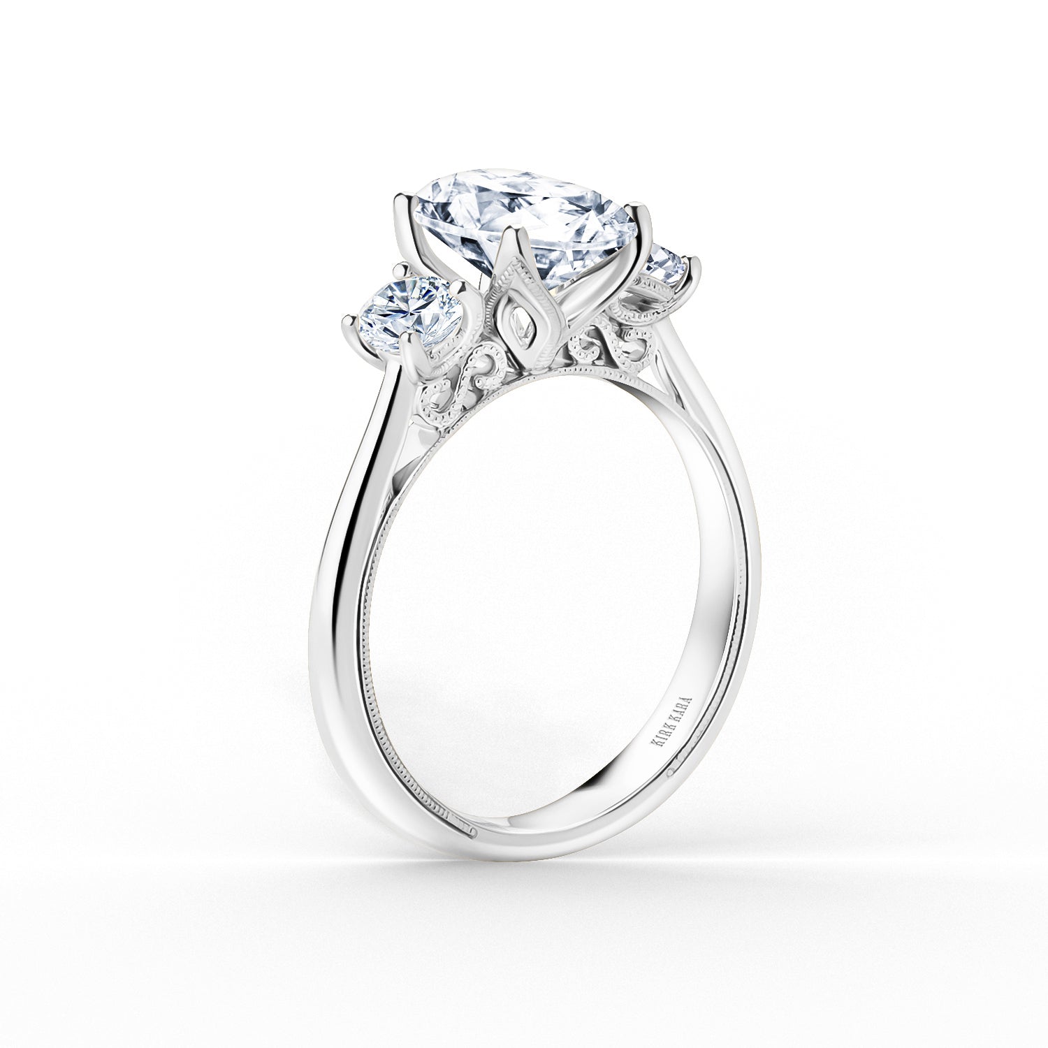 This classic three-stone ring is from the Stella collection. It features 3/8 ctw of diamonds. The signature handcrafted details include milgrain and signature filigree. Both lab grown and natural diamonds are available for this setting. Ring as shown fits a 2.25 carat oval cut stone. All center stone sizes and shapes are possible.