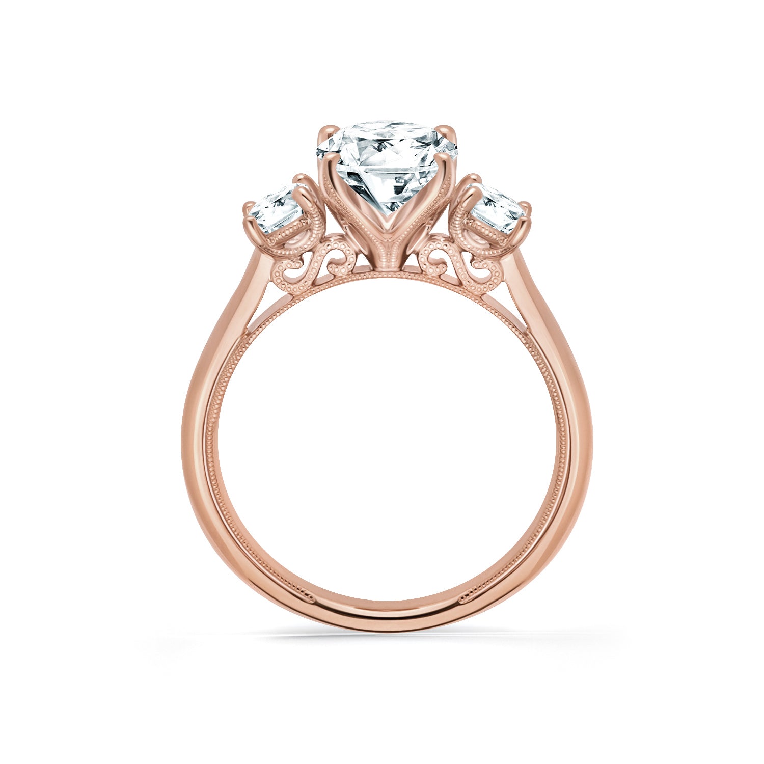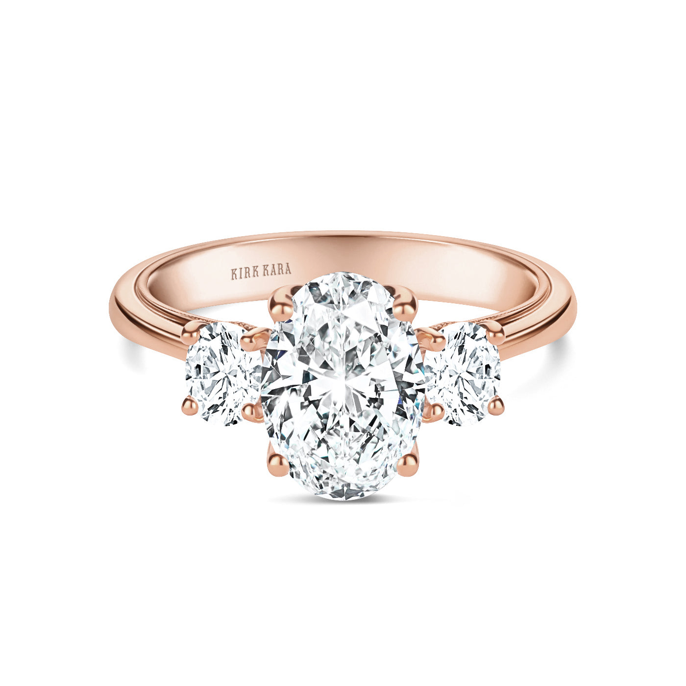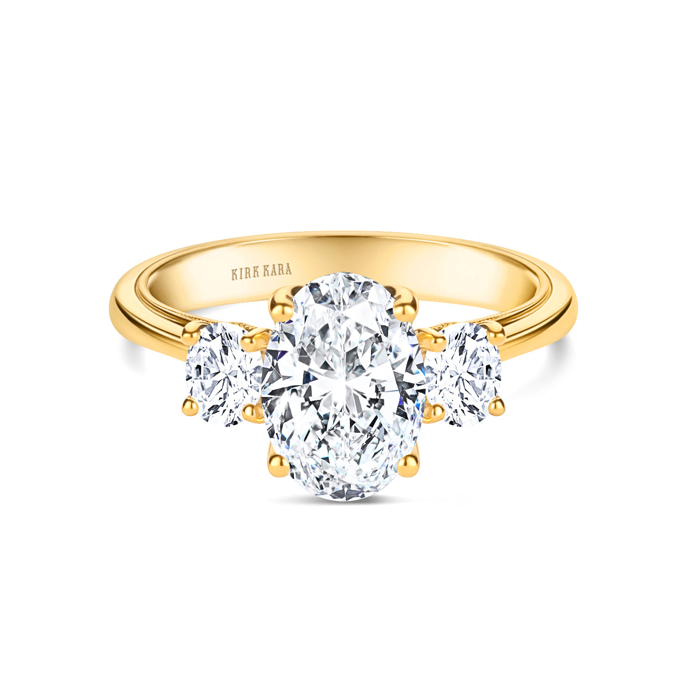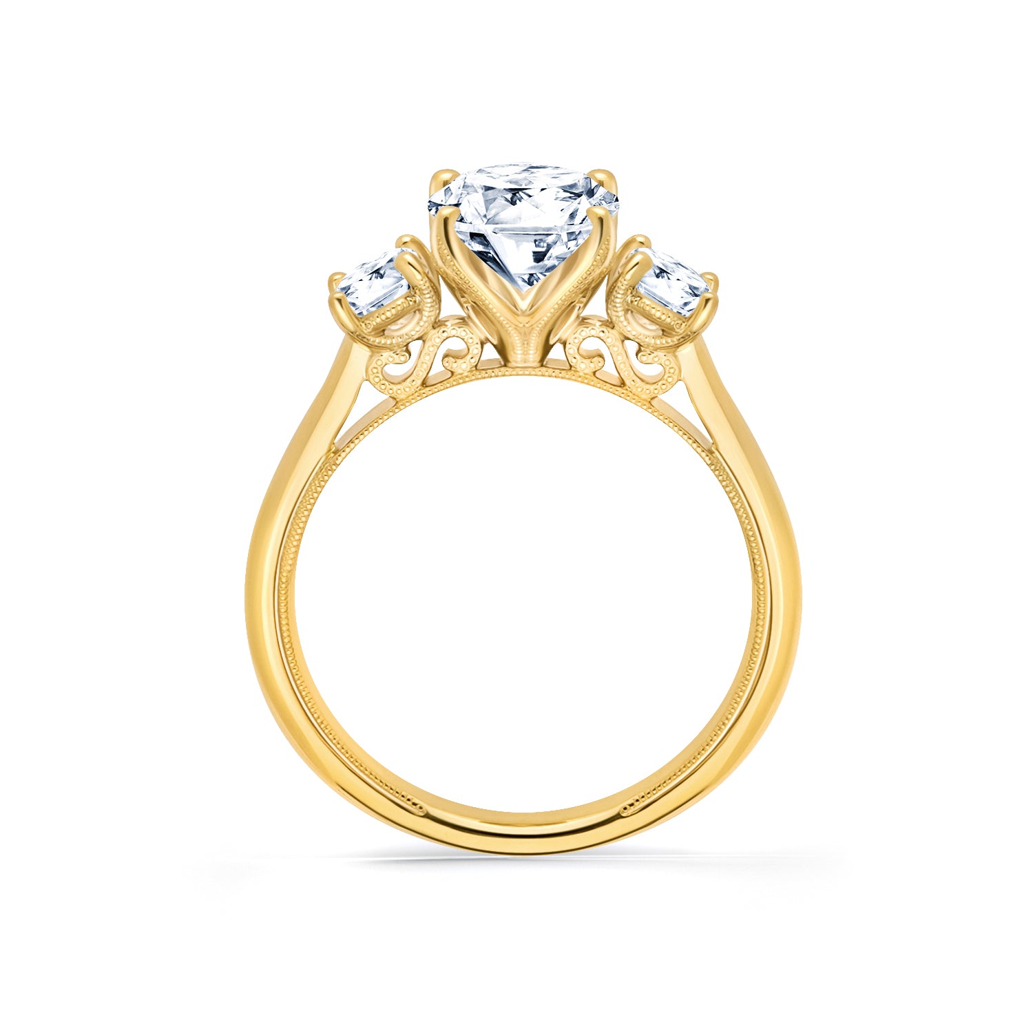 This classic three-stone ring is from the Stella collection. It features 3/8 ctw of diamonds. The signature handcrafted details include milgrain and signature filigree. Both lab grown and natural diamonds are available for this setting. Ring as shown fits a 2.25 carat oval cut stone. All center stone sizes and shapes are possible.