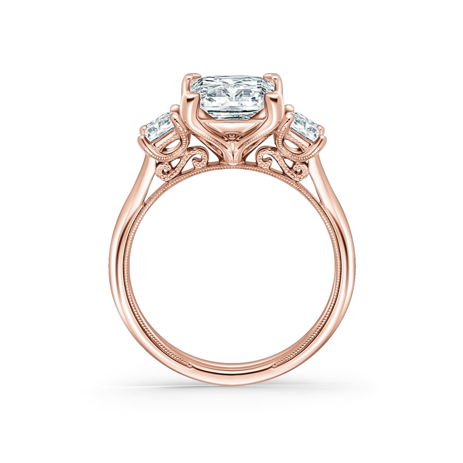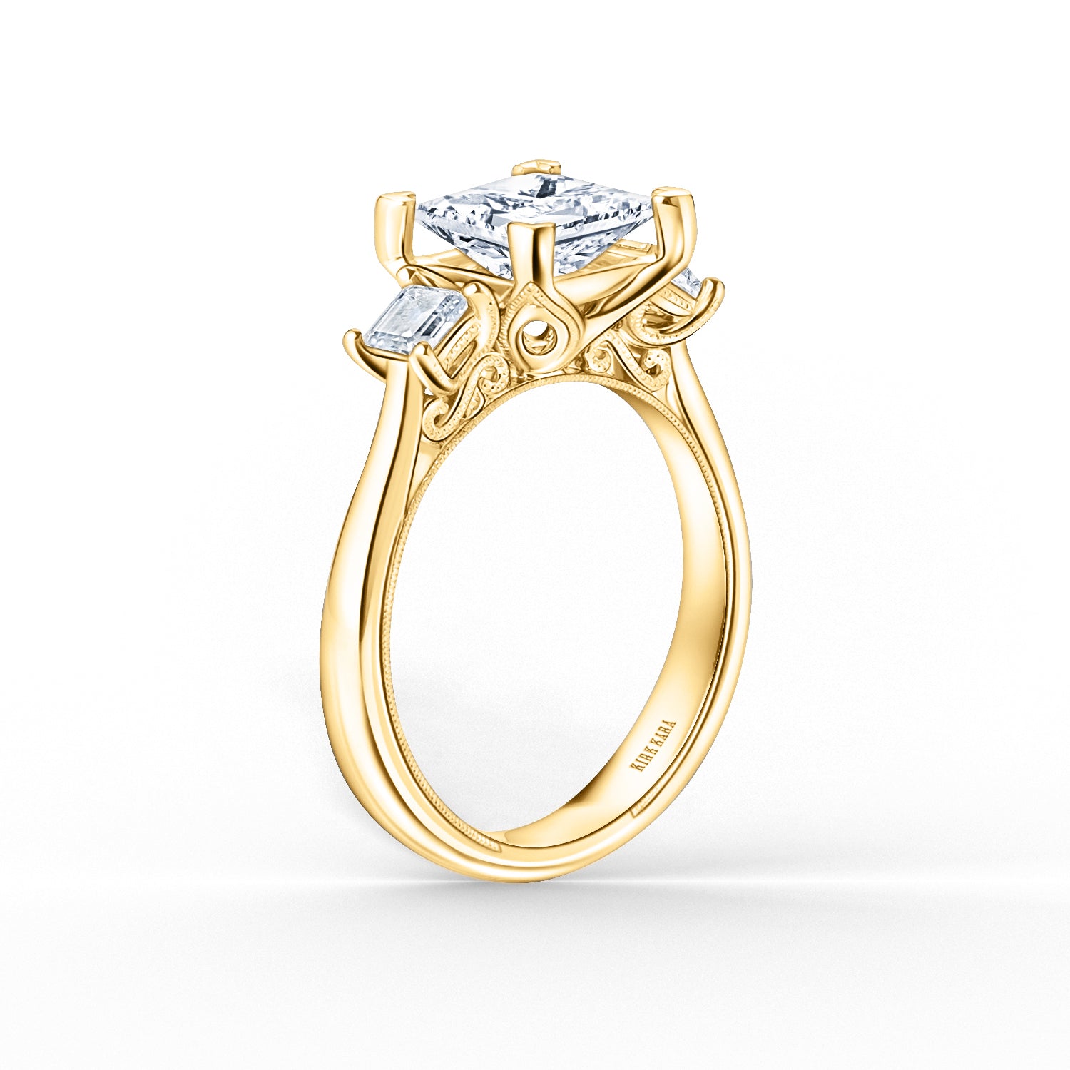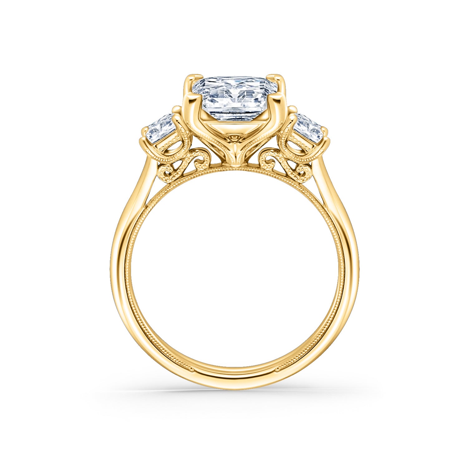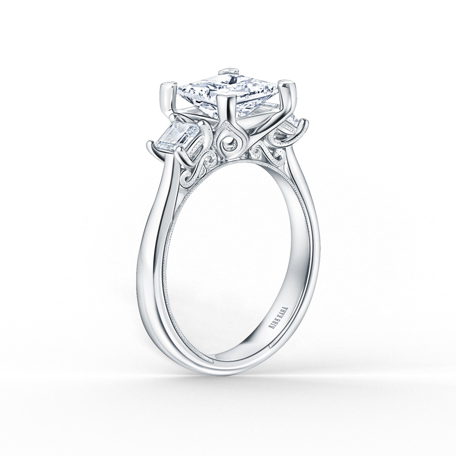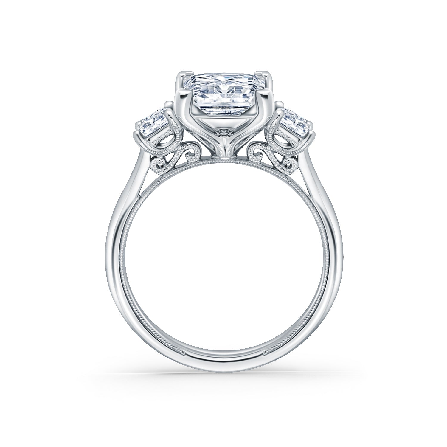 This classic three-stone ring is from the Stella collection. It features 3/4 ctw of diamonds. The signature handcrafted details include milgrain and signature filigree. Both lab grown and natural diamonds are available for this setting. Ring as shown in main image fits a 1.75 carat princess cut stone. All center stone sizes and shapes are possible.